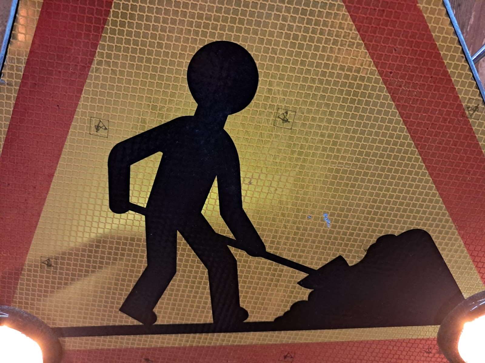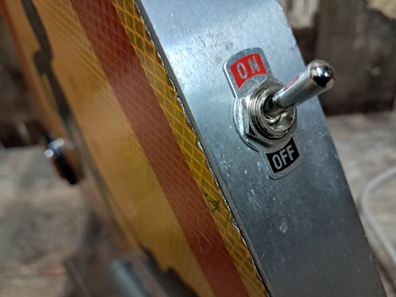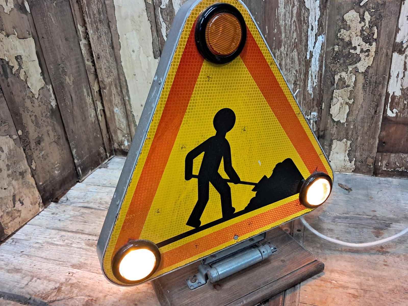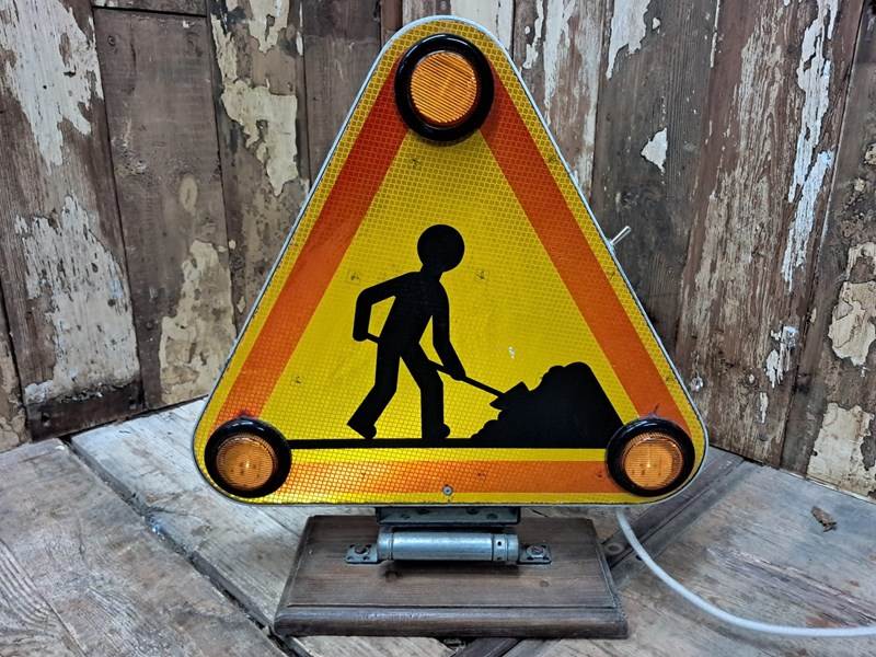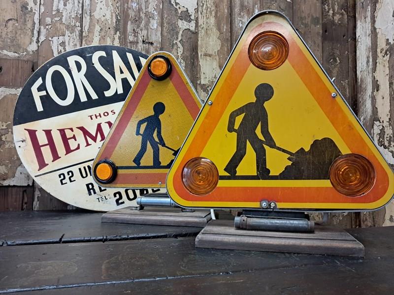 A pair of original 1970s French ‘Men at Work’ flashing road signs.