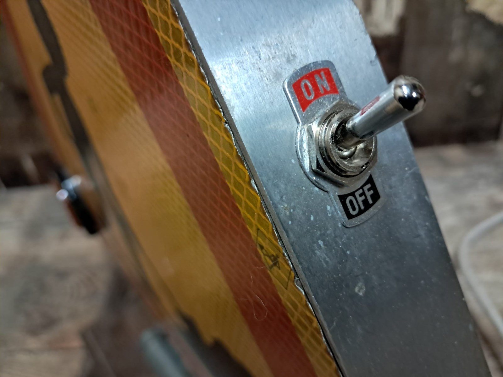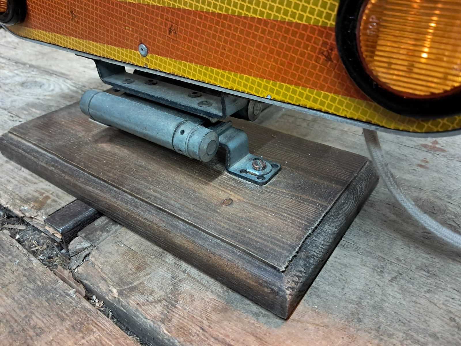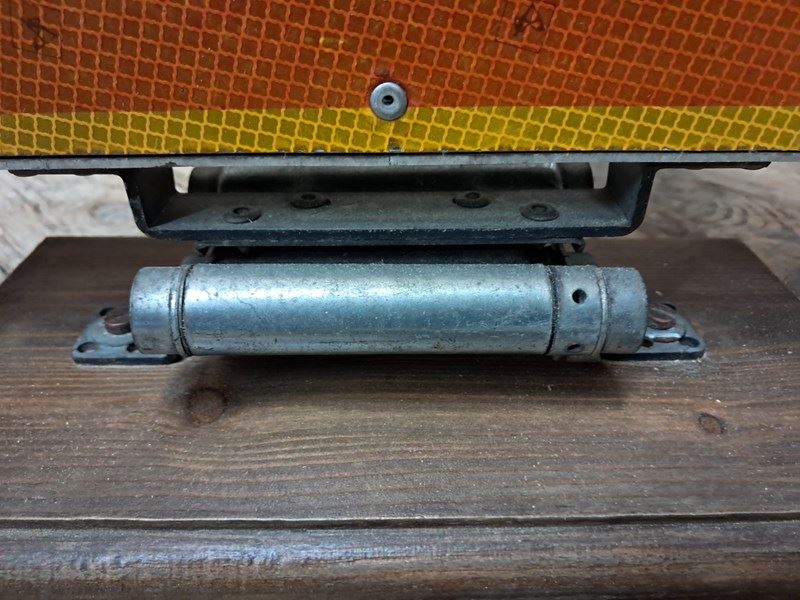 Both are mounted onto a pine base, and have reverse swing bar hinges so the sign pops back up after being knocked over.
