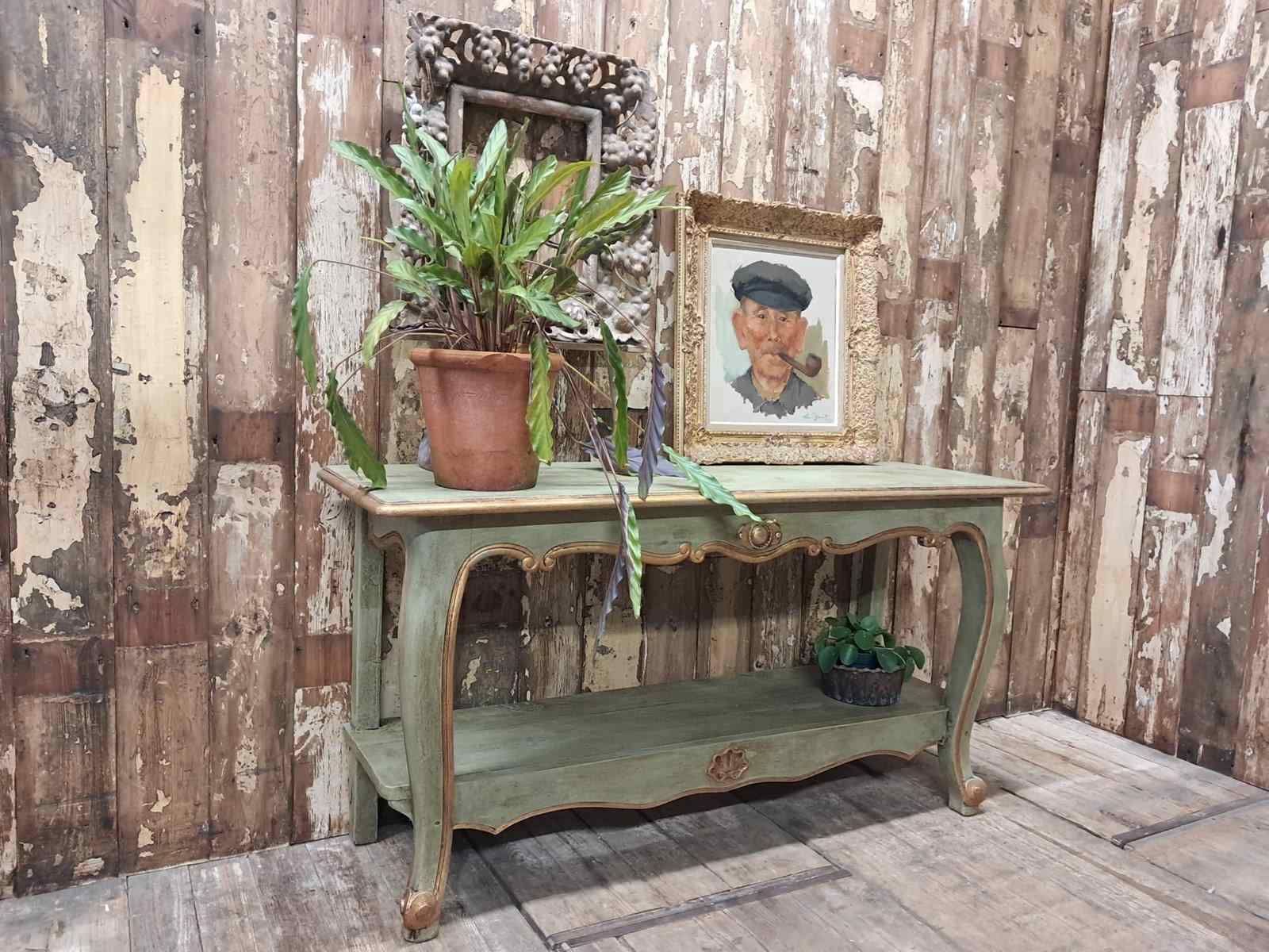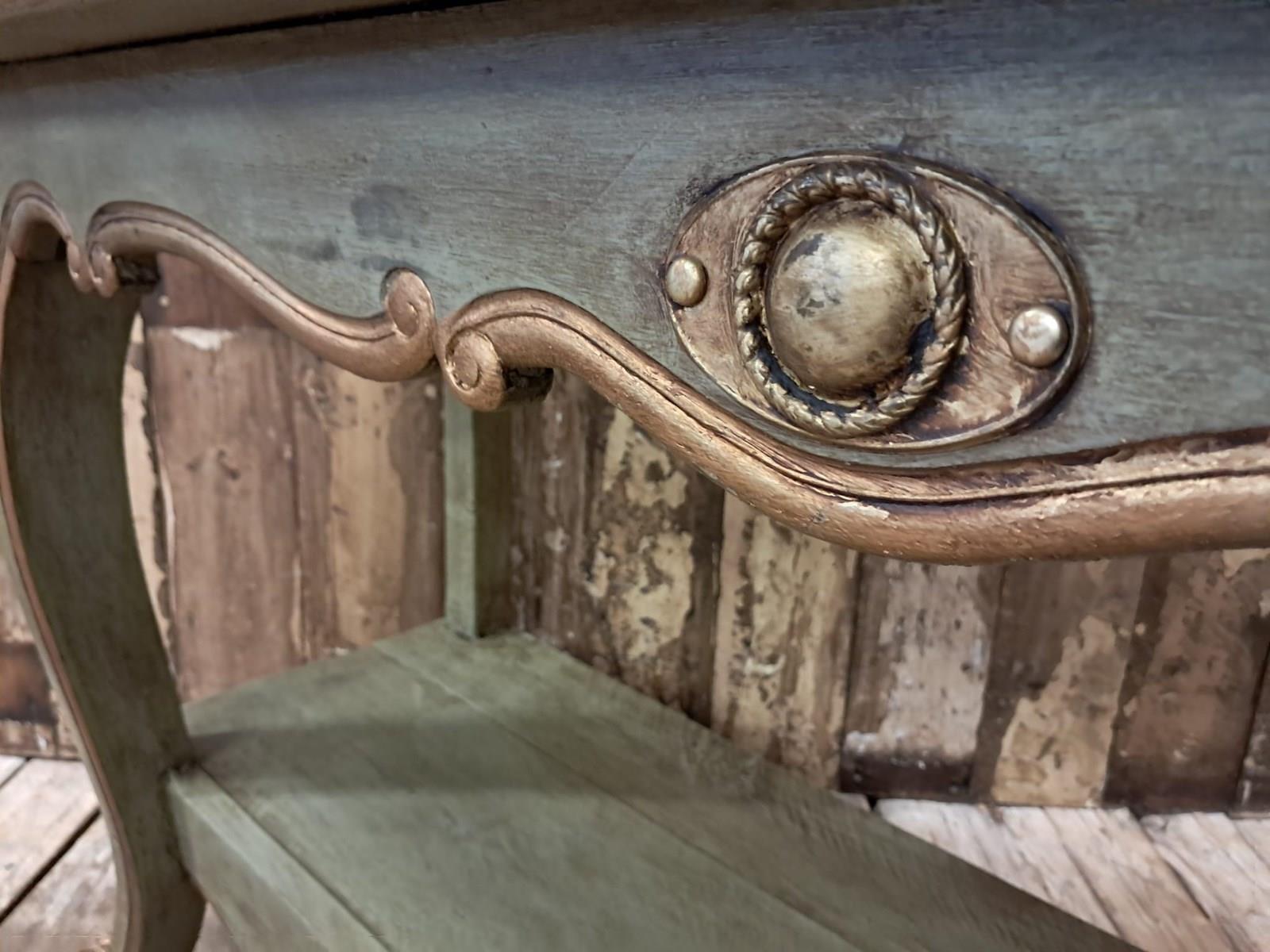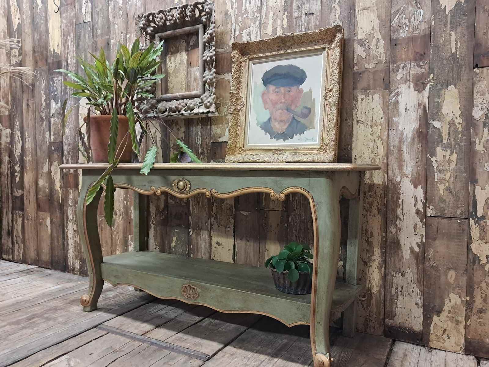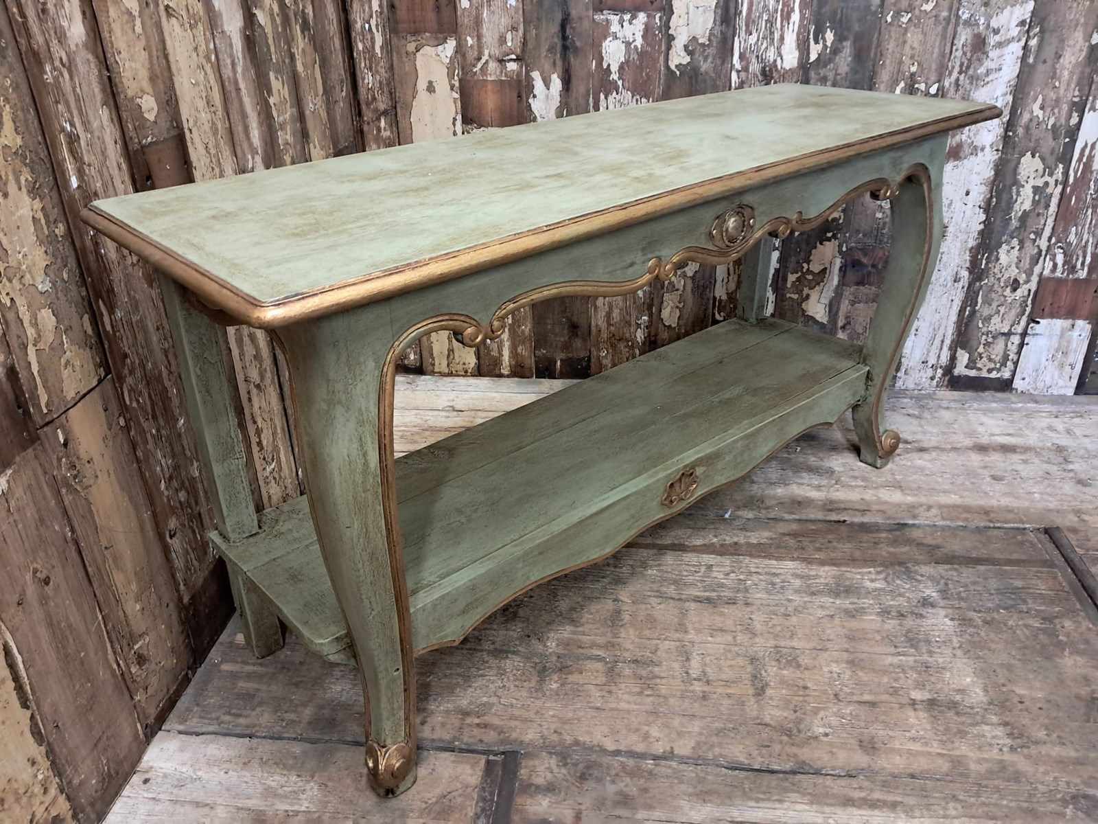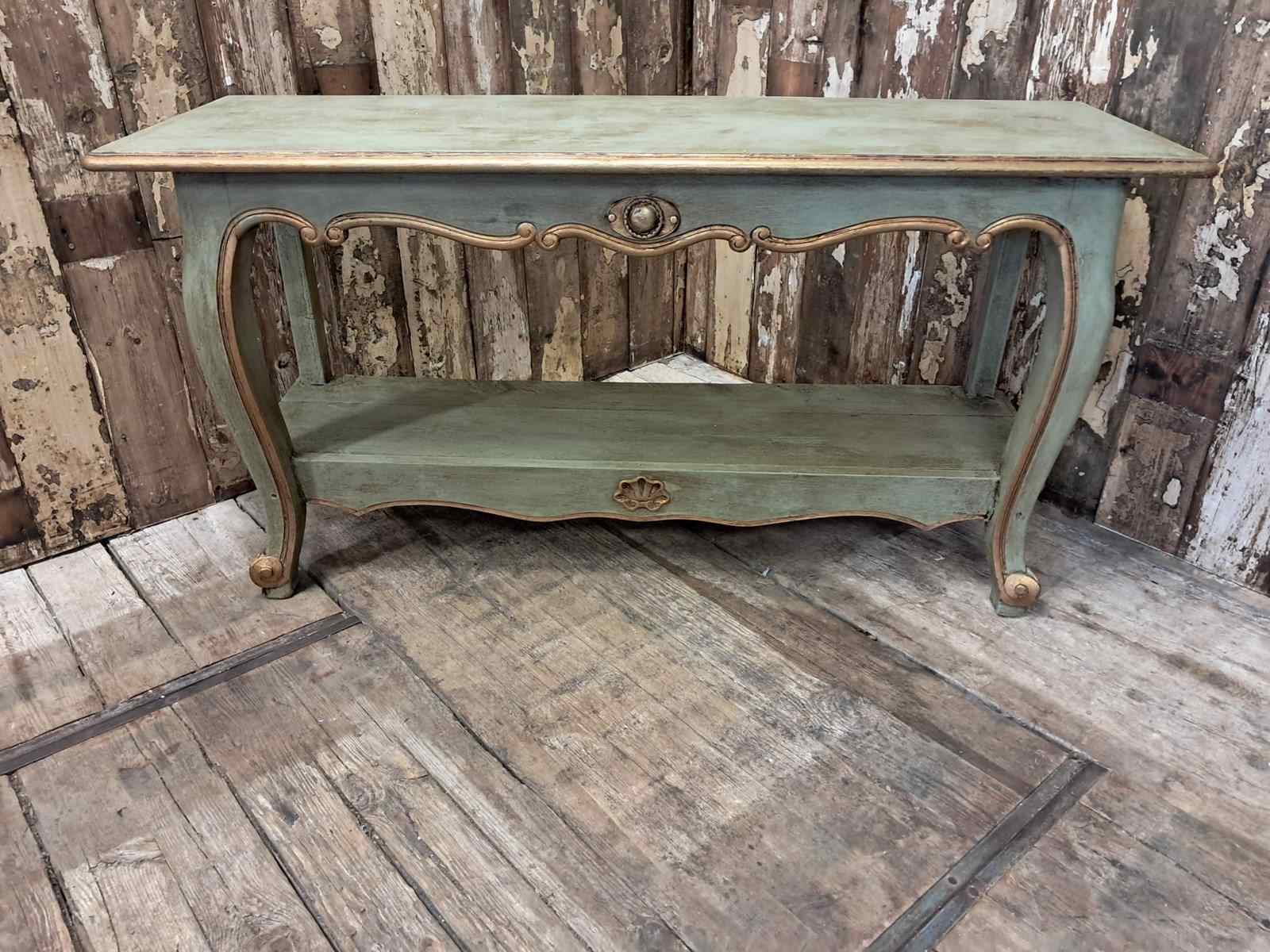 Painted in a muted green with gold detailing, this is a lovely sturdy piece ideal for hallway or any room in the house.