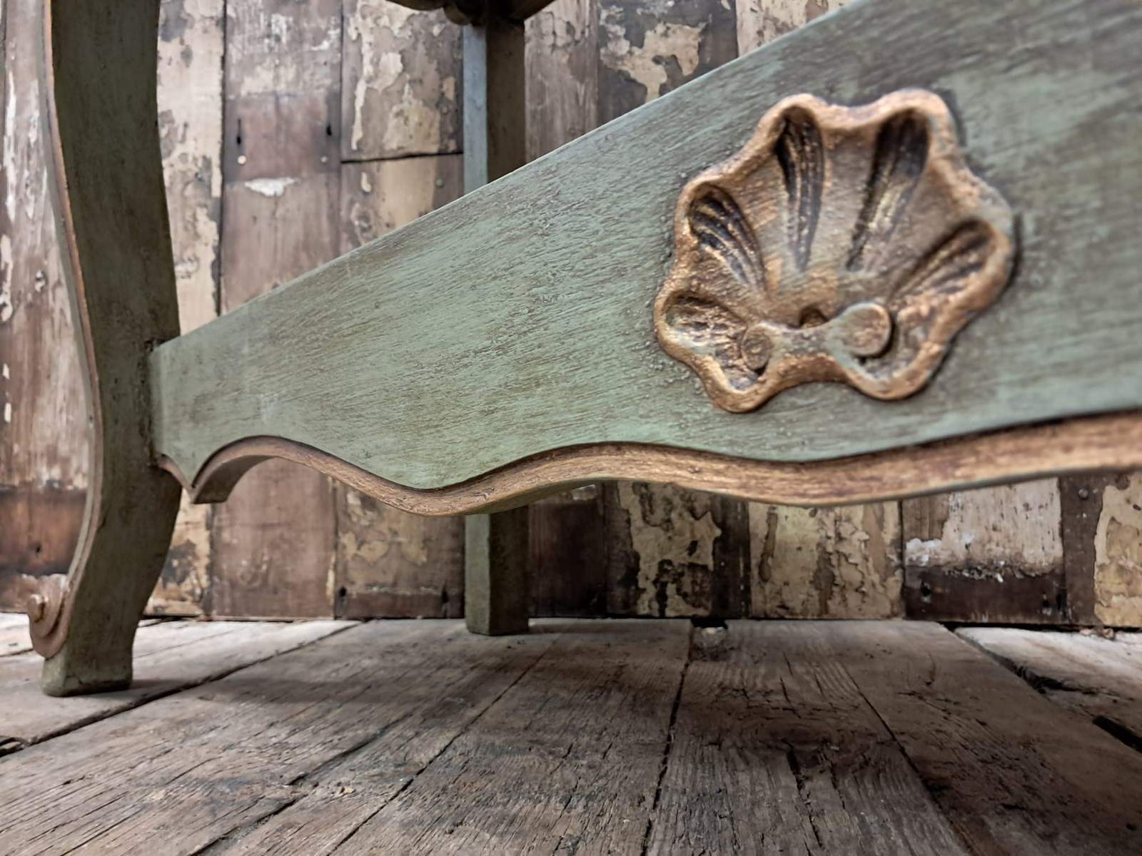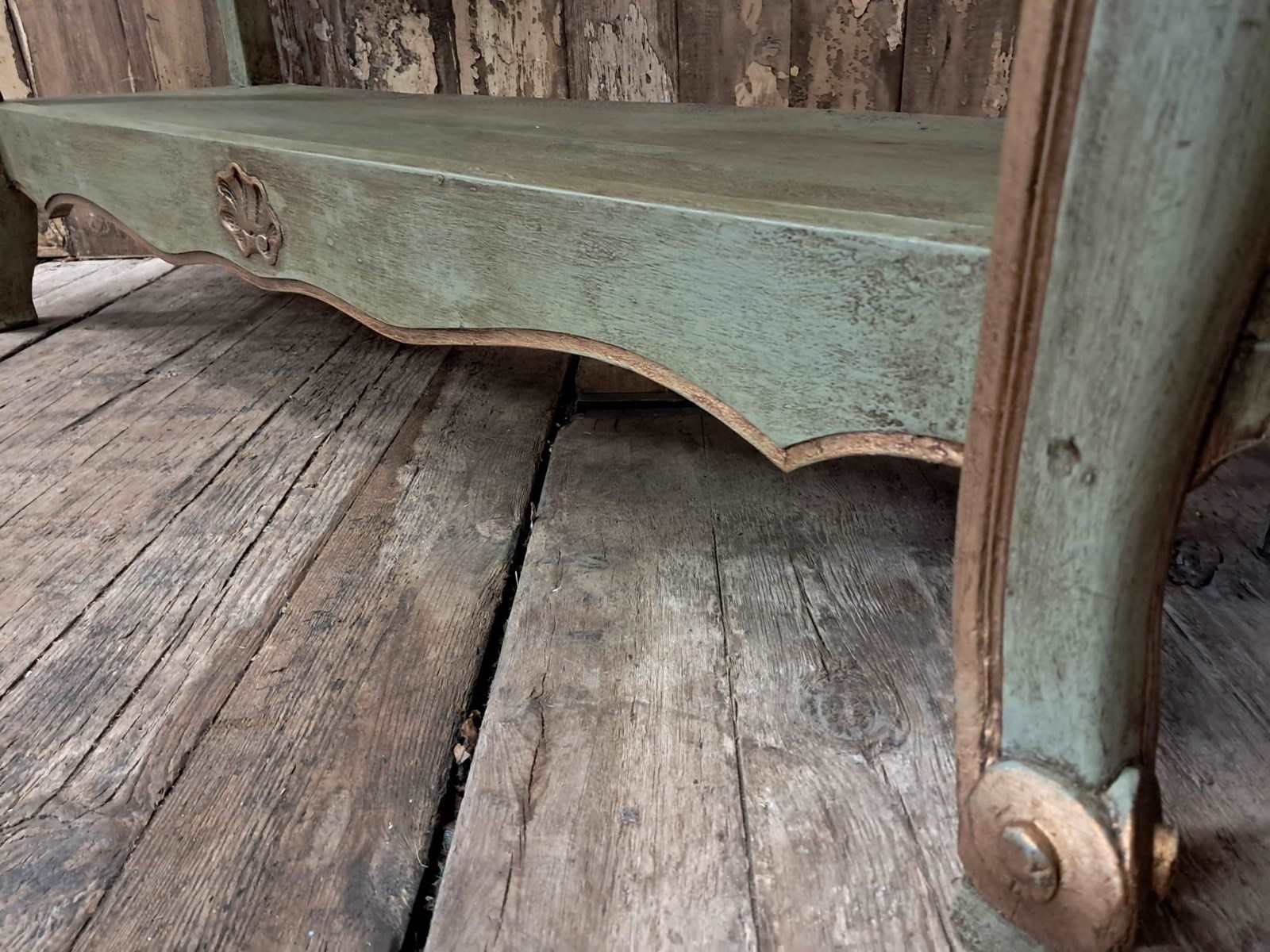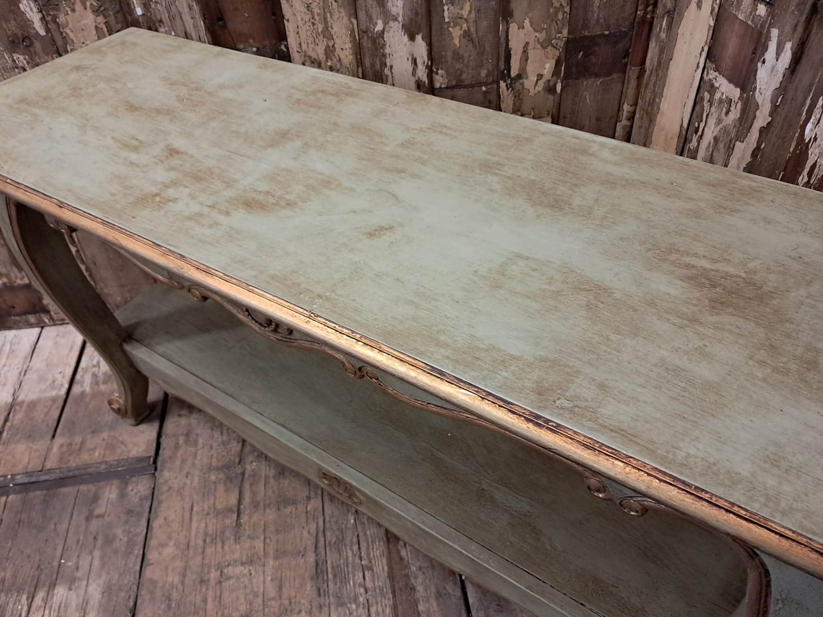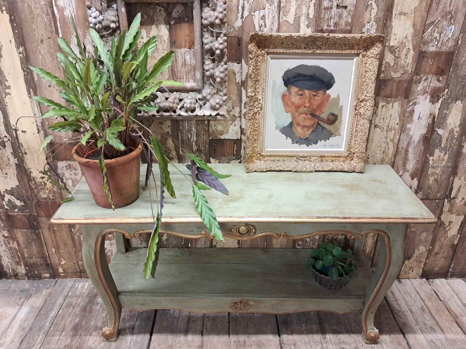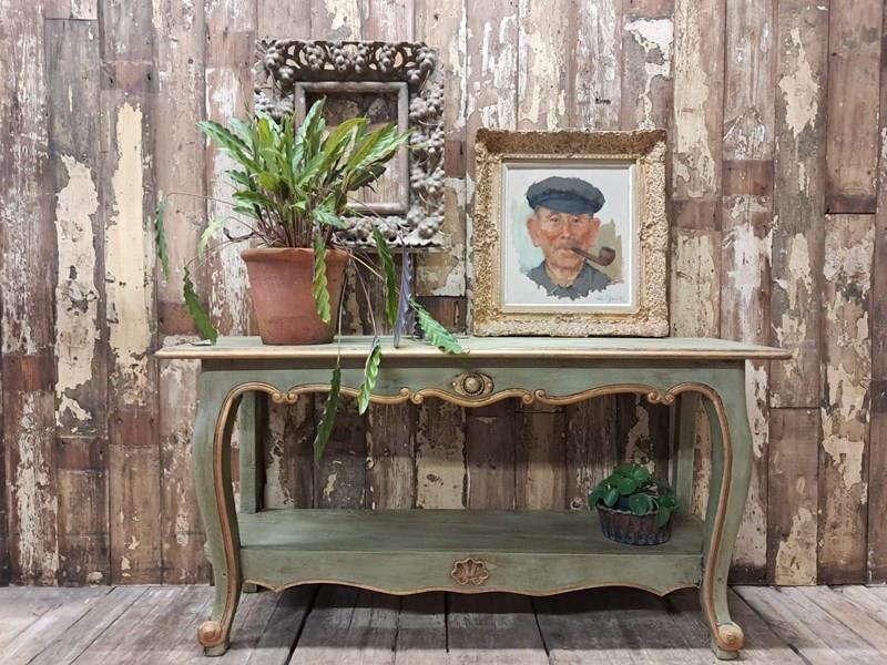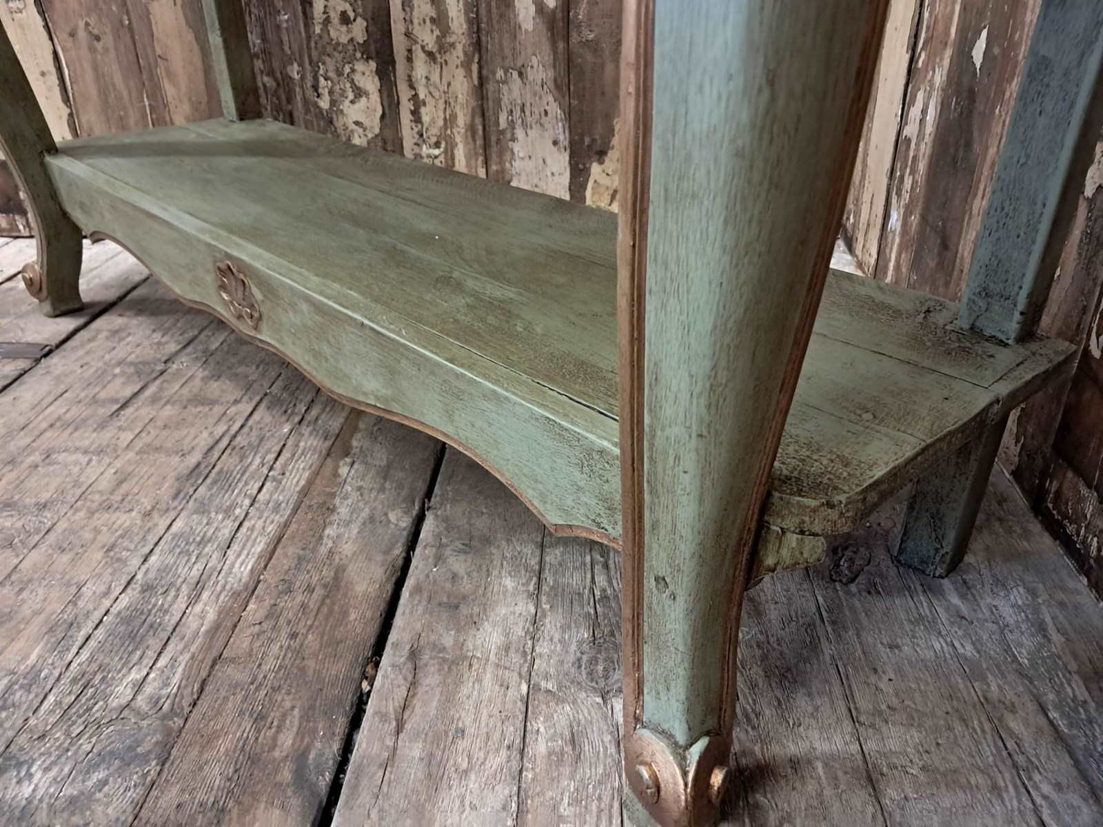 Painted in a muted green with gold detailing, this is a lovely sturdy piece ideal for hallway or any room in the house.
