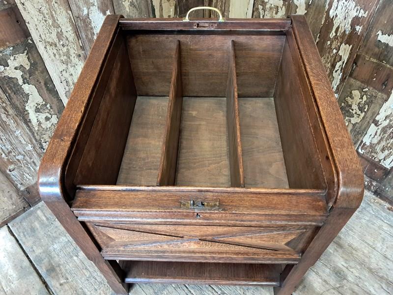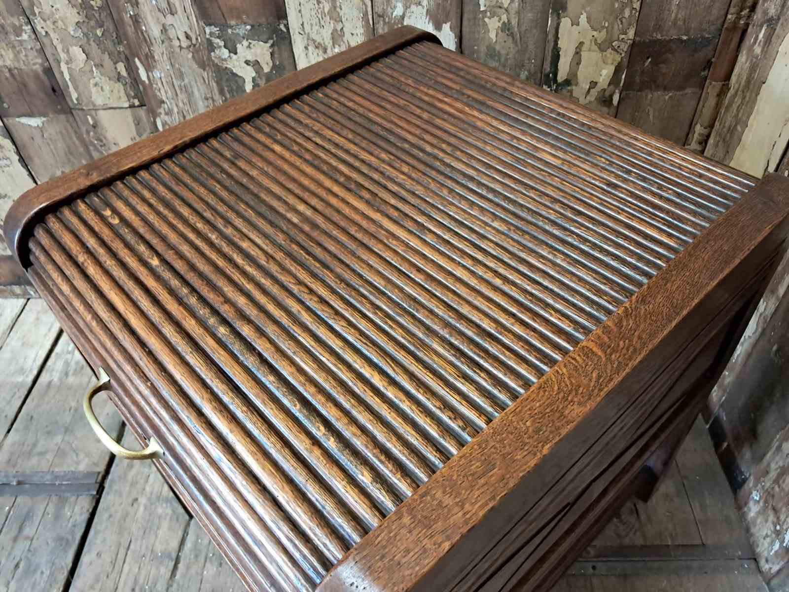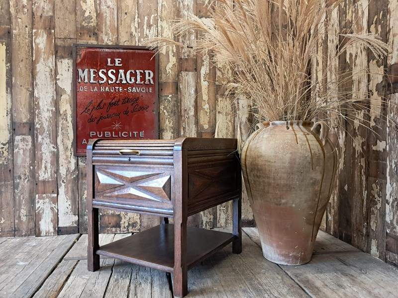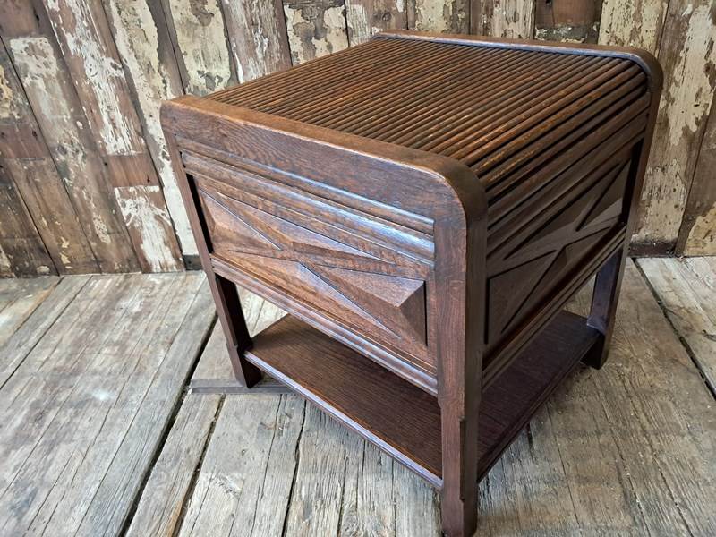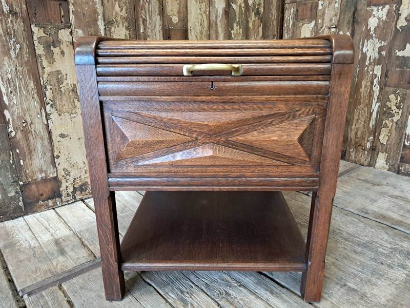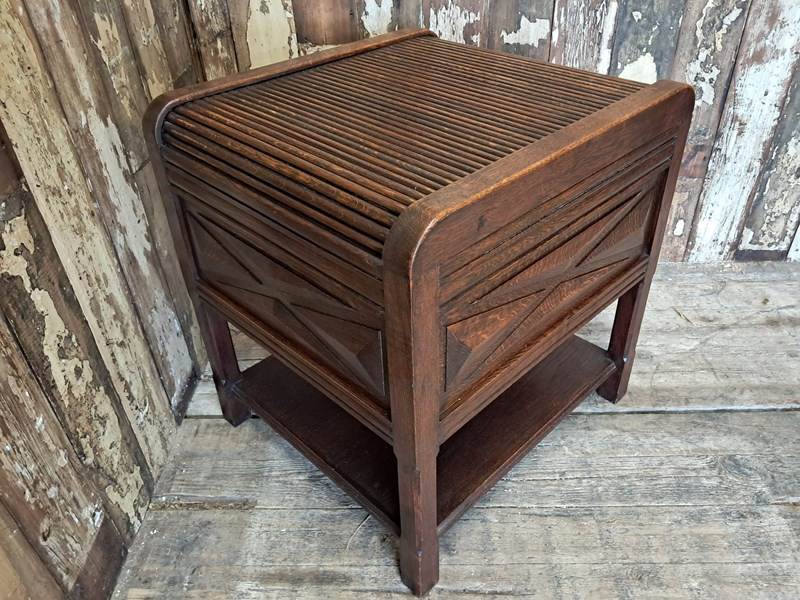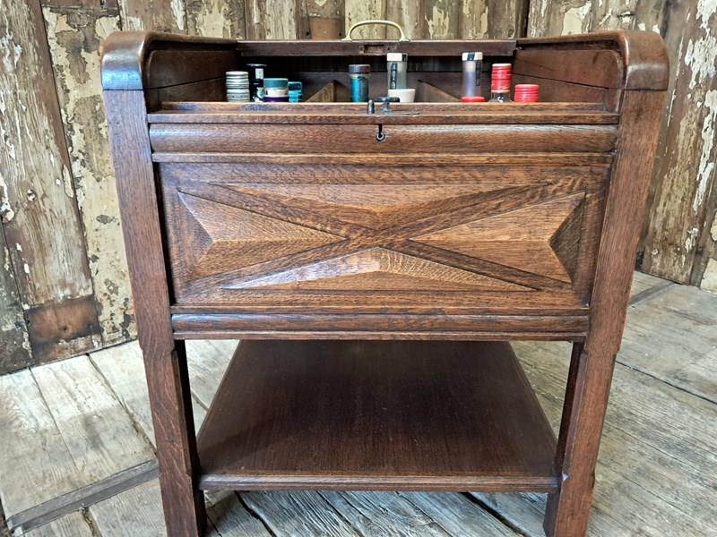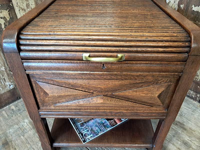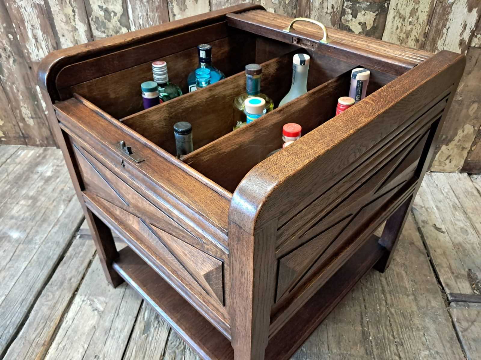 With a lovely tambour roll top compartment to store bottles and a display/storage shelf below.