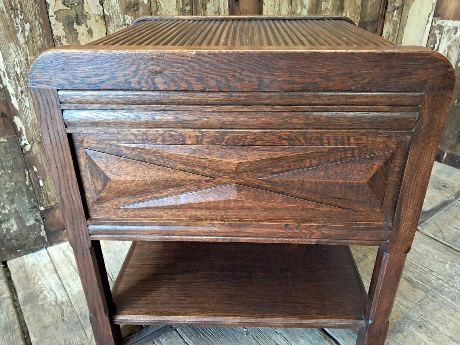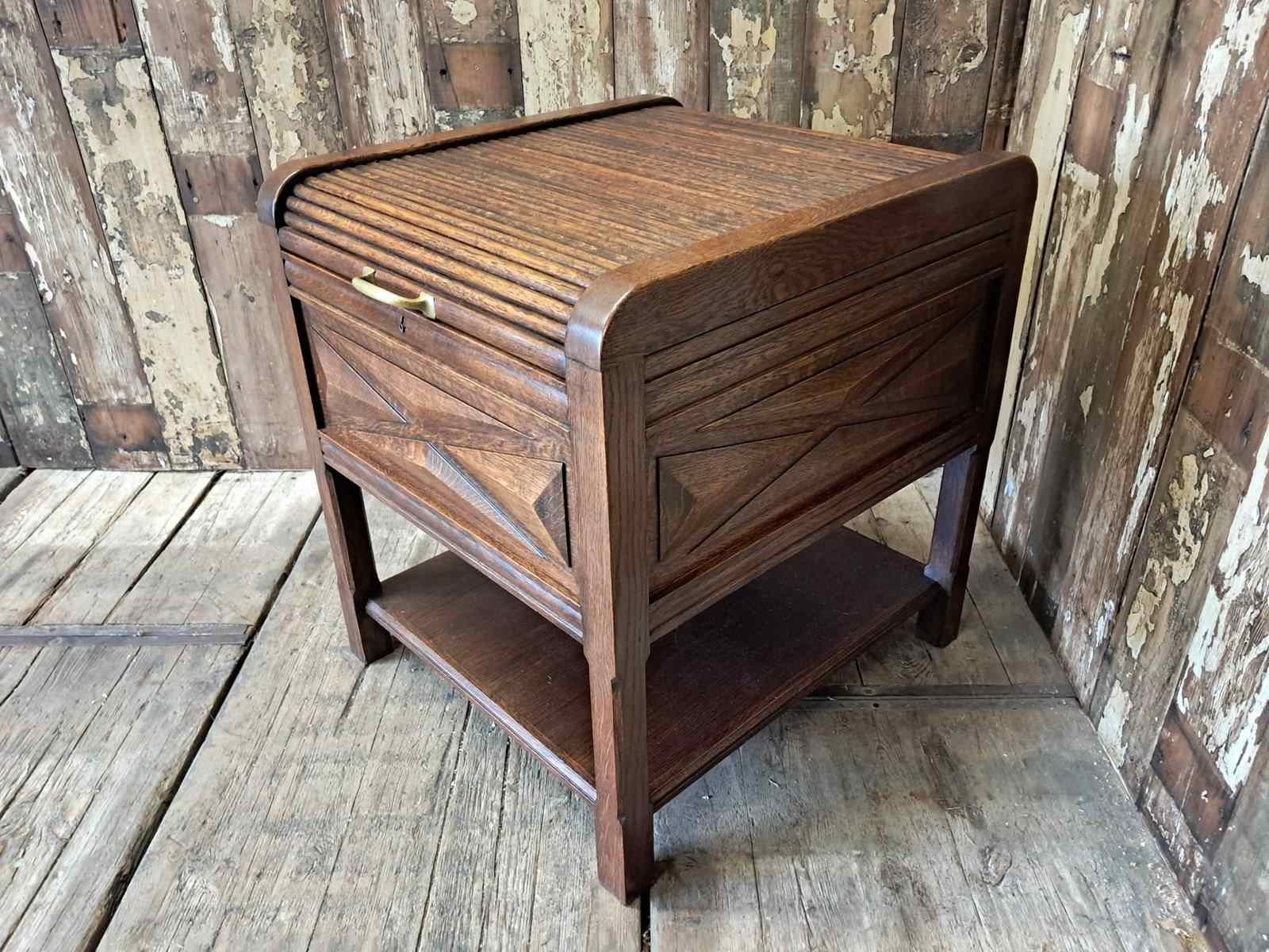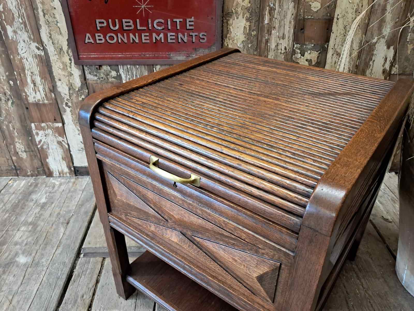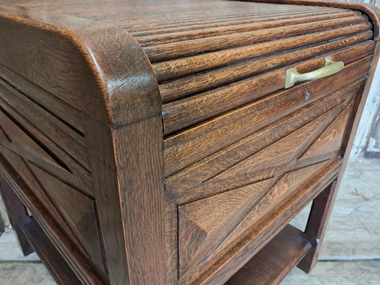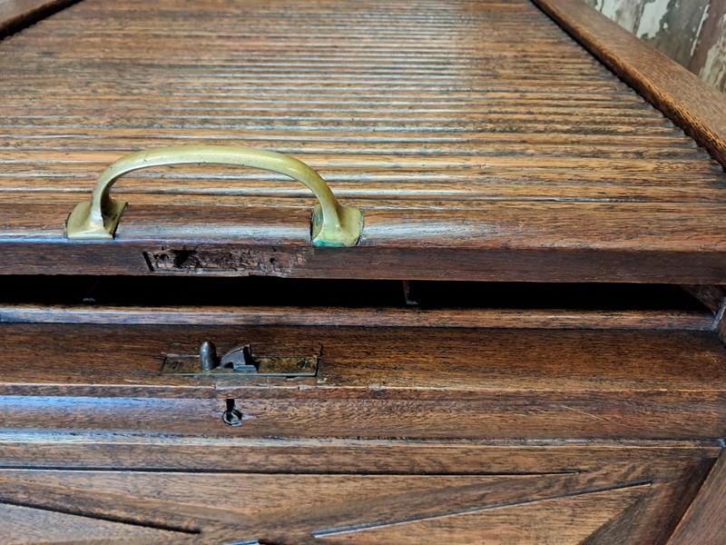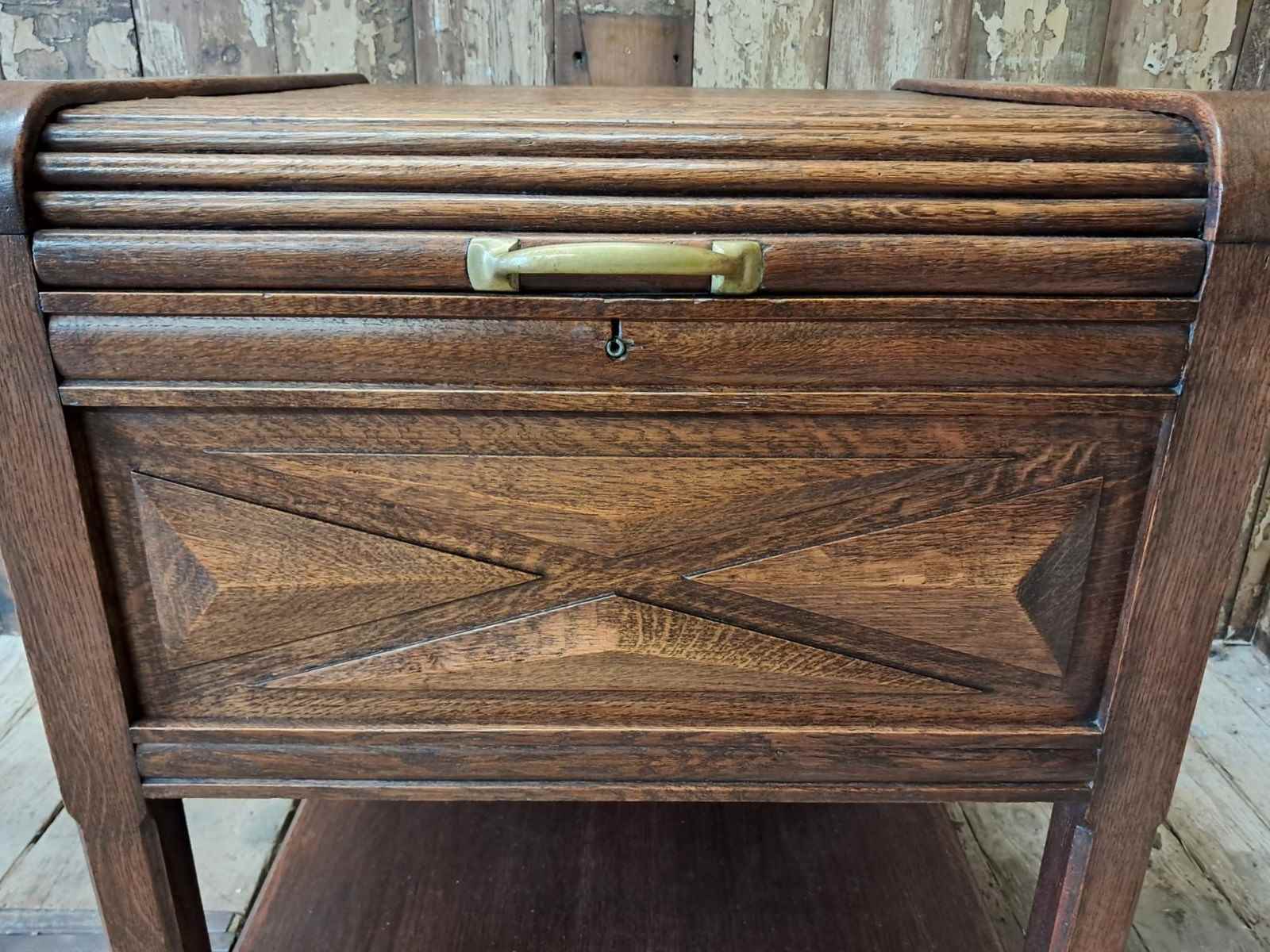 With a lovely tambour roll top compartment to store bottles and a display/storage shelf below.