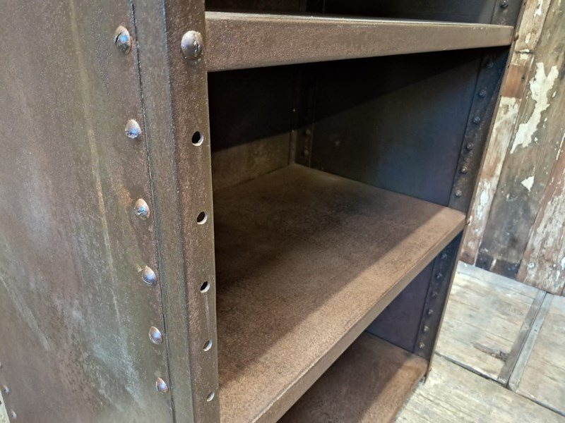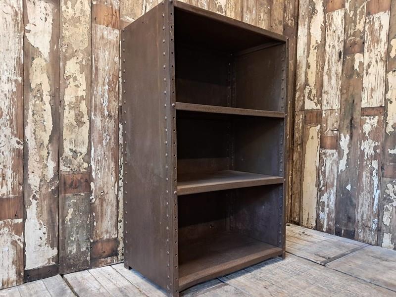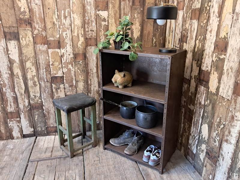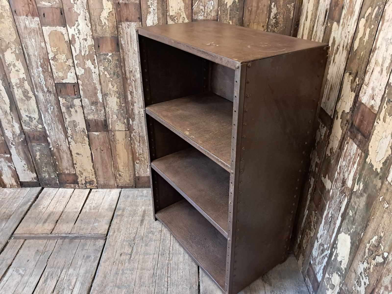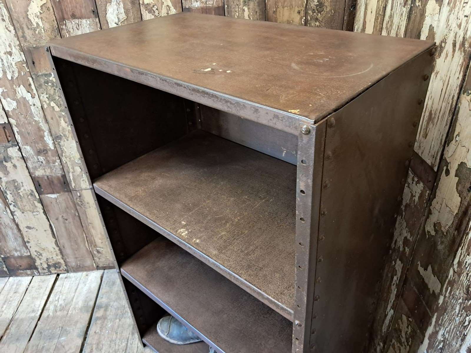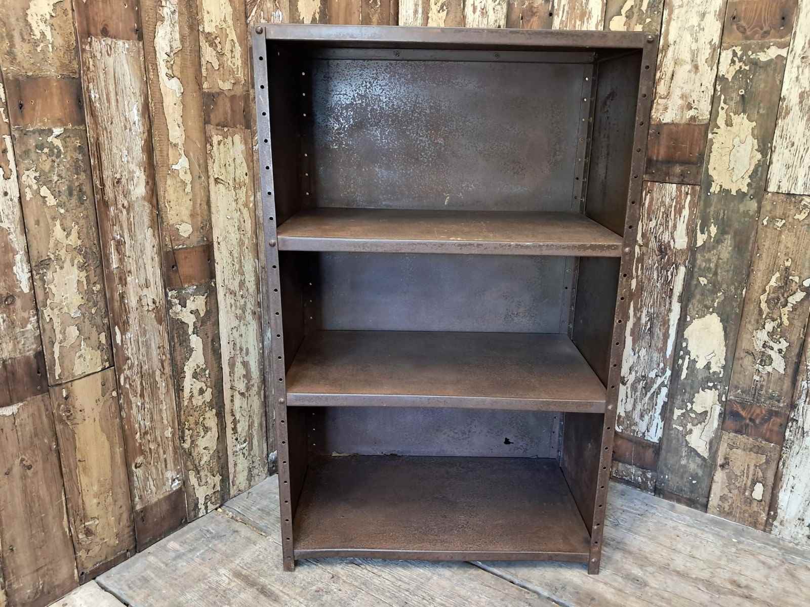 A 1950’s metal industrial shelf unit with 3 deep shelves and a super rusty patina.