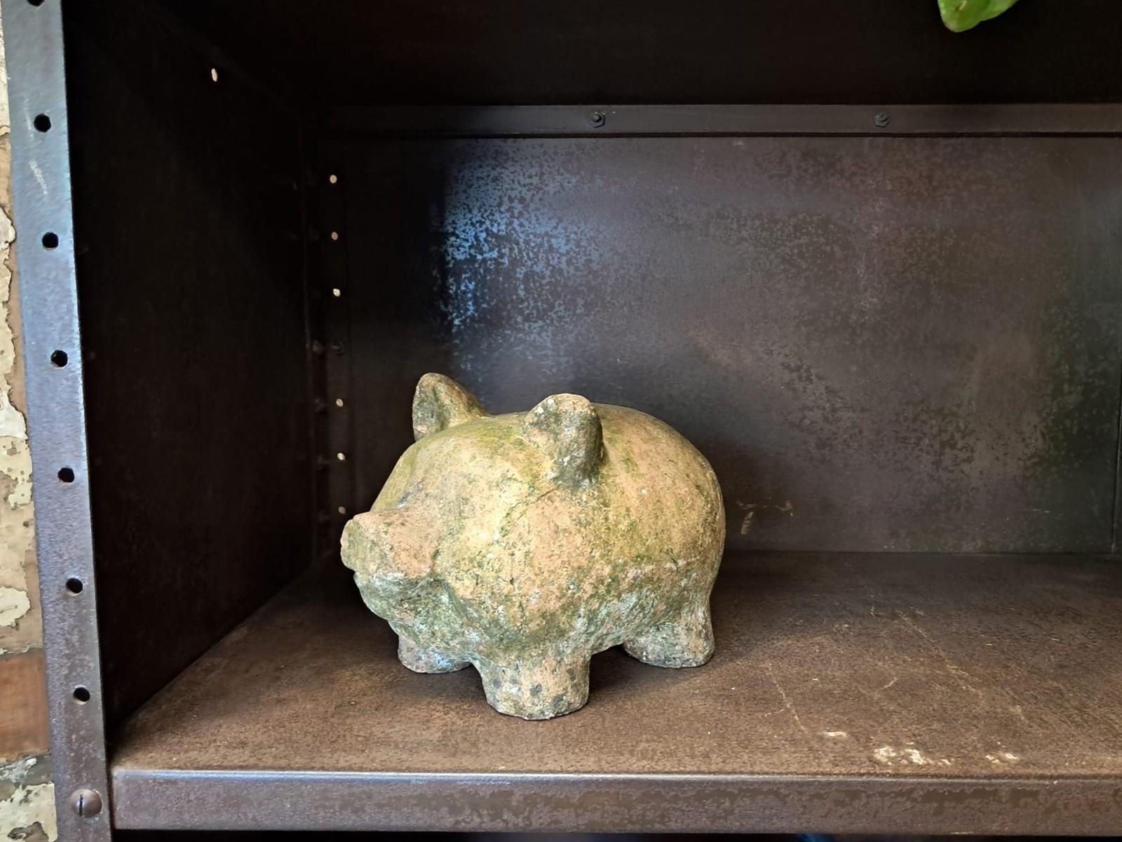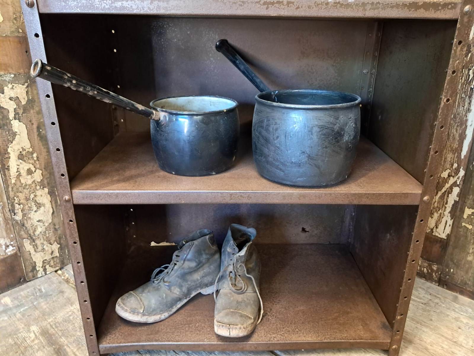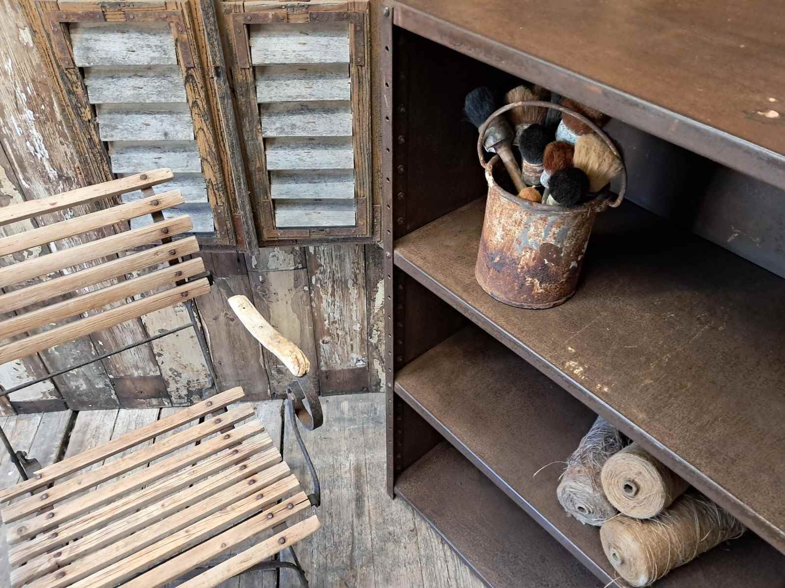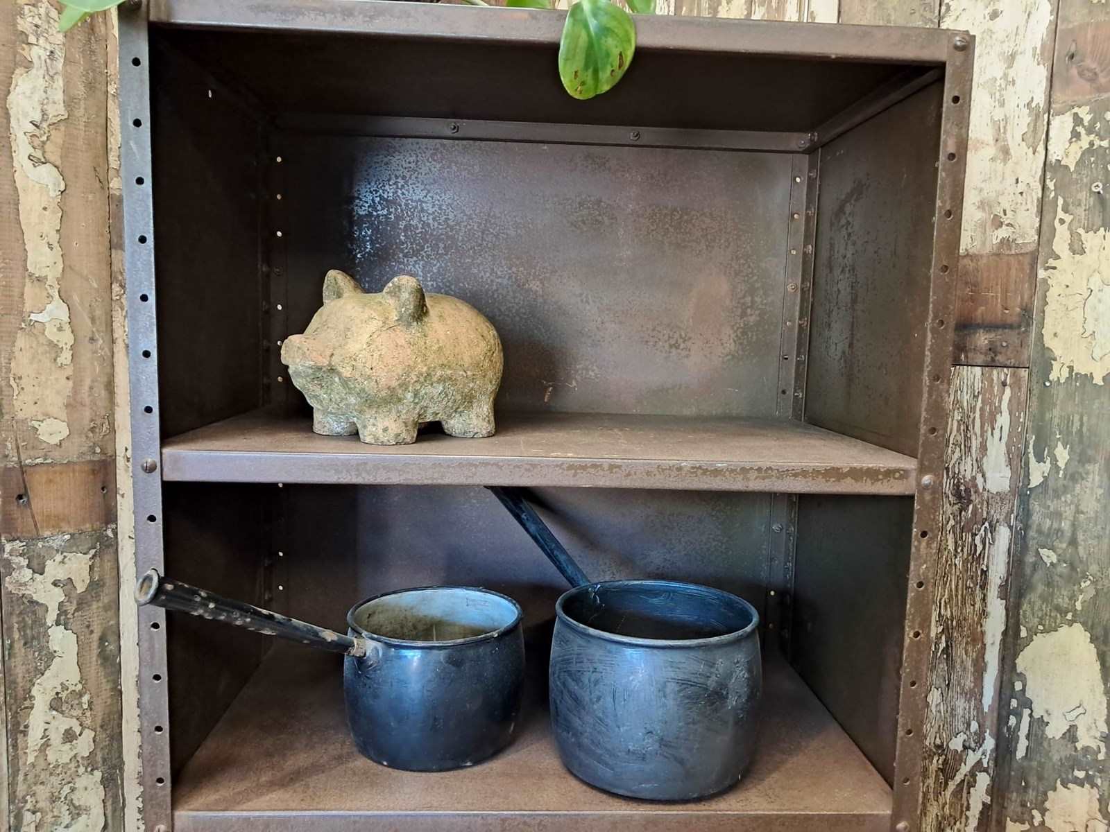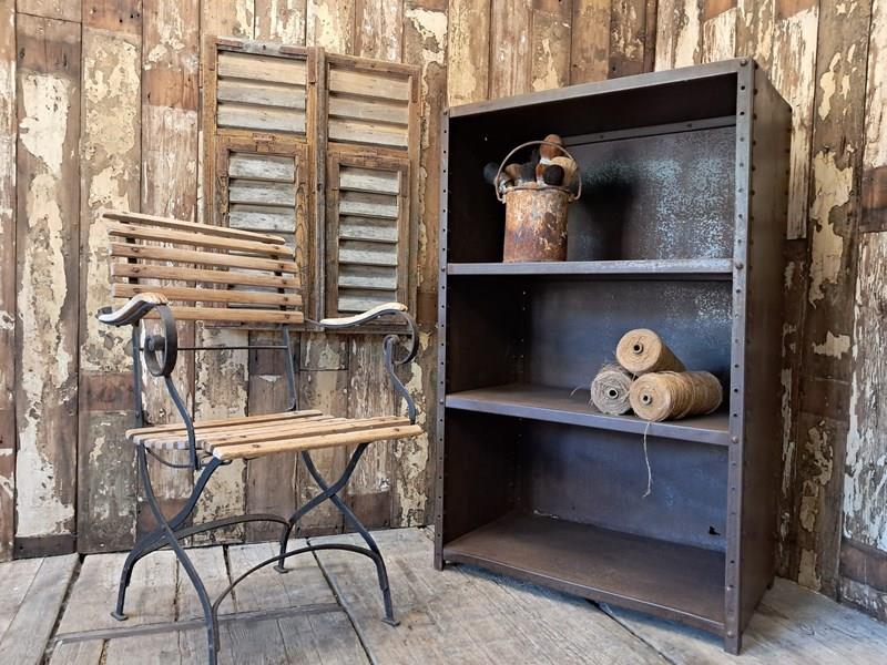 A 1950’s metal industrial shelf unit with 3 deep shelves and a super rusty patina.