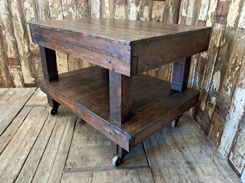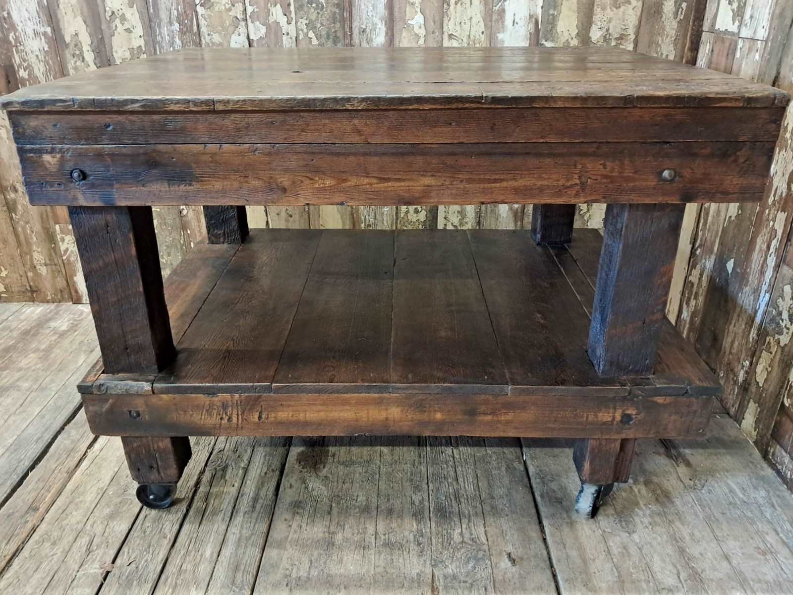 A fantastic dark pine kitchen island featuring a base storage shelf.