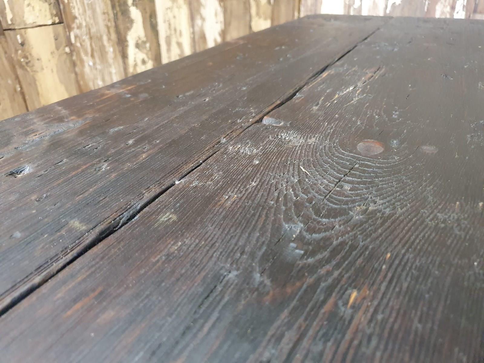 It has a three plank table top made from reclaimed dark chunky timber with pits and knots and super figuring.