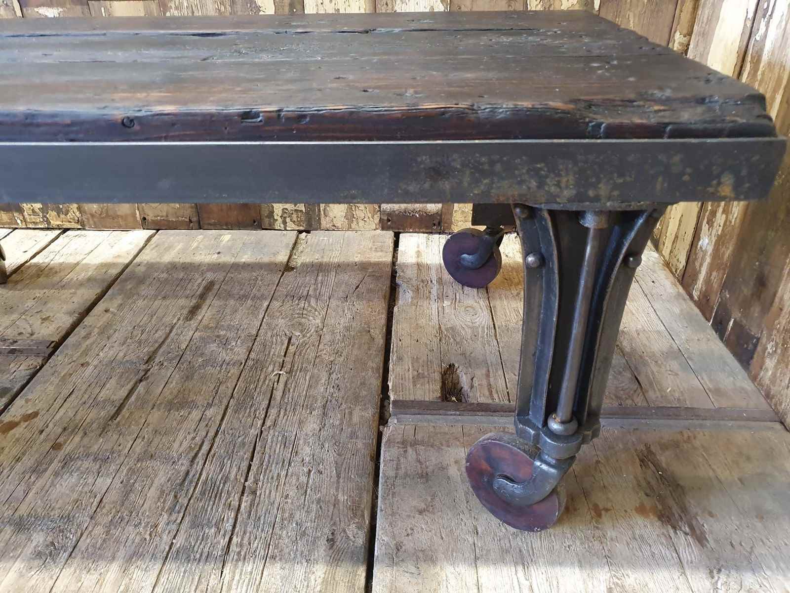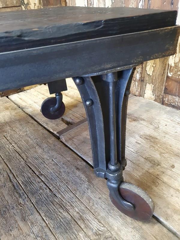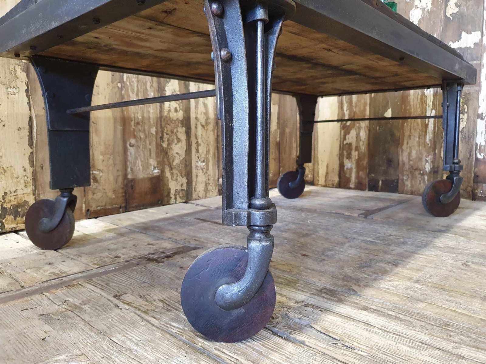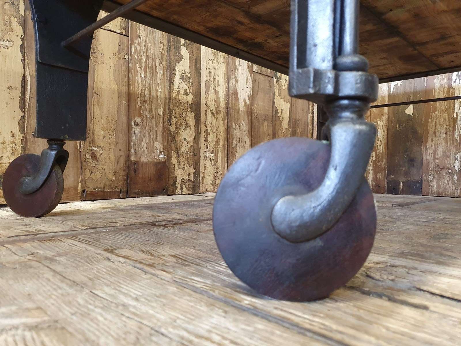 The base consists of cast iron shapely legs on chunky castor wheels.