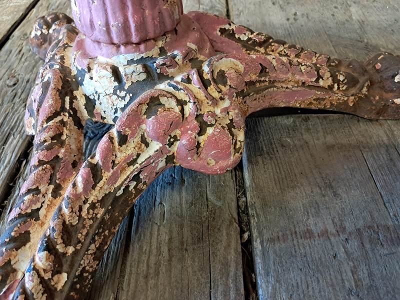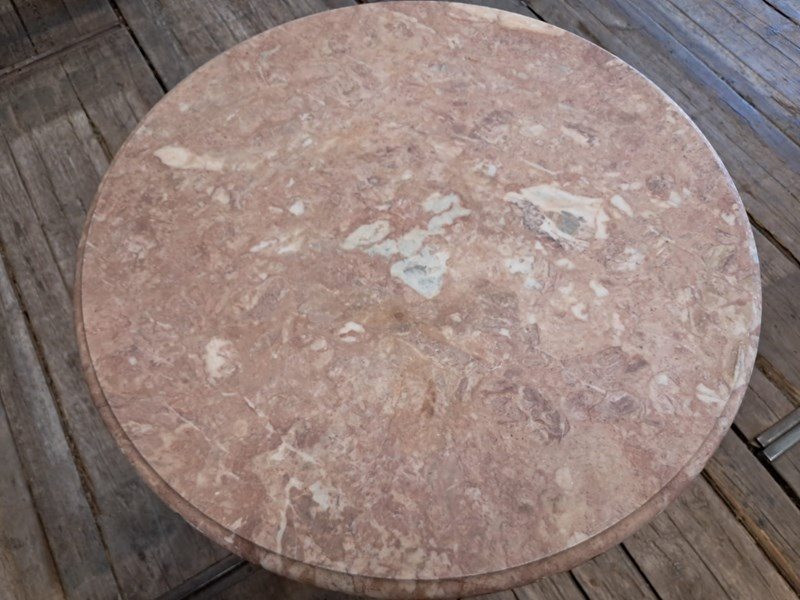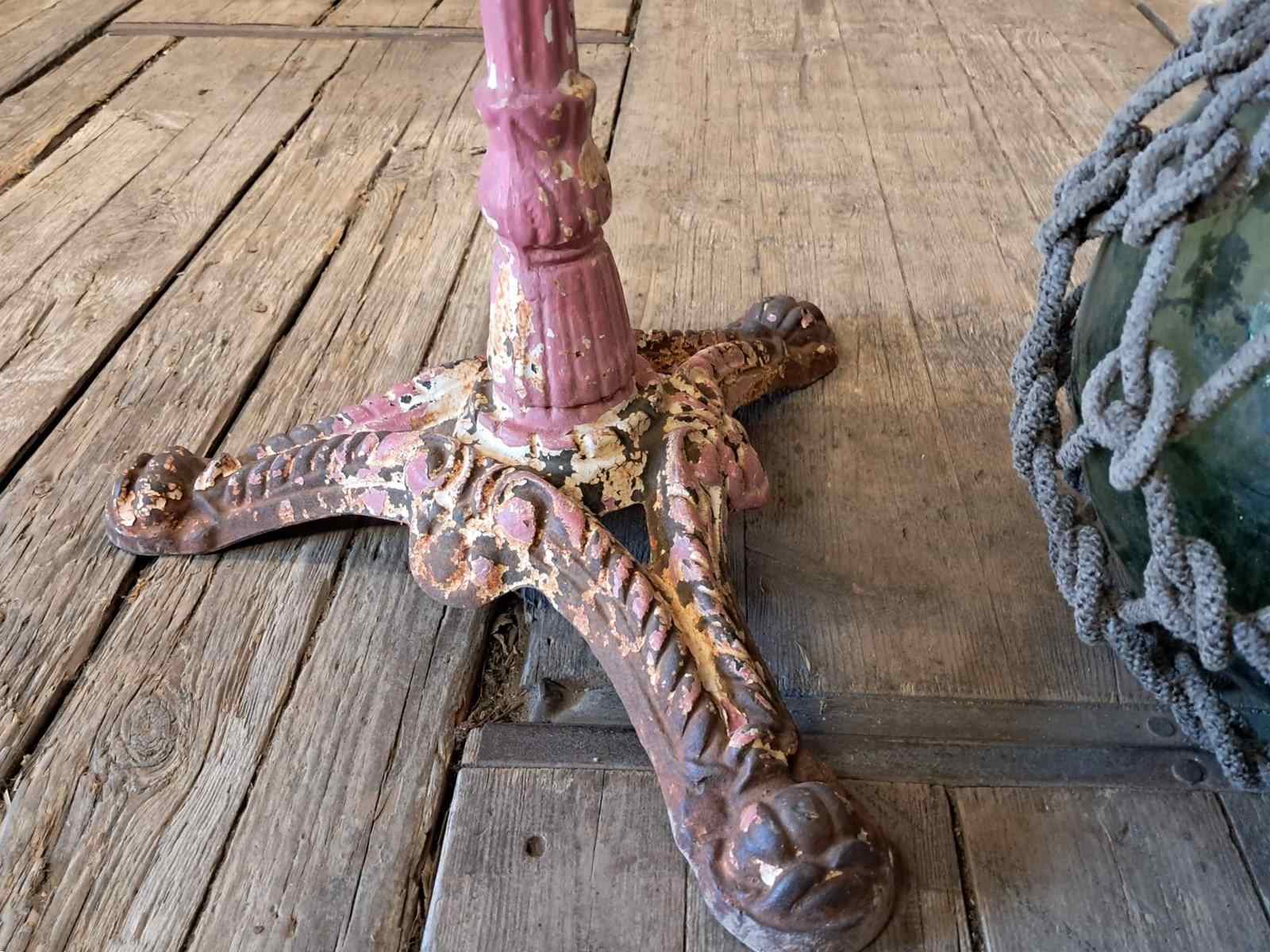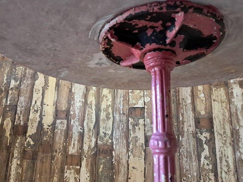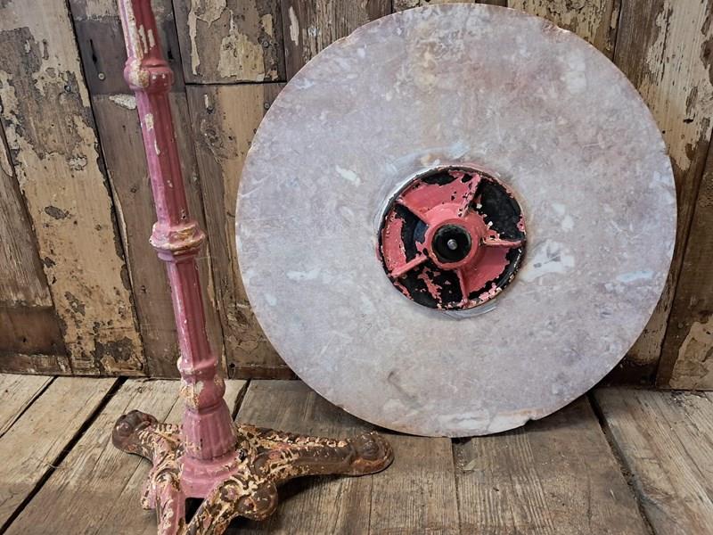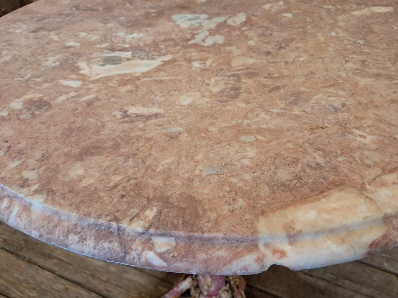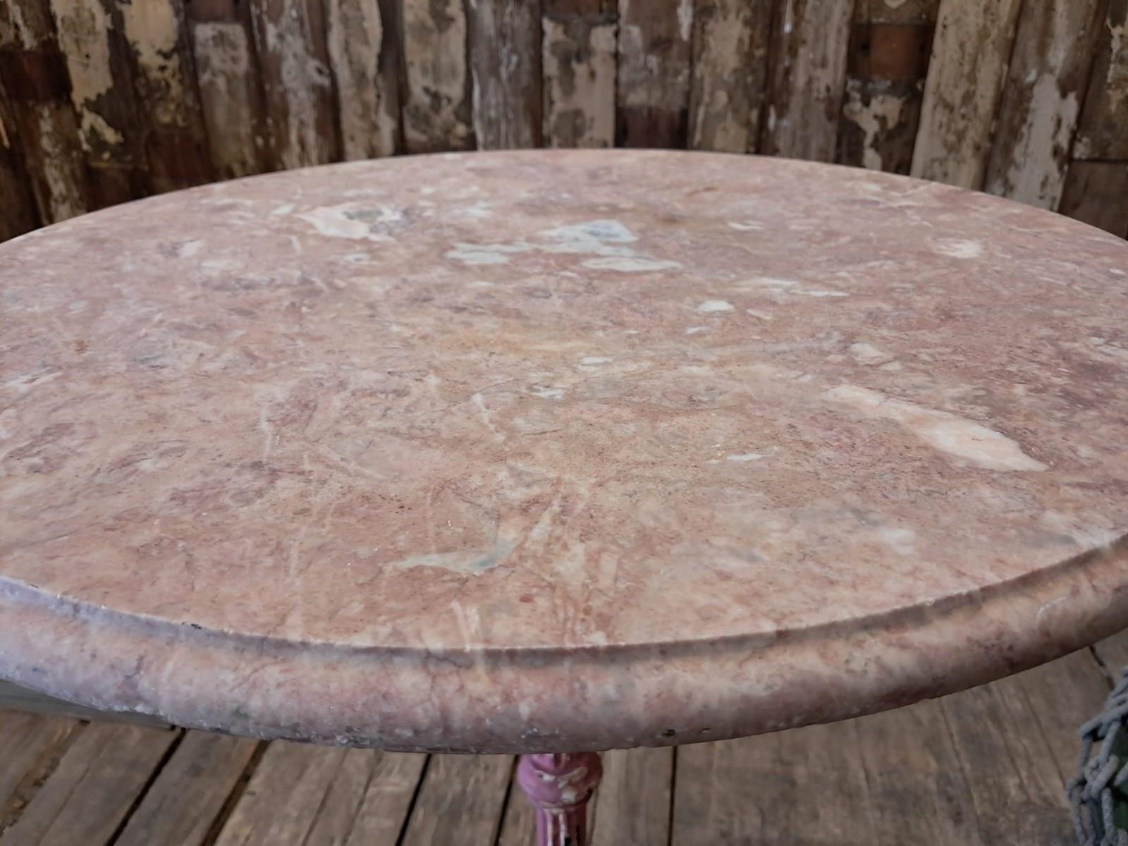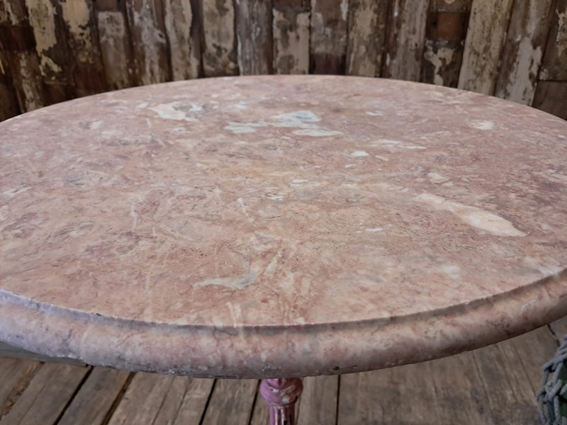 Painted, ornate cast iron centre leg and wonderfully weathered marble top.