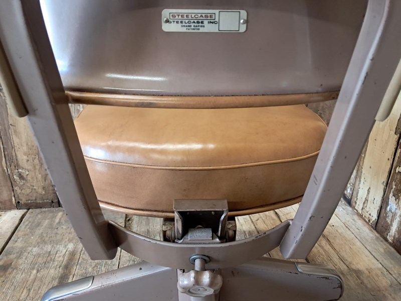 Made by Steelcase Inc, with original branding on the back rest, this robust chair has a steel frame with wheels and beige vinyl upholstery.