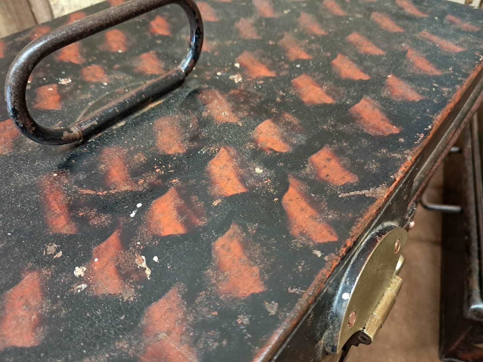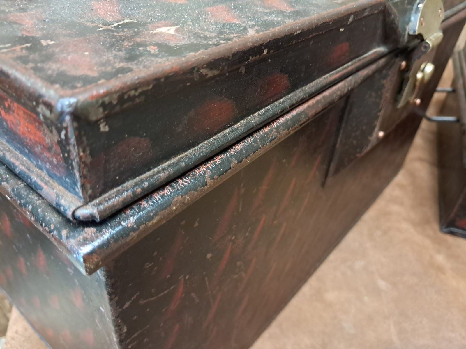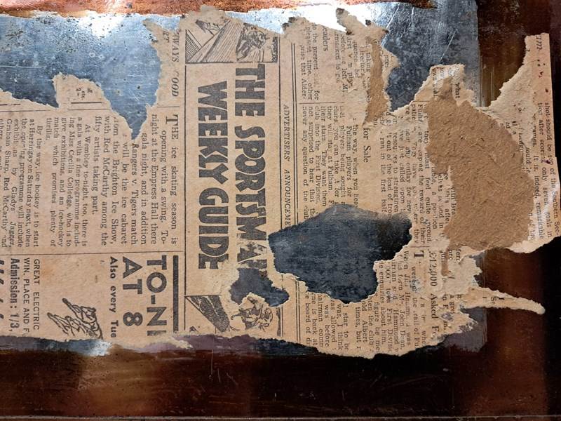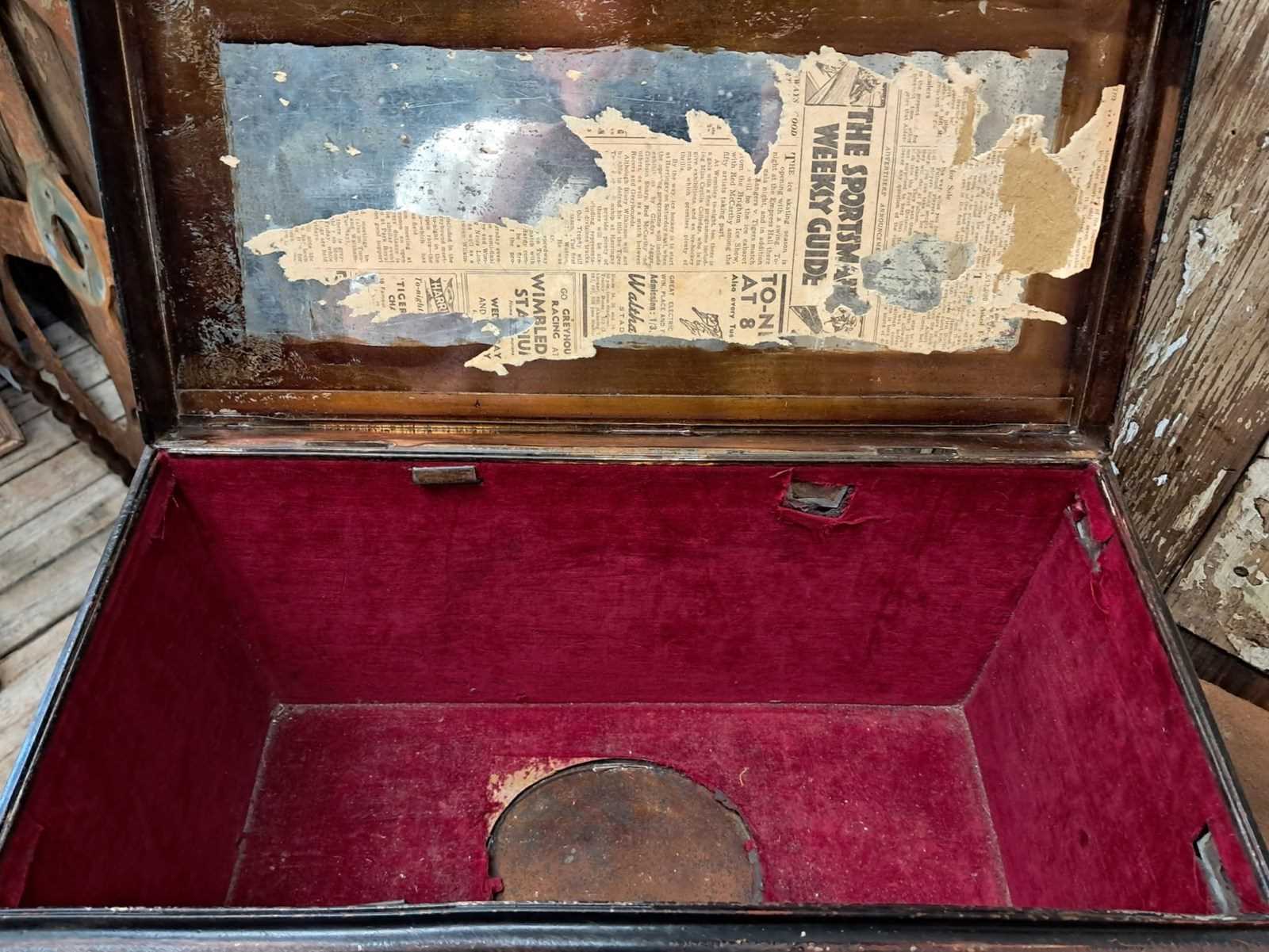 It has been hand painted japanned style. A great piece of history and storage, which also has an original paper clipping stuck inside advertising the Brighton Ice Skating Show and other skating tournaments.