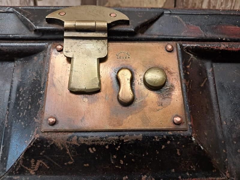 It has a polished brass lock with working spring button, but no key, and a top carry handle.