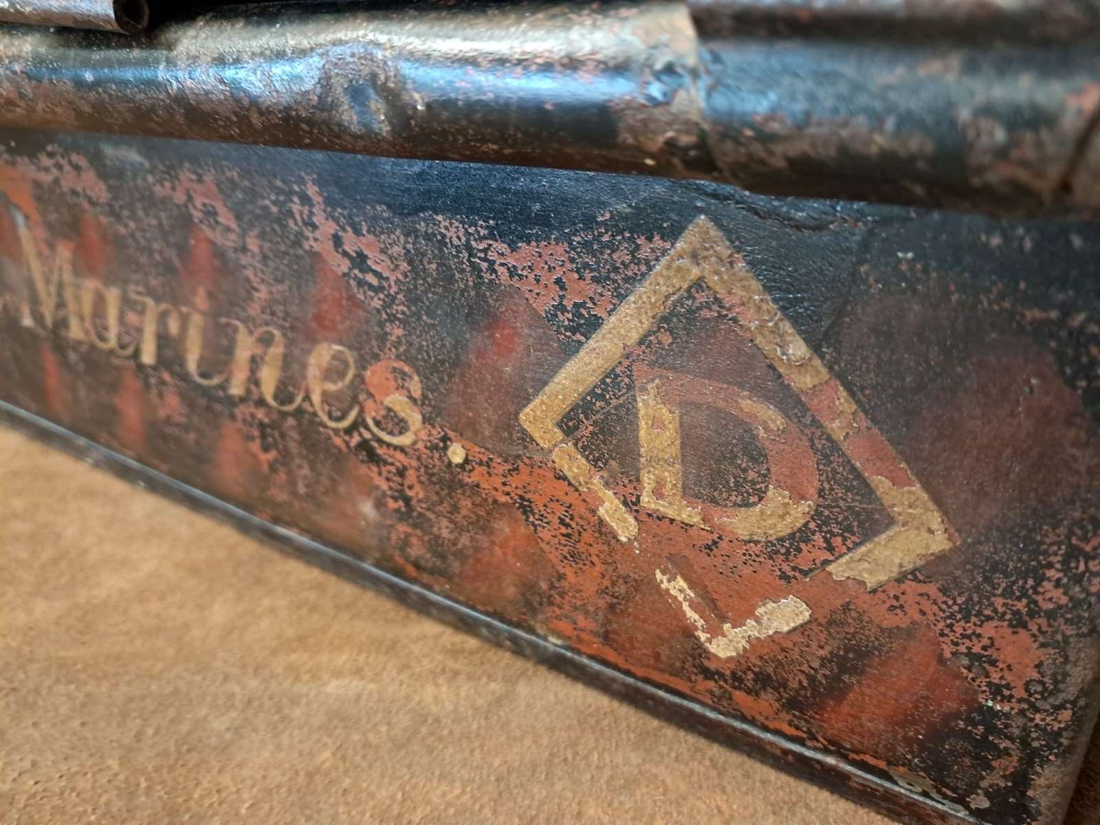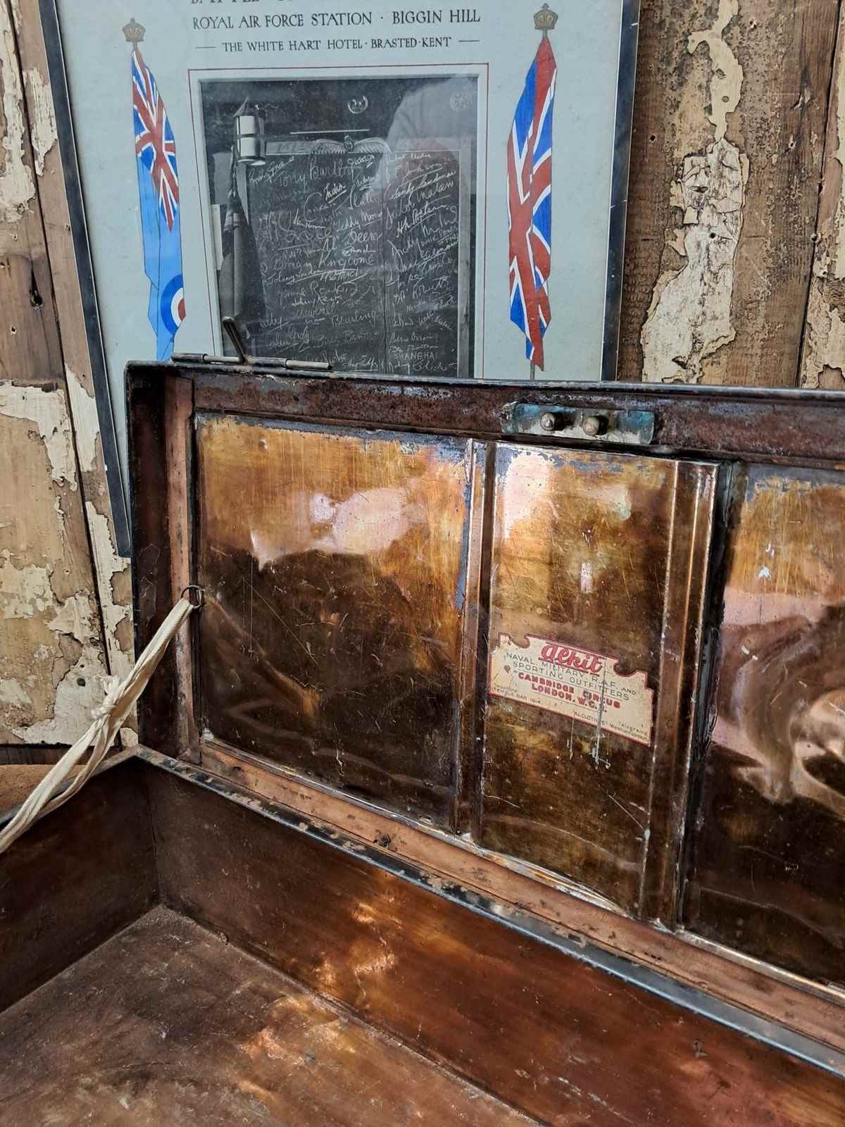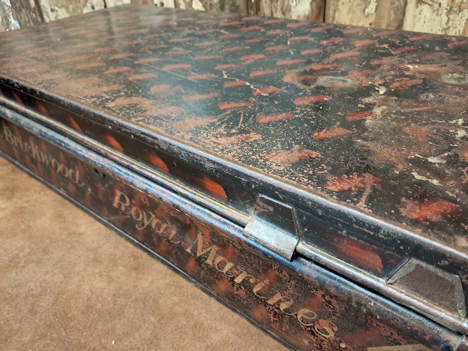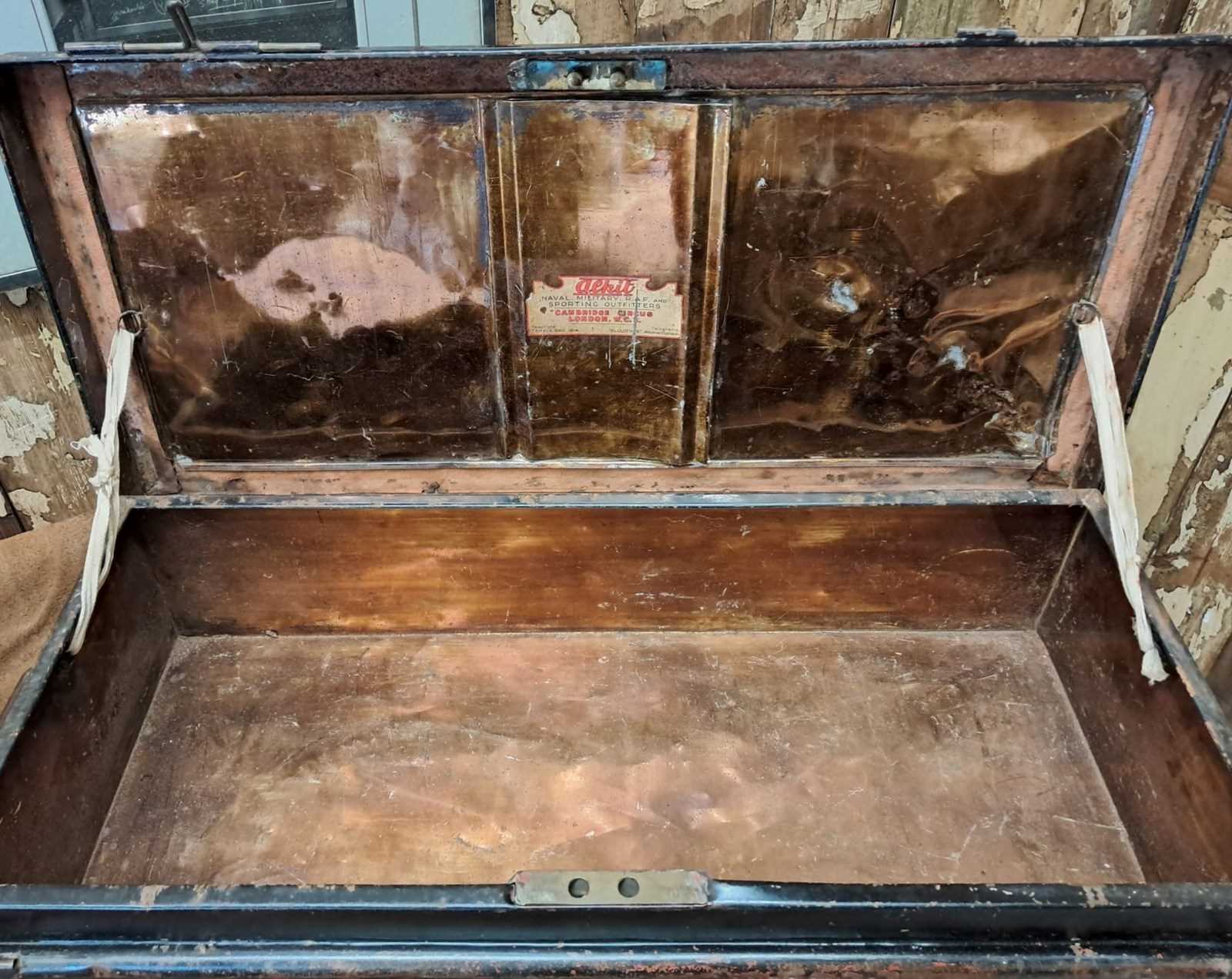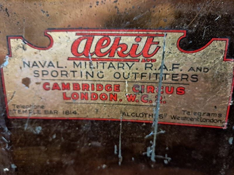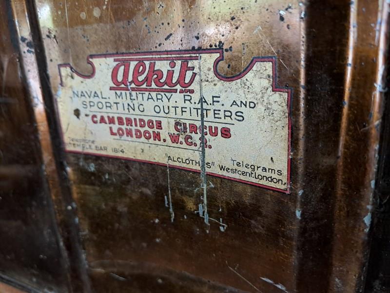 This low level trunk was originally used to house sporting kits and/or robes and is made by ‘Alkit’, London with the original branding label inside. It also has the officers name and Royal Marines painted on the side adding to its authenticity.