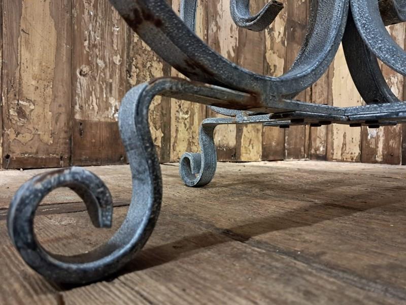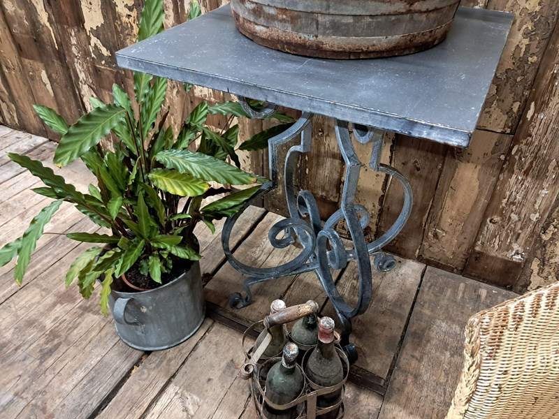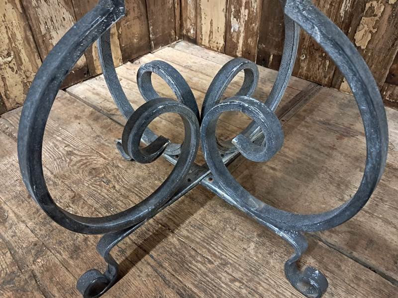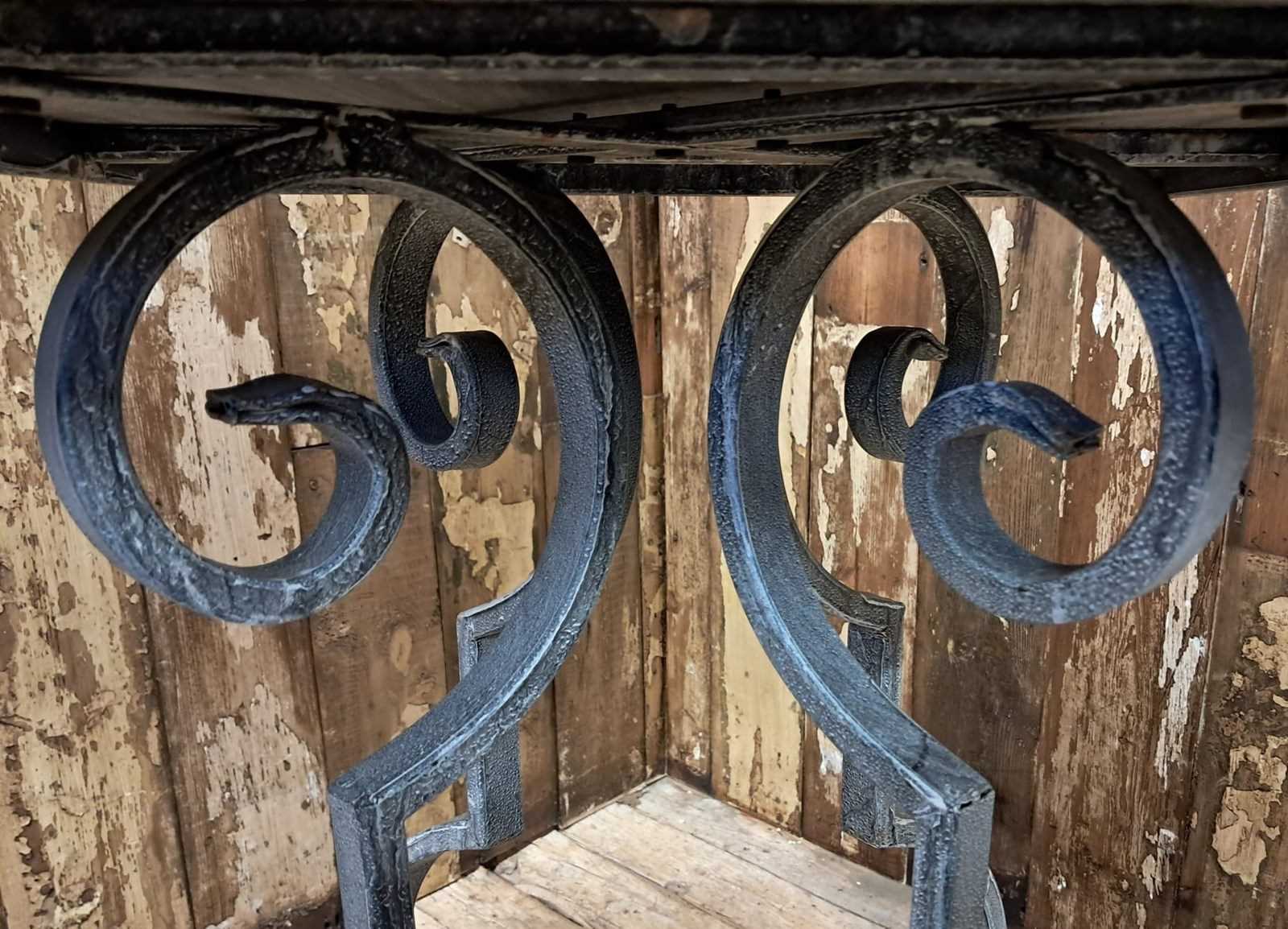 The table boasts a lovely scrolled steel base with a solid steel top – beautifully weathered.