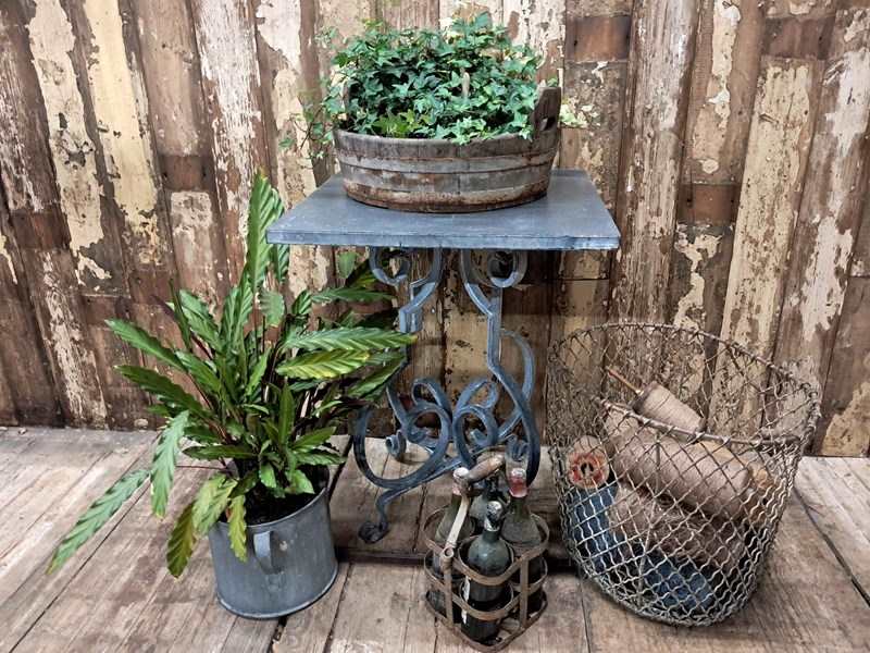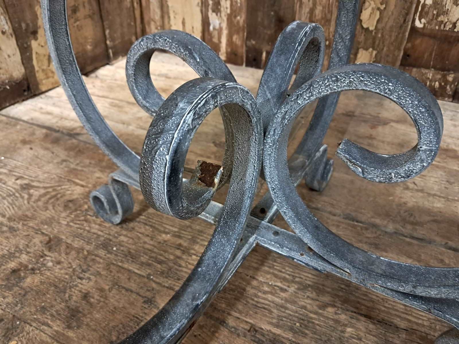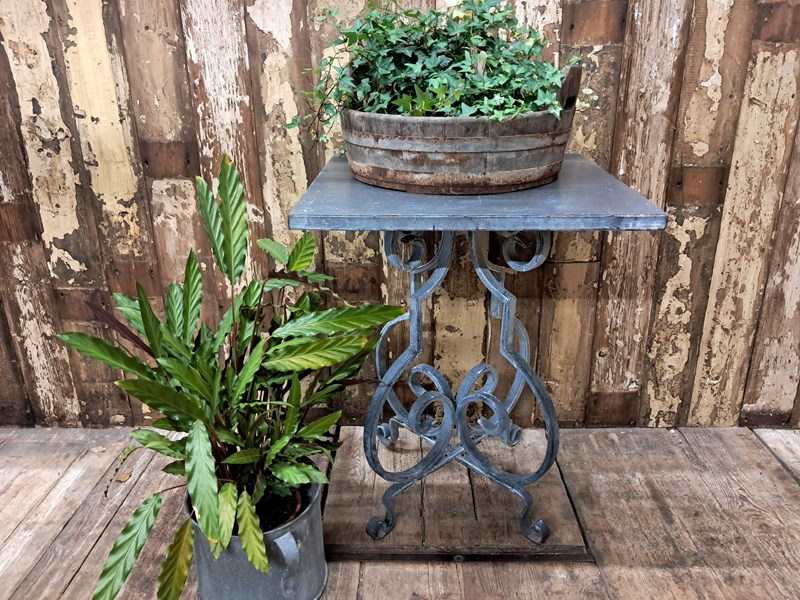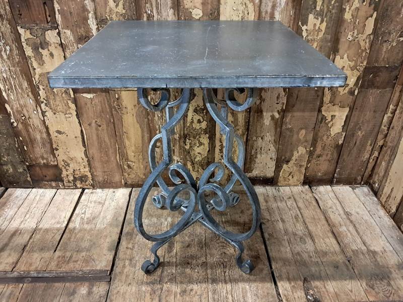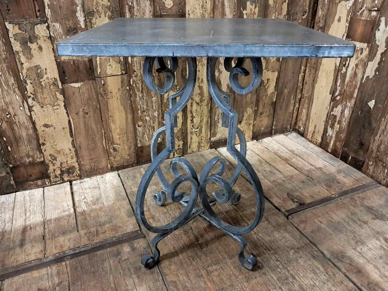 The table boasts a lovely scrolled steel base with a solid steel top – beautifully weathered.