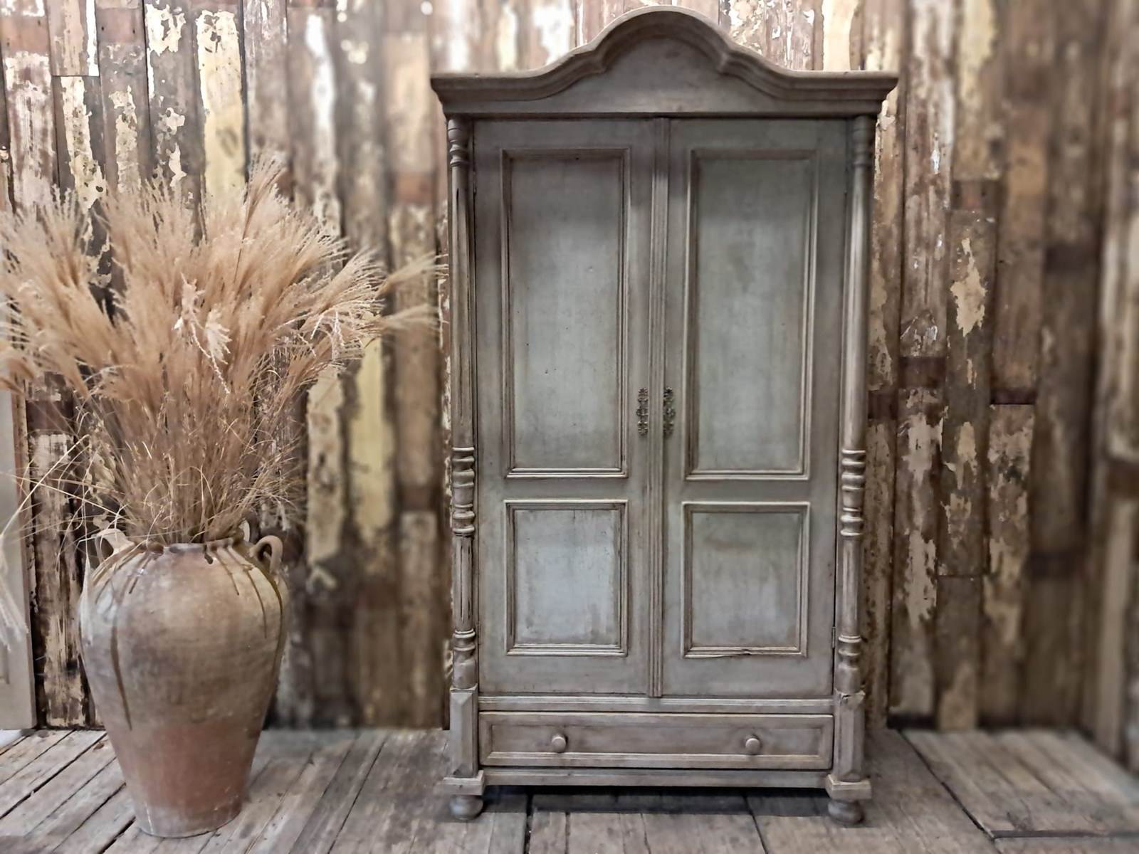 Painted in a delicate French grey complete with original hanging rail and 2 wooden shelves, with one full width base drawer.