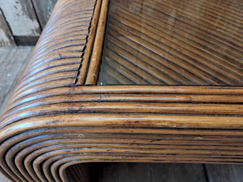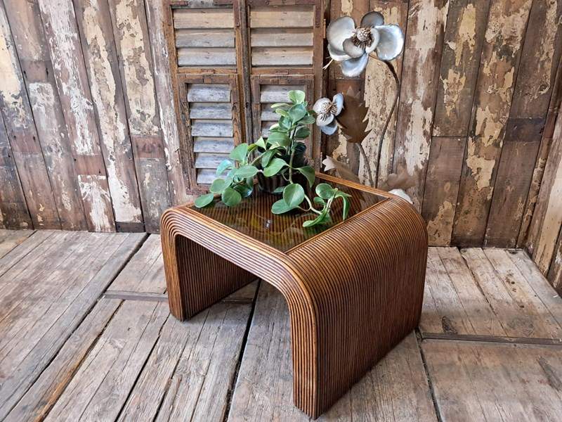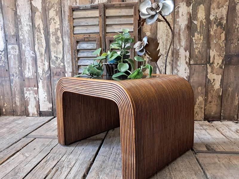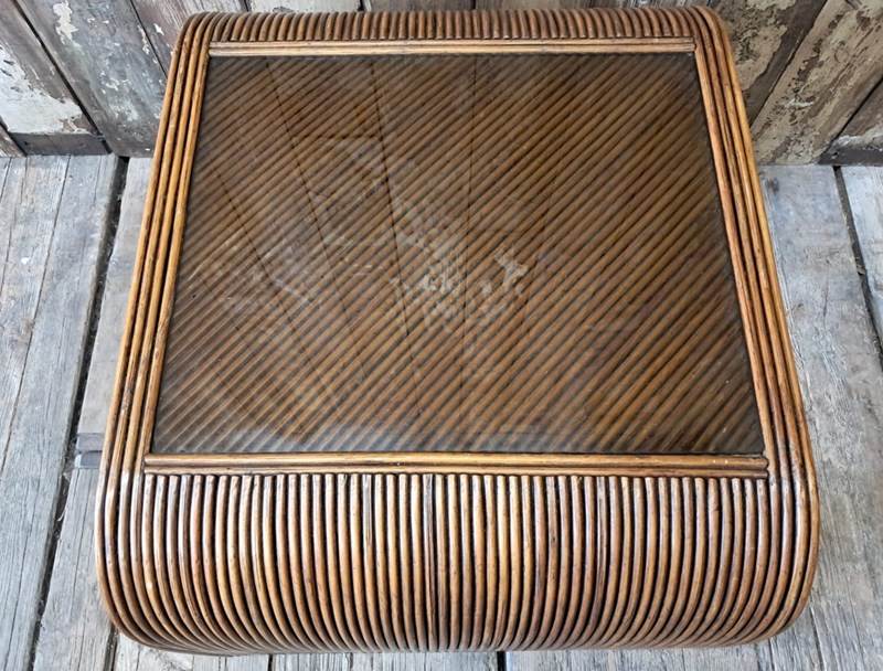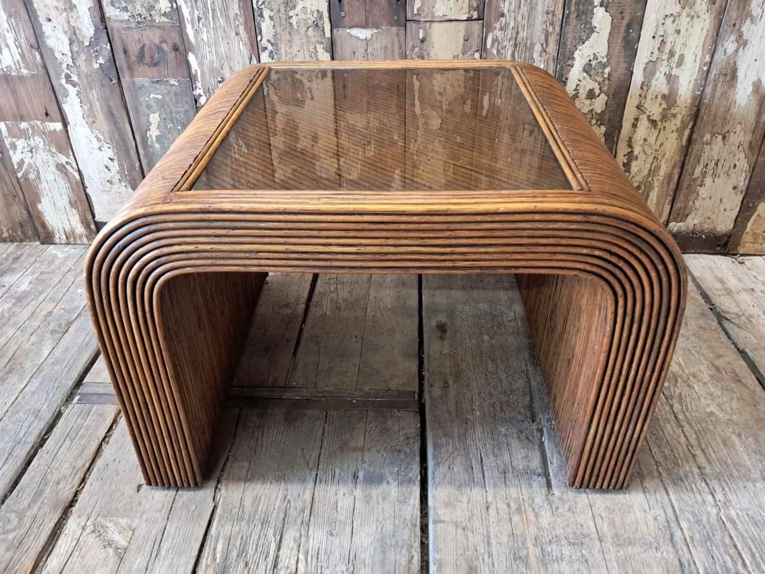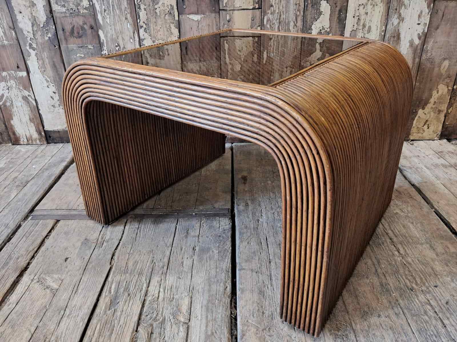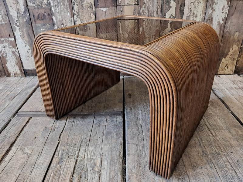 A gorgeous waterfall pencil reed coffee table with inset glass top.