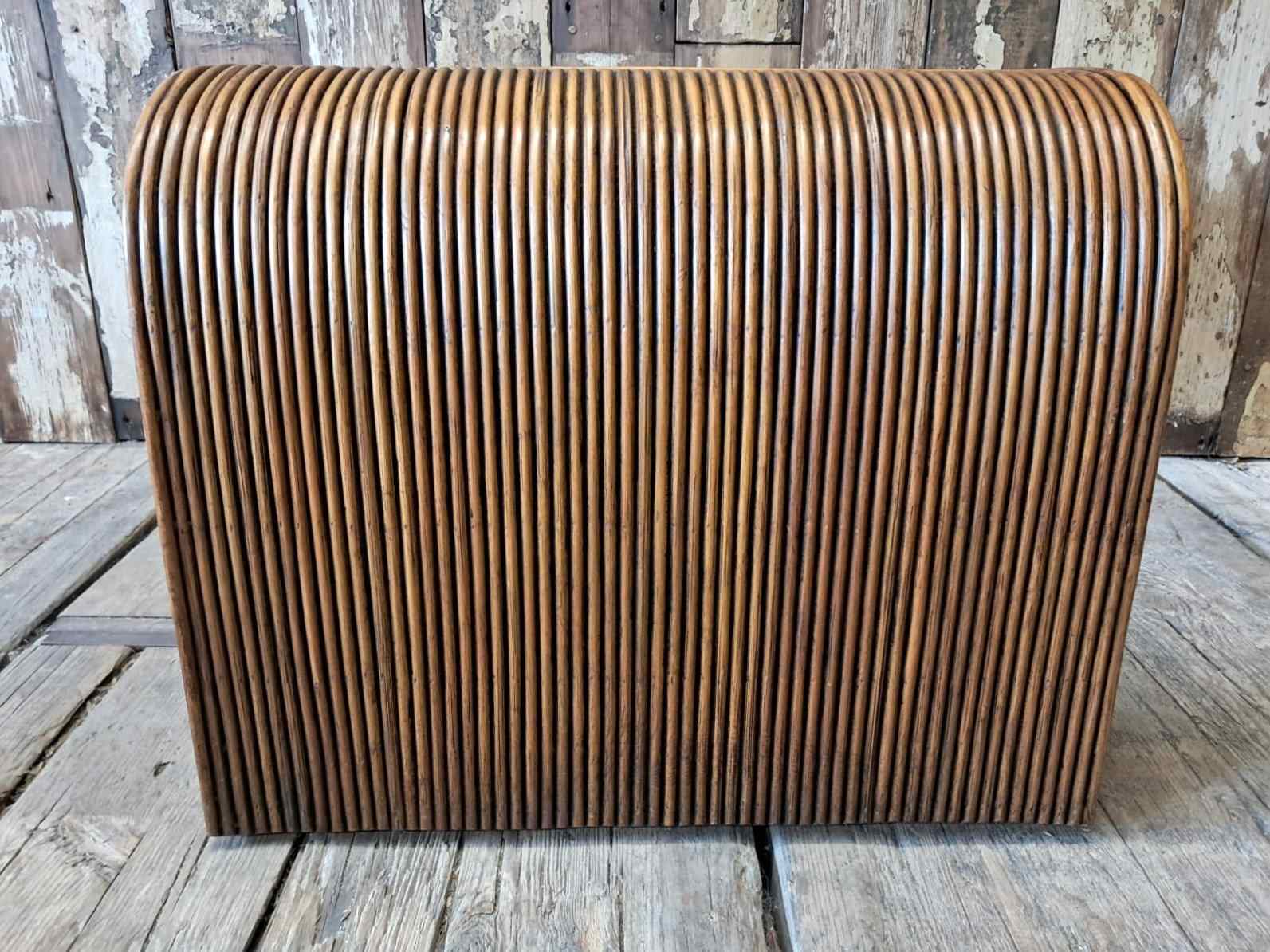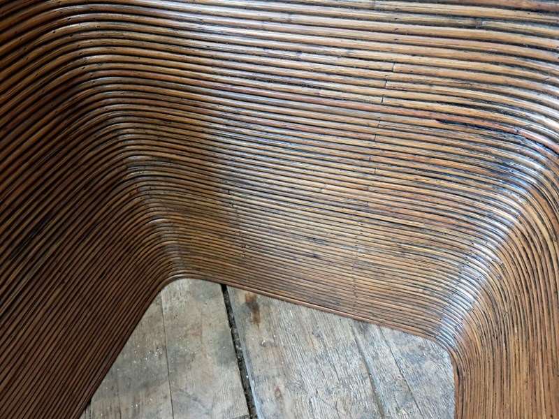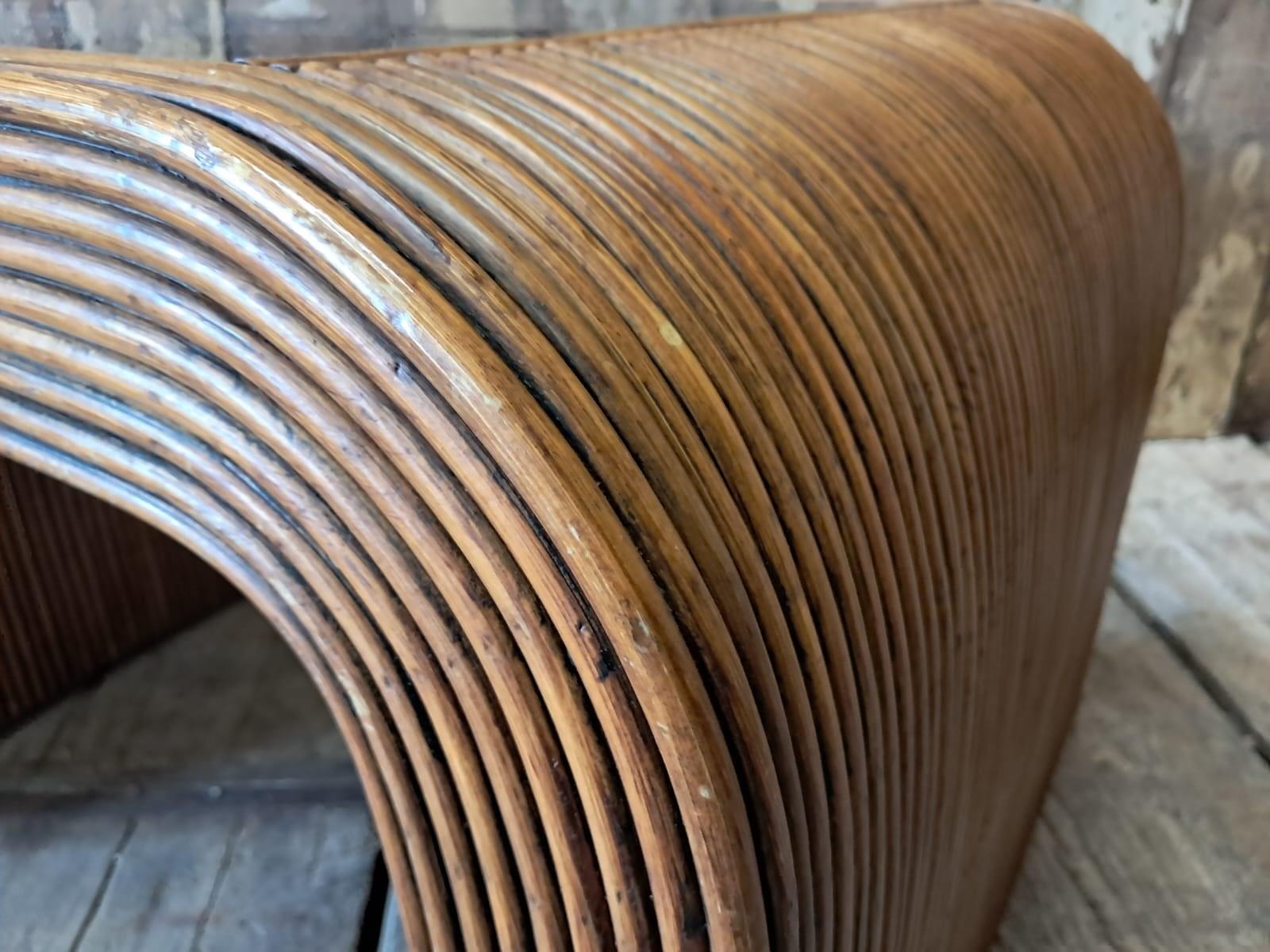 A sophisticated vintage 1970s coffee table with a gracefully curved, sculptural design, meticulously wrapped in natural pencil reed for a textural and visually captivating look.