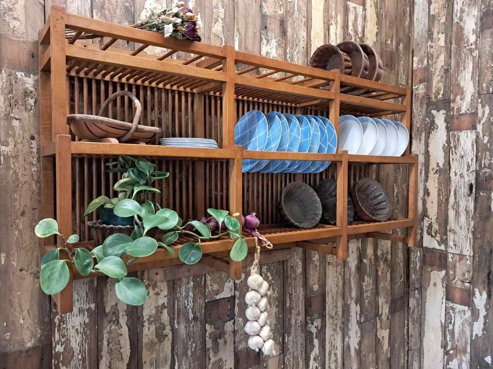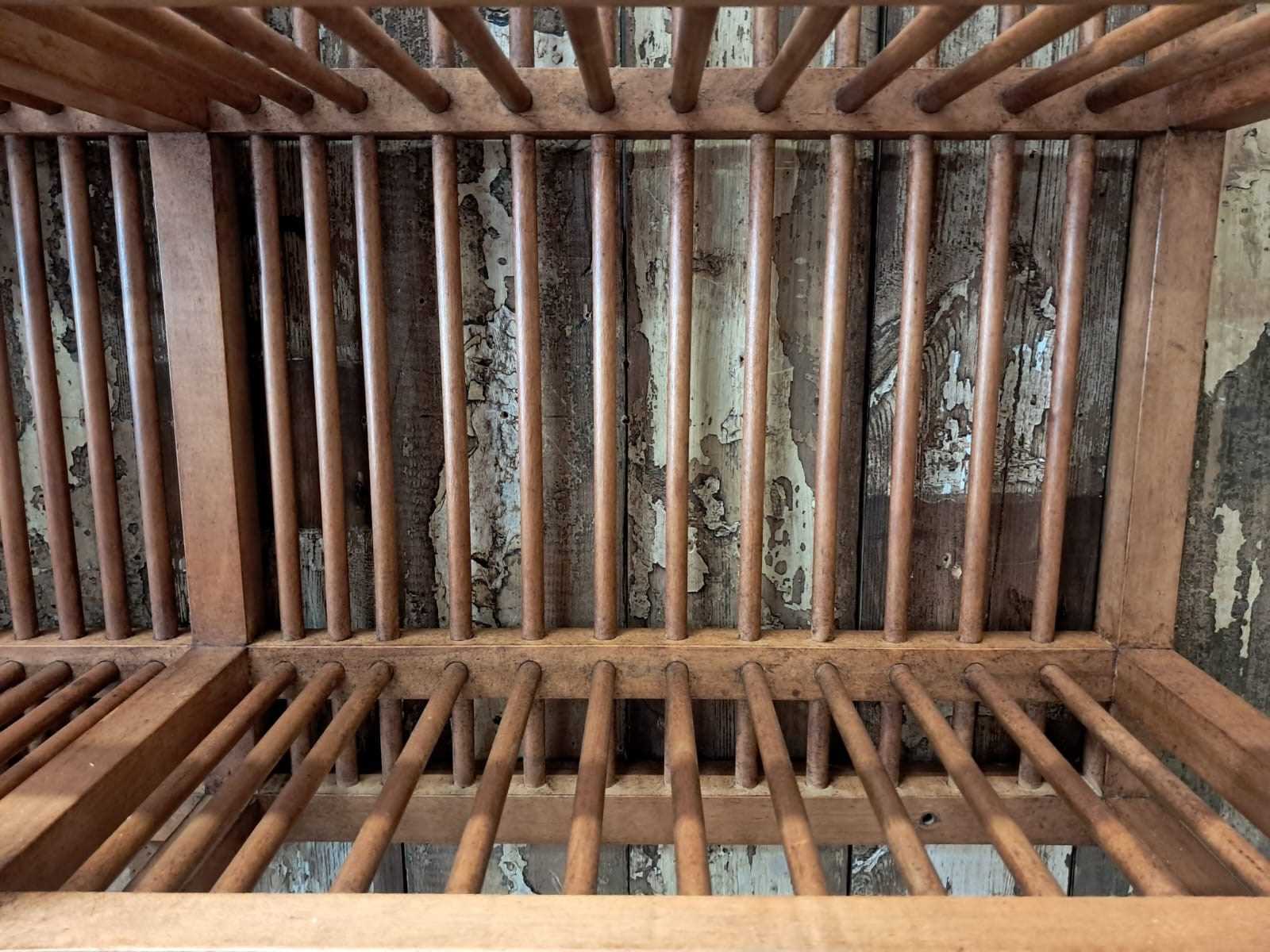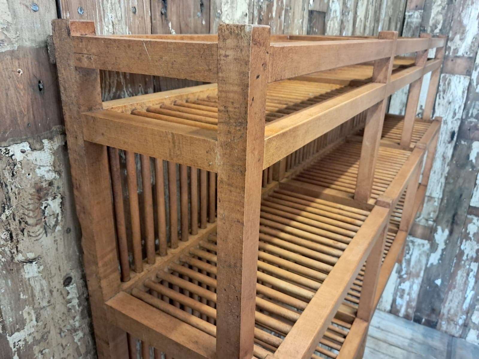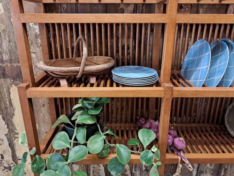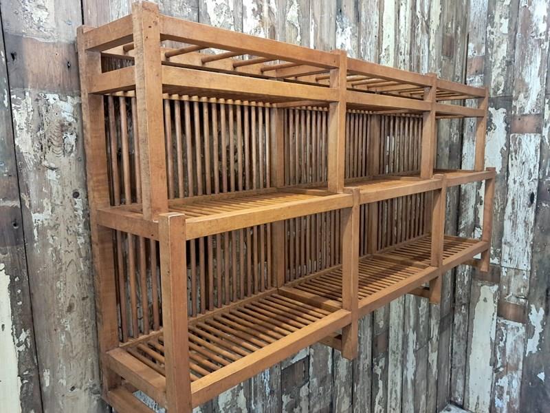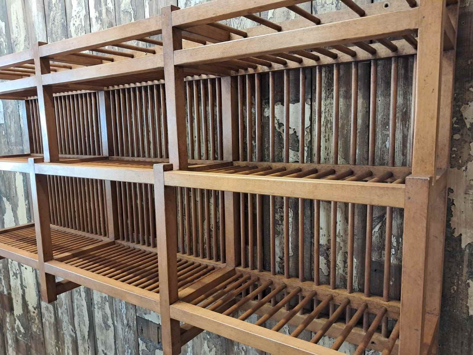 Two bottom tiers have 18 dowels for plates, the top is in three sections each with 5 dowels suitable for bowls.