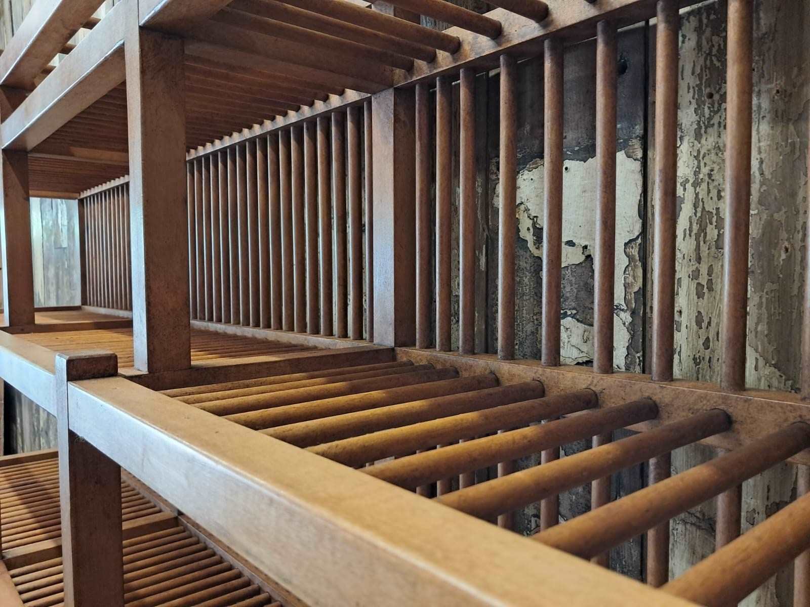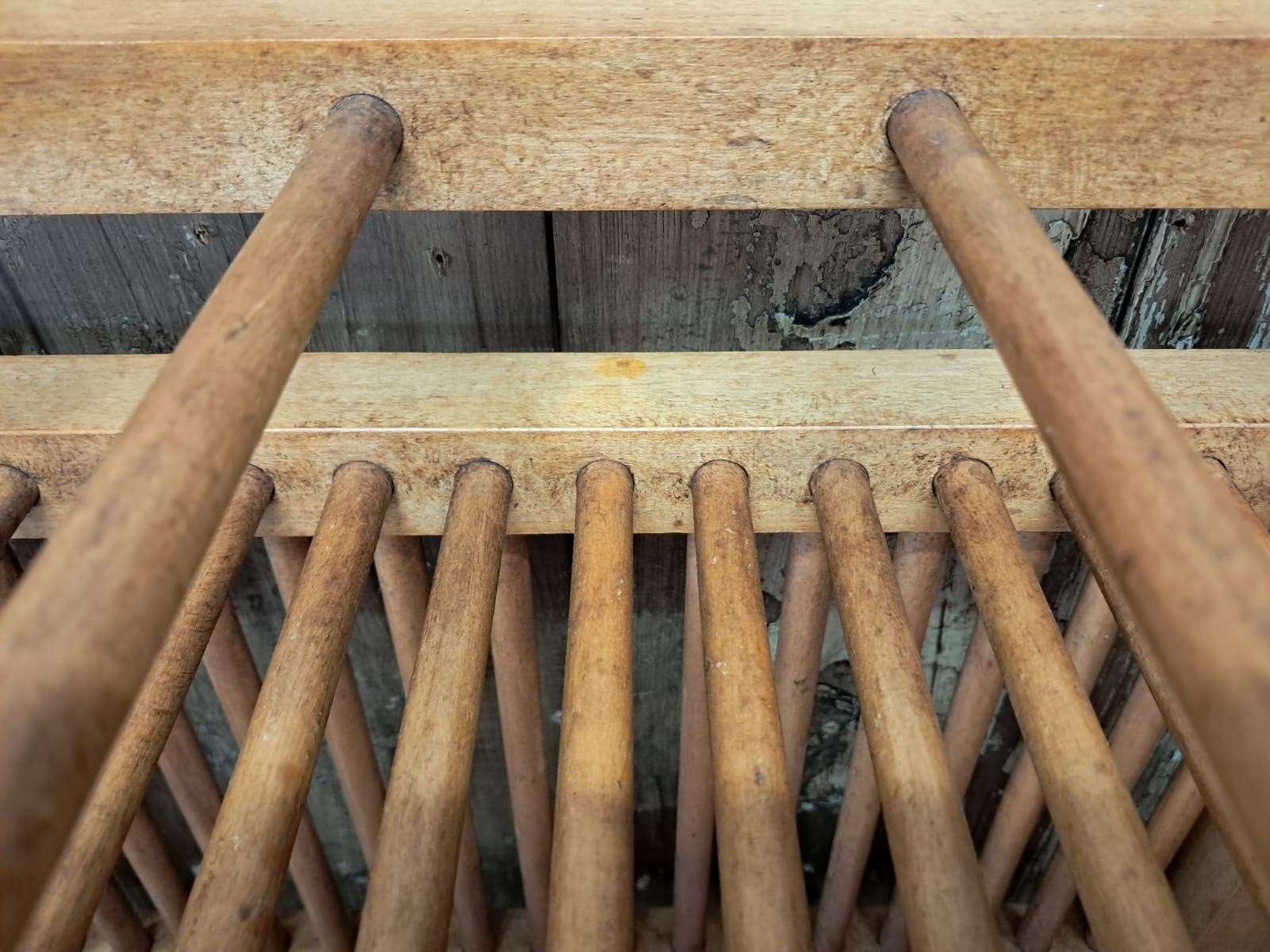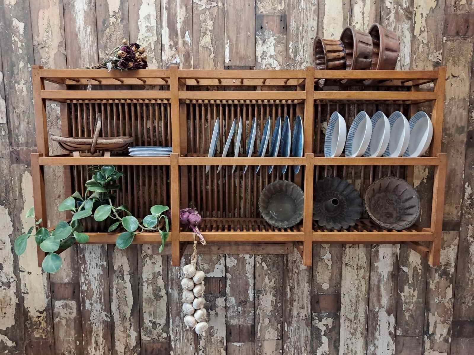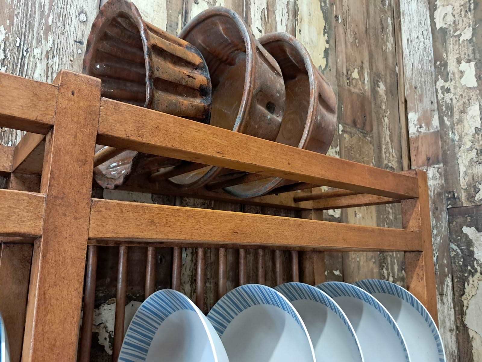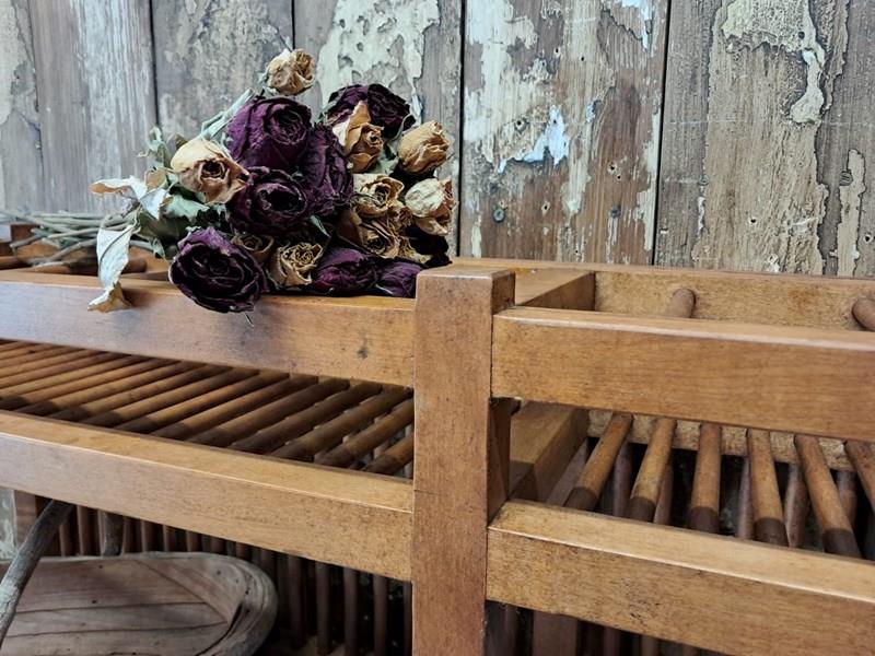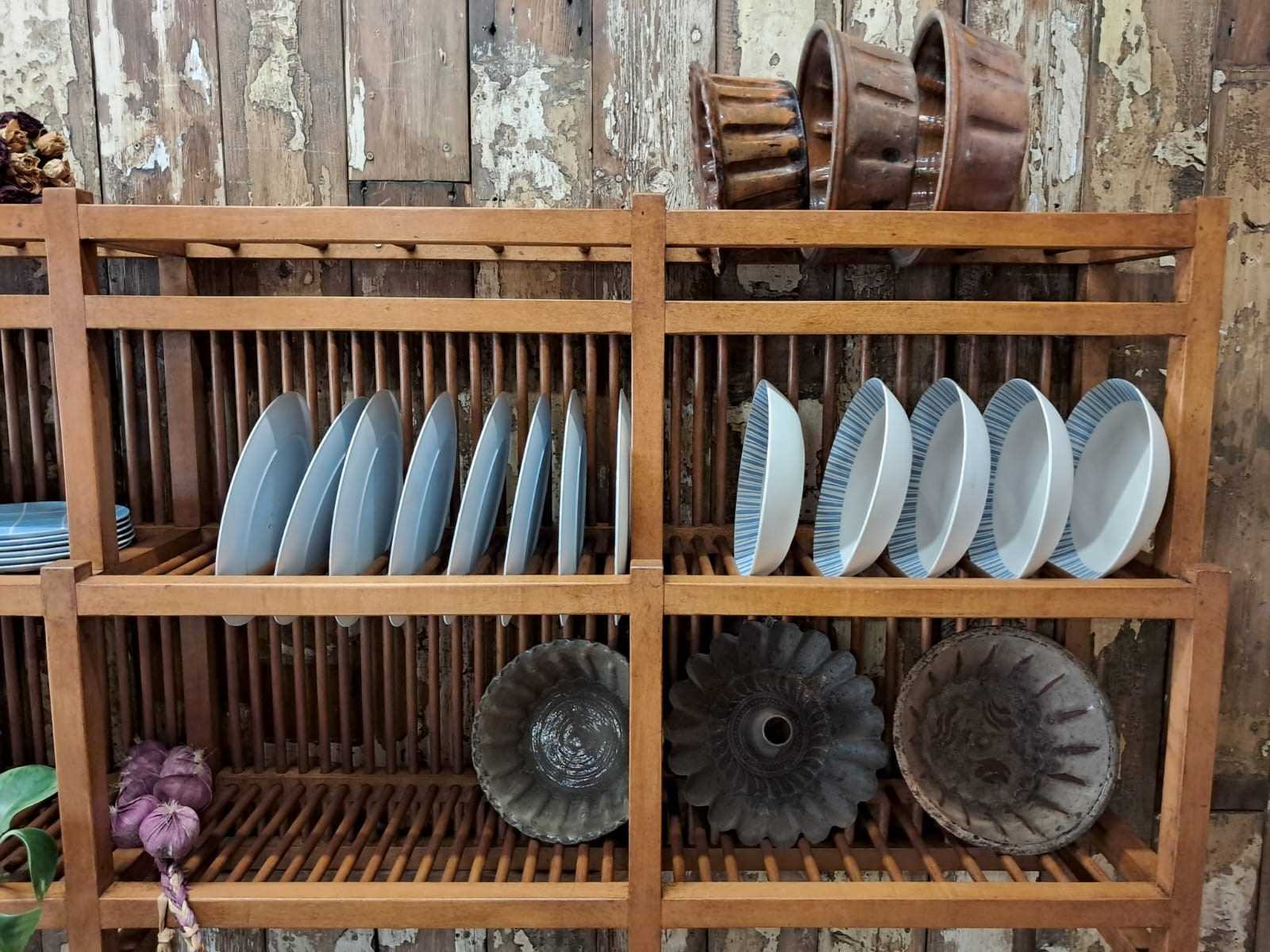 Two bottom tiers have 18 dowels for plates, the top is in three sections each with 5 dowels suitable for bowls.