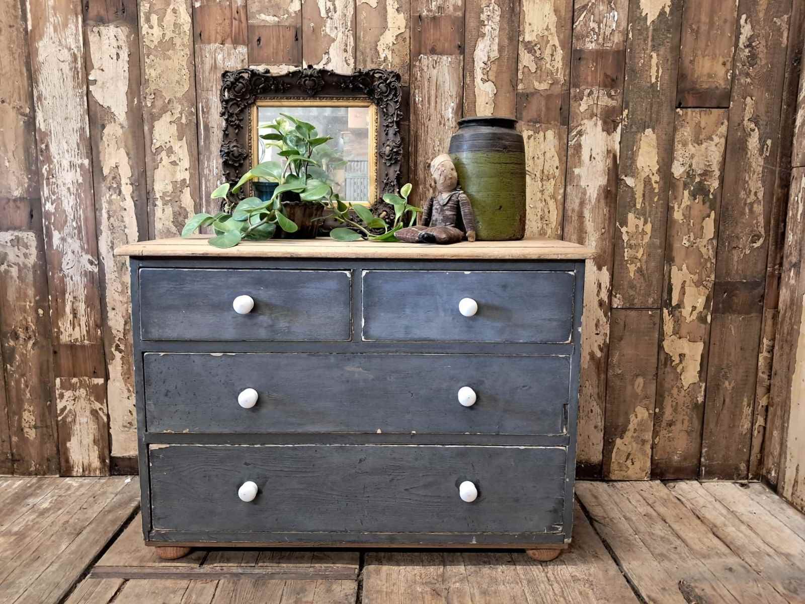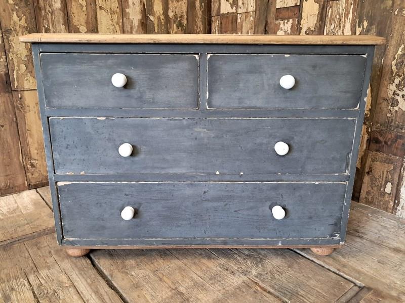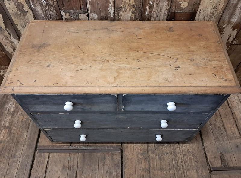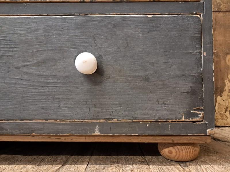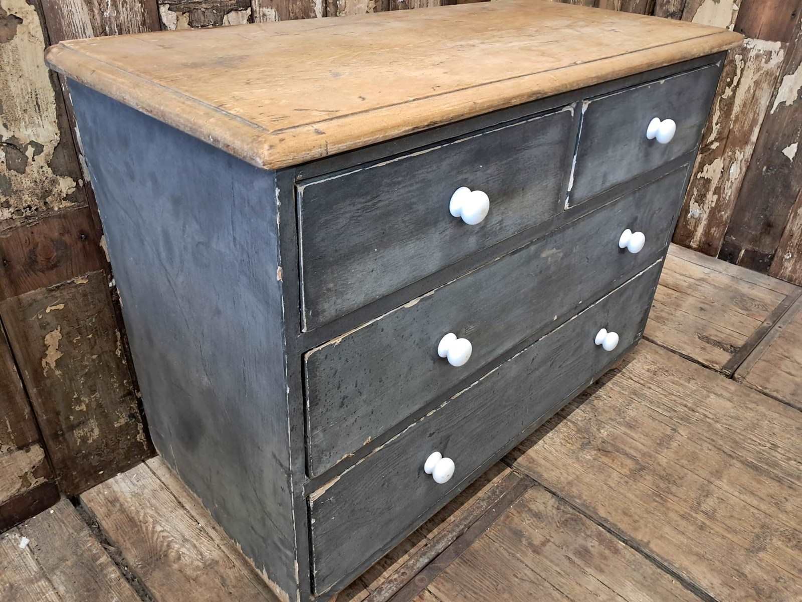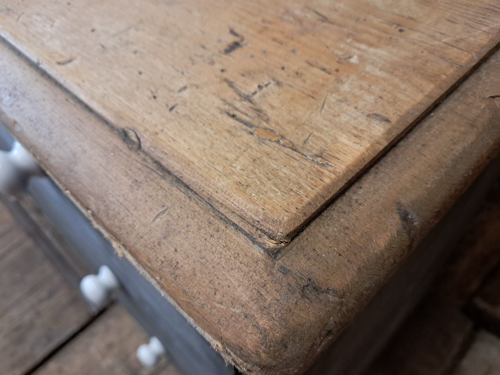 Beautifully faded grey finish with heavy bleached oak top, original porcelain knobs and bun feet.