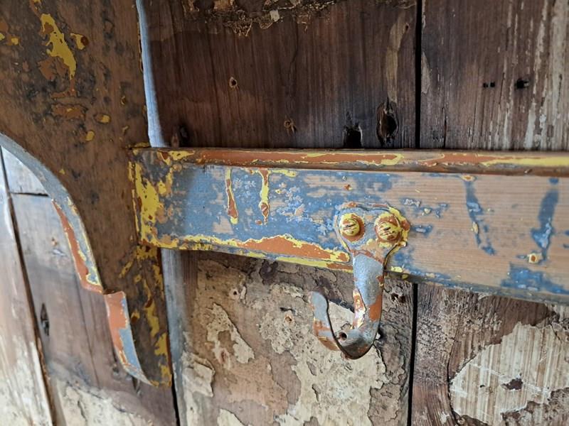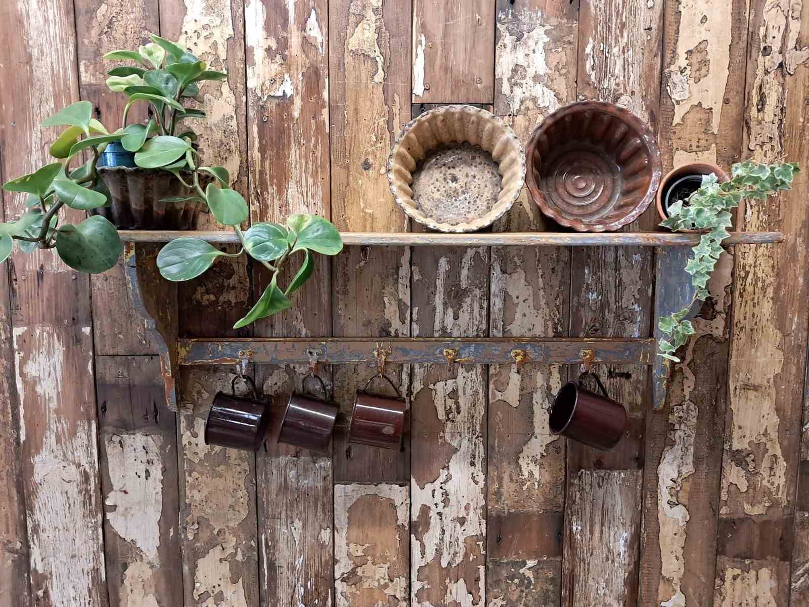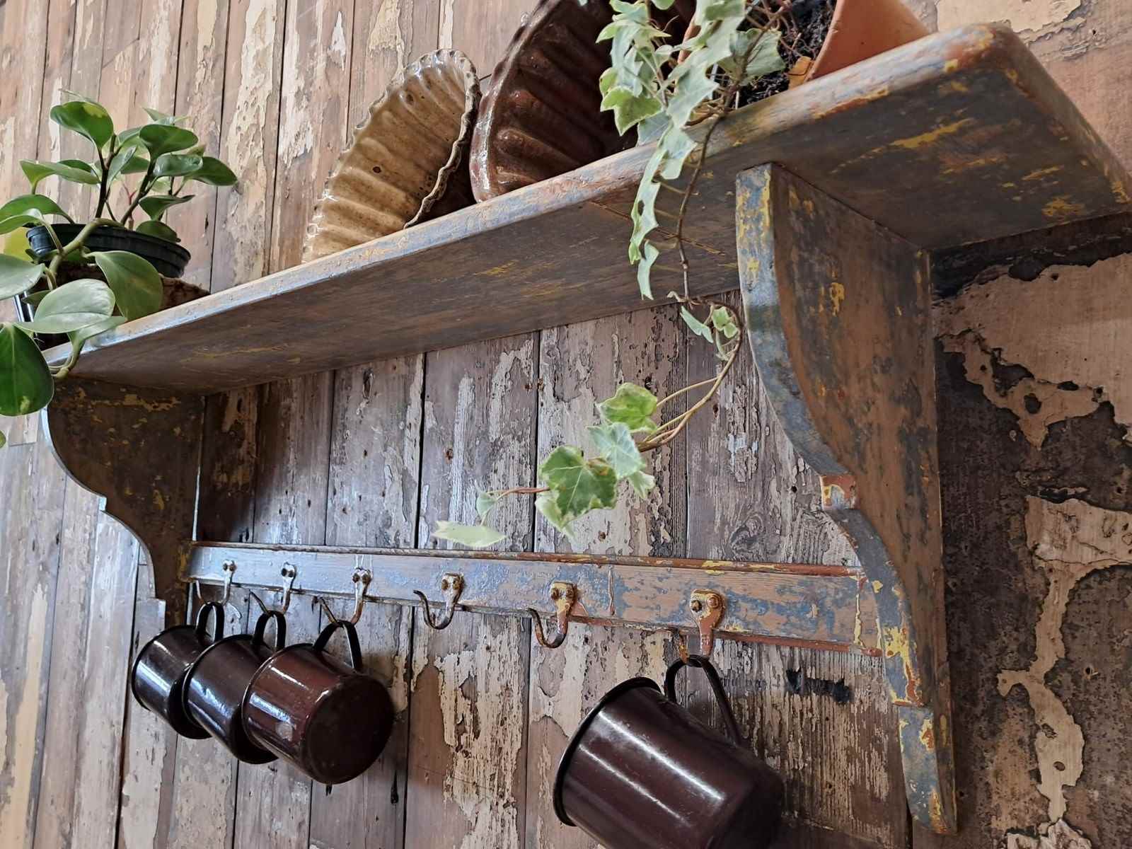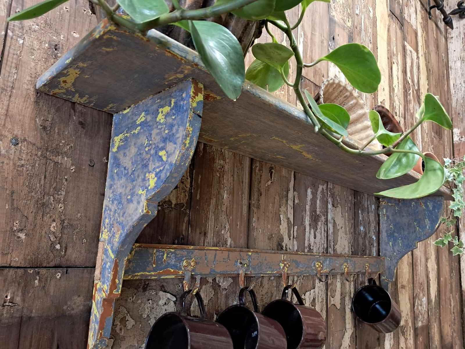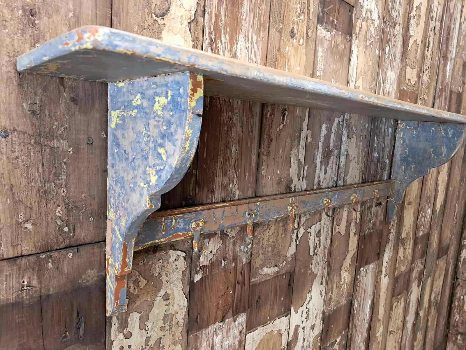 A 1940’s rustic French kitchen shelf with a set of six hooks.