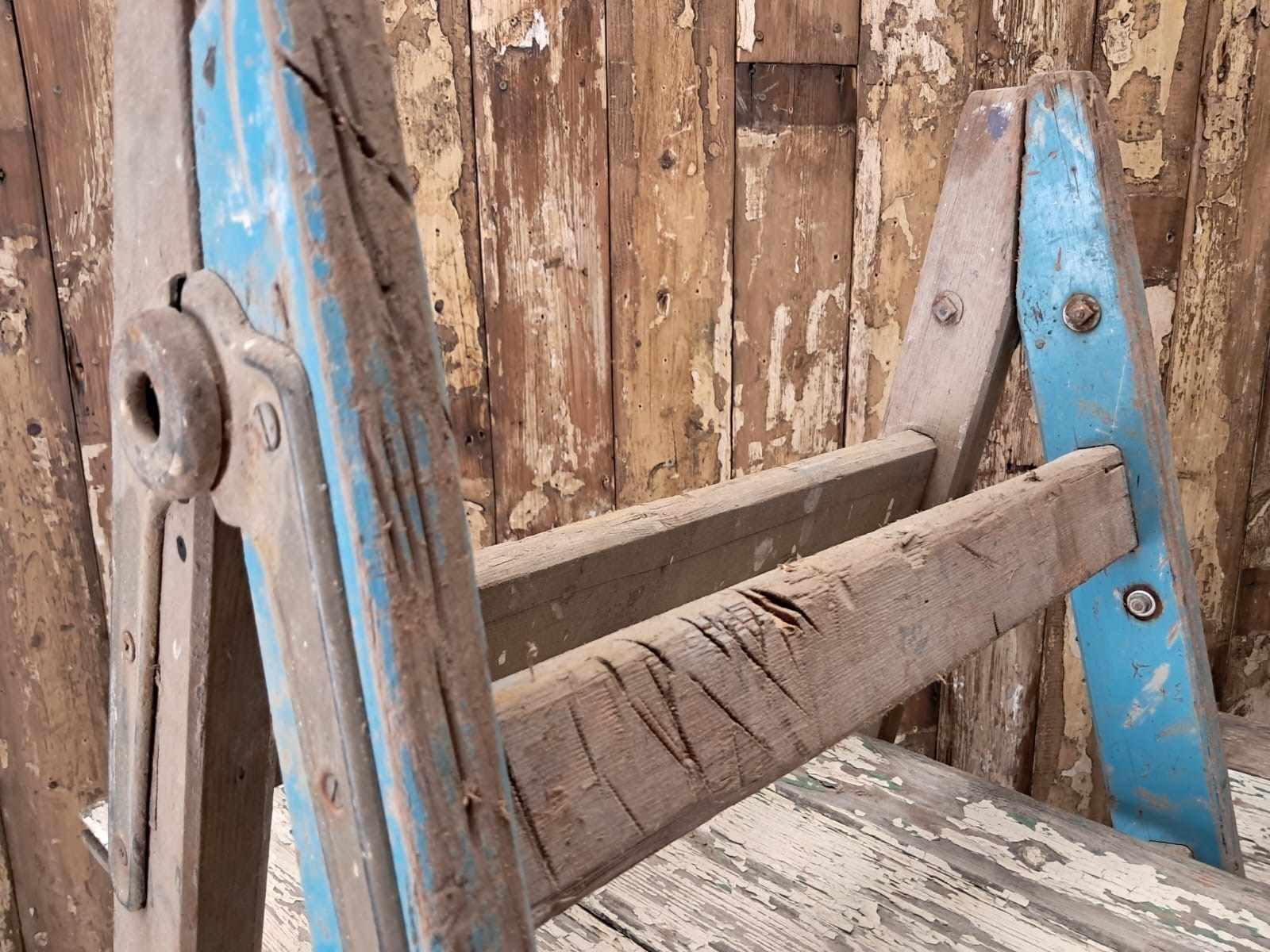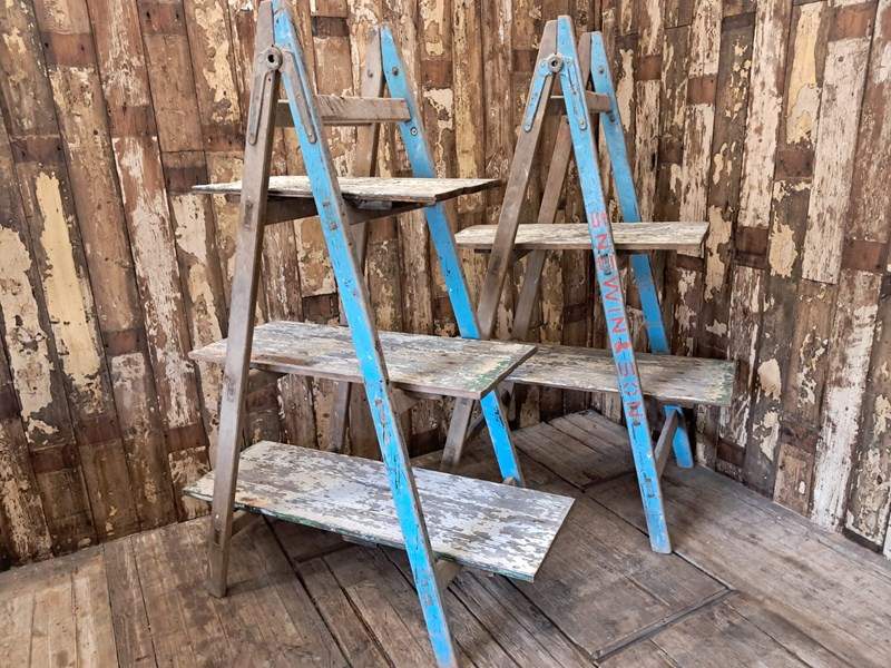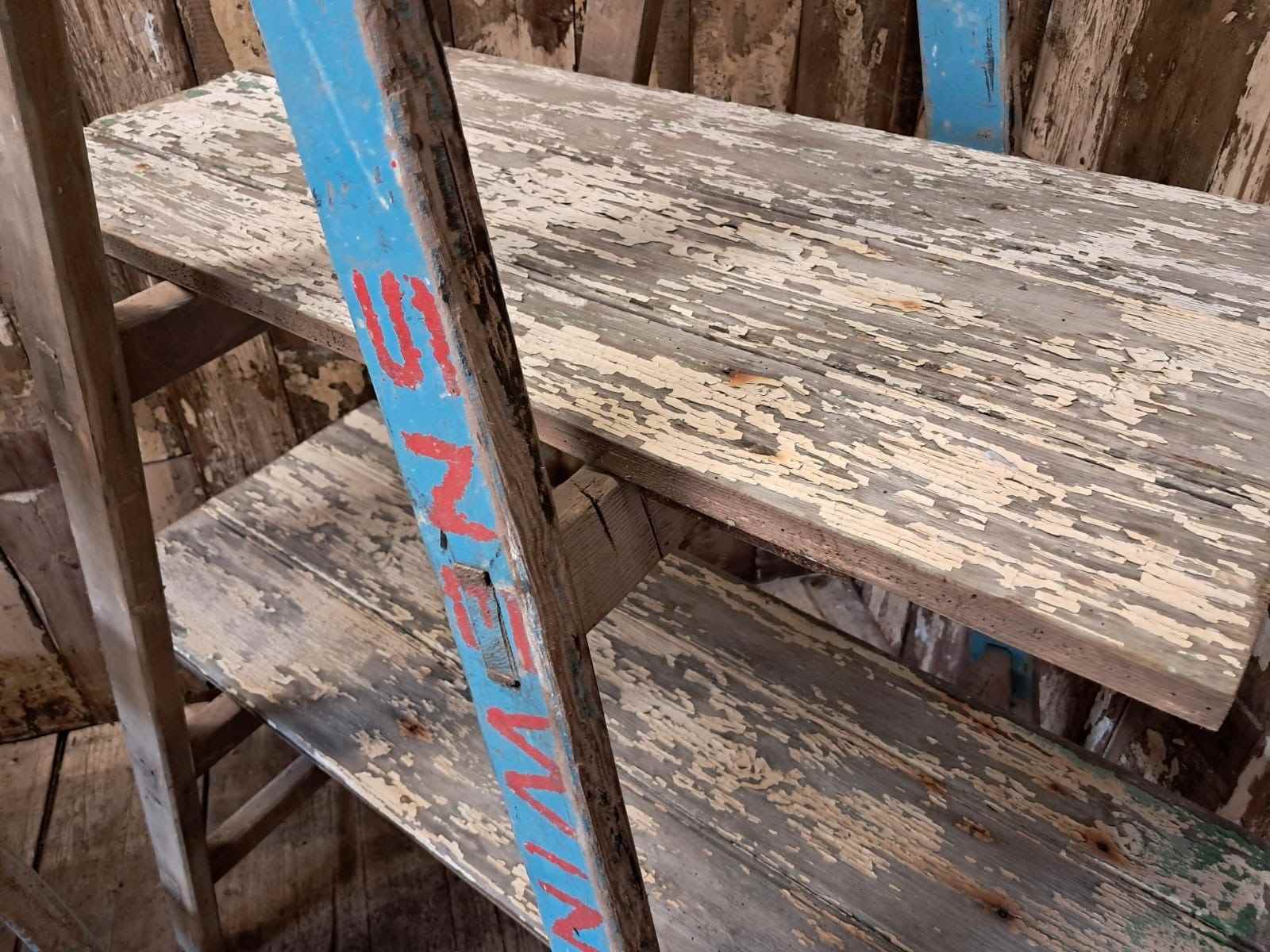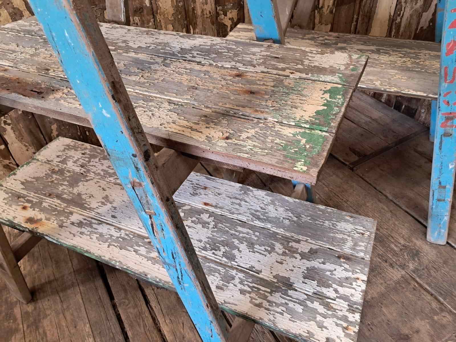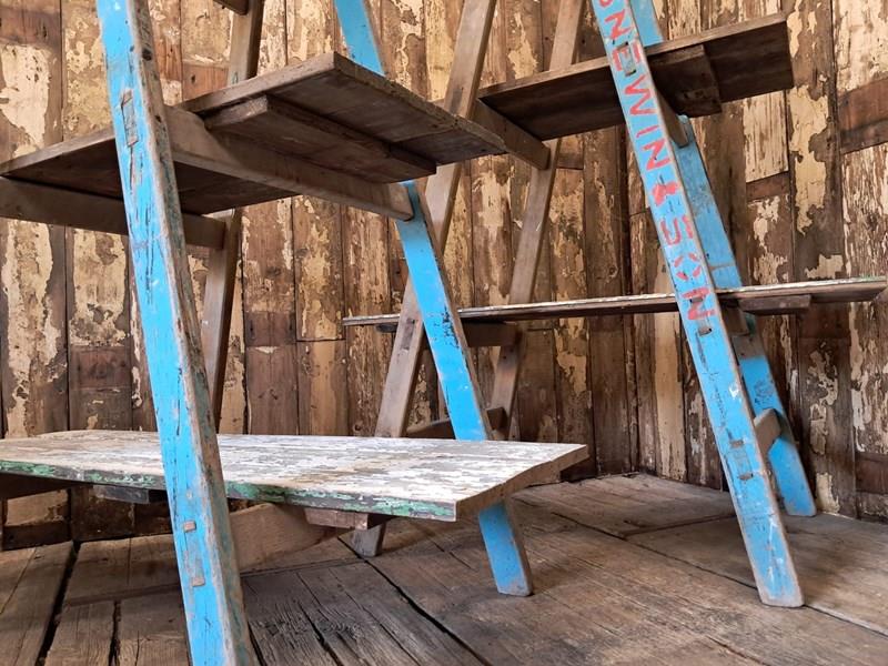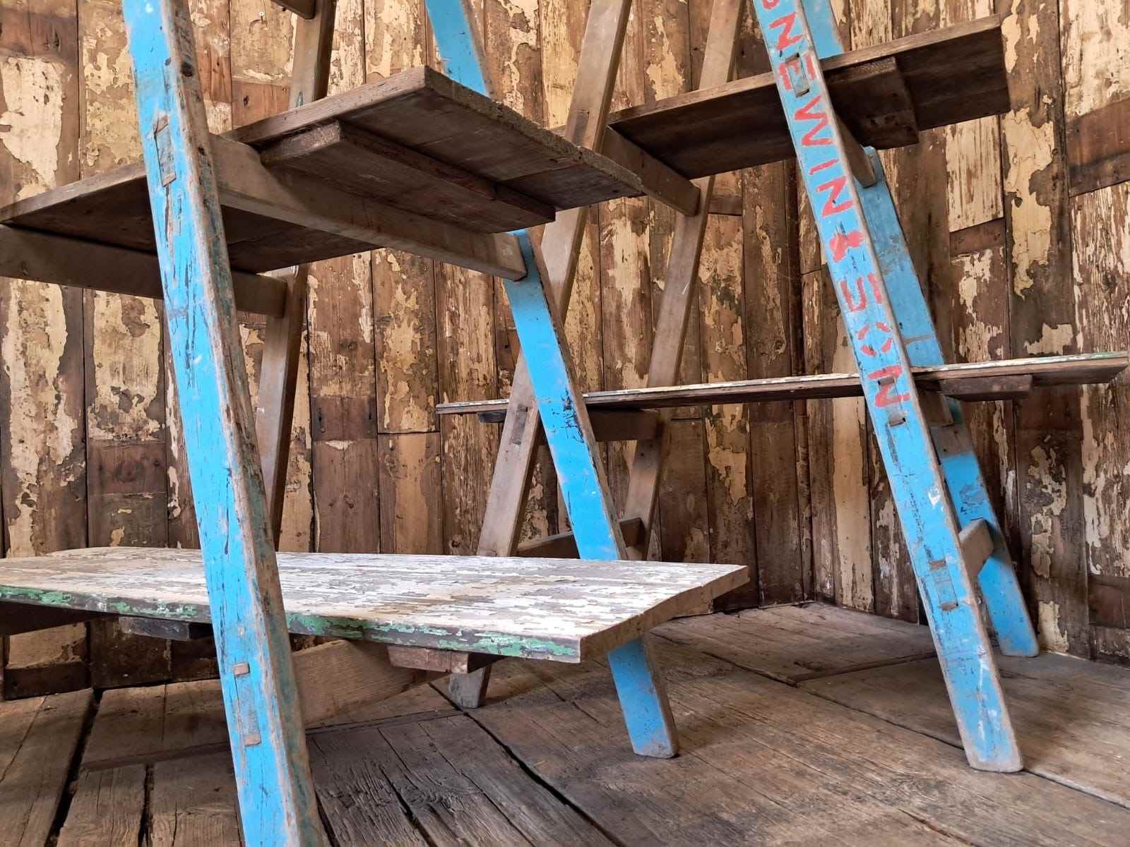 A pair of vintage wooden trestles in well worn blue paint with 5 chippy paint wooden shelves.