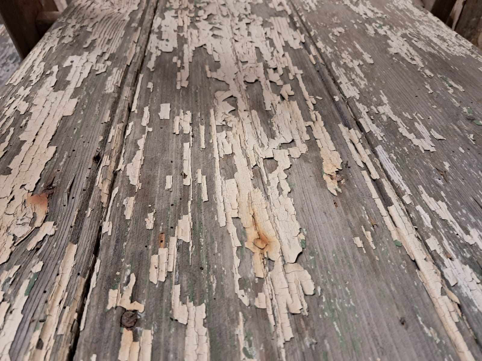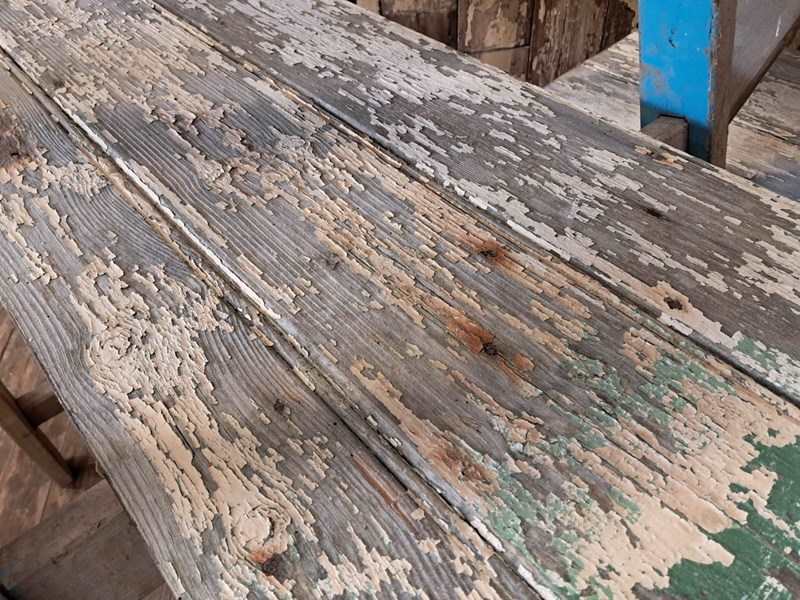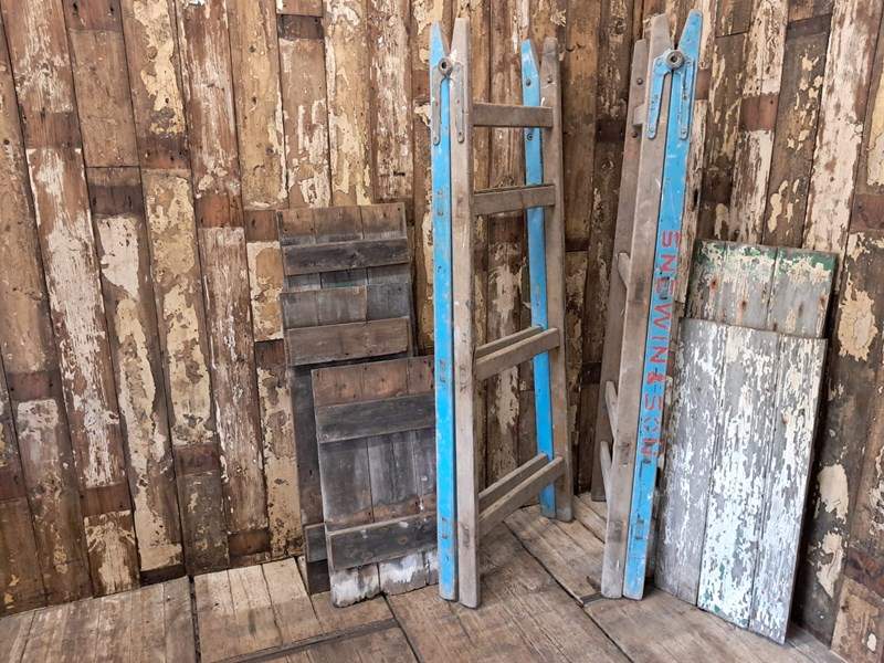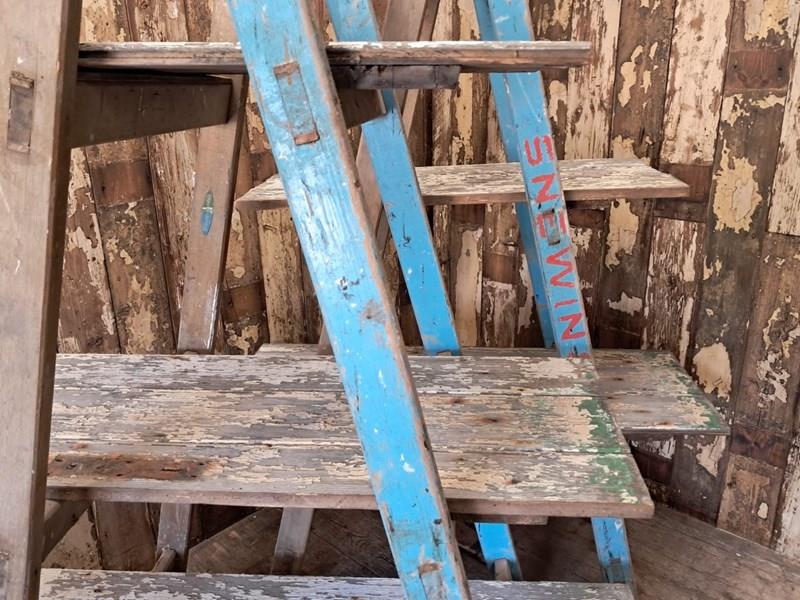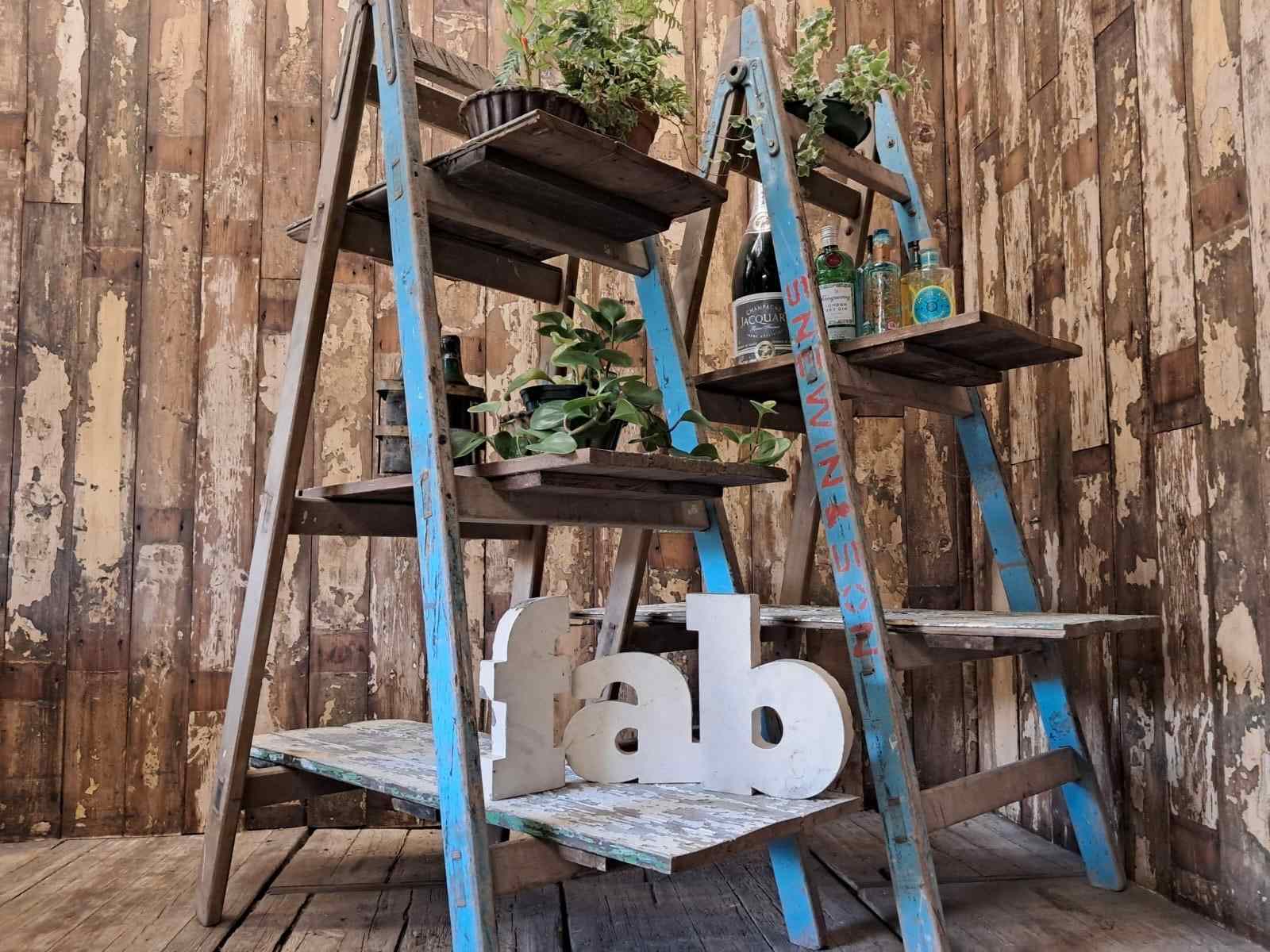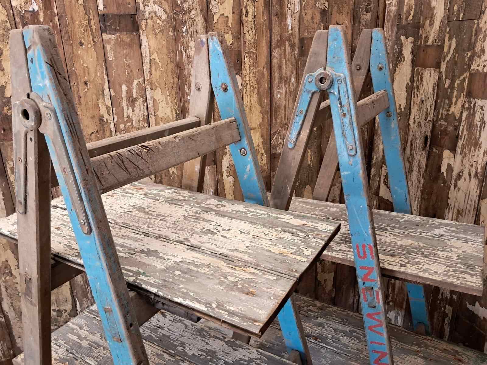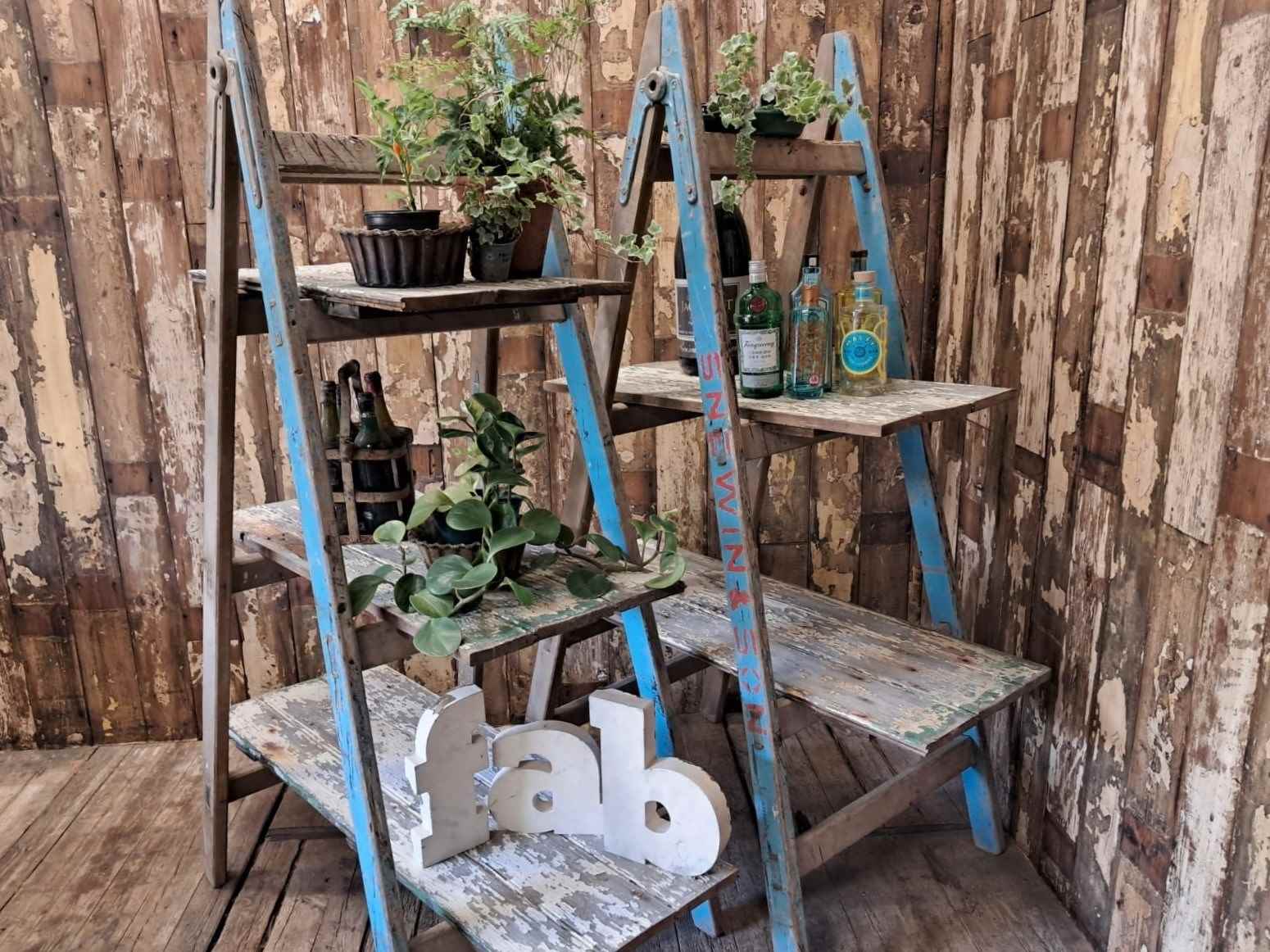 A pair of vintage wooden trestles in well worn blue paint with 5 chippy paint wooden shelves.