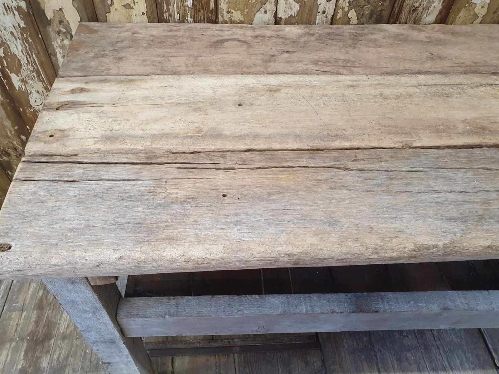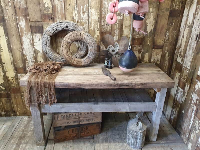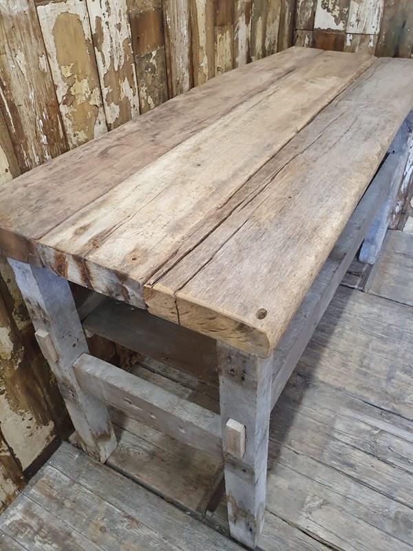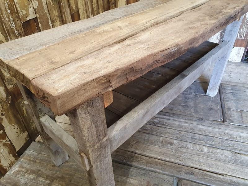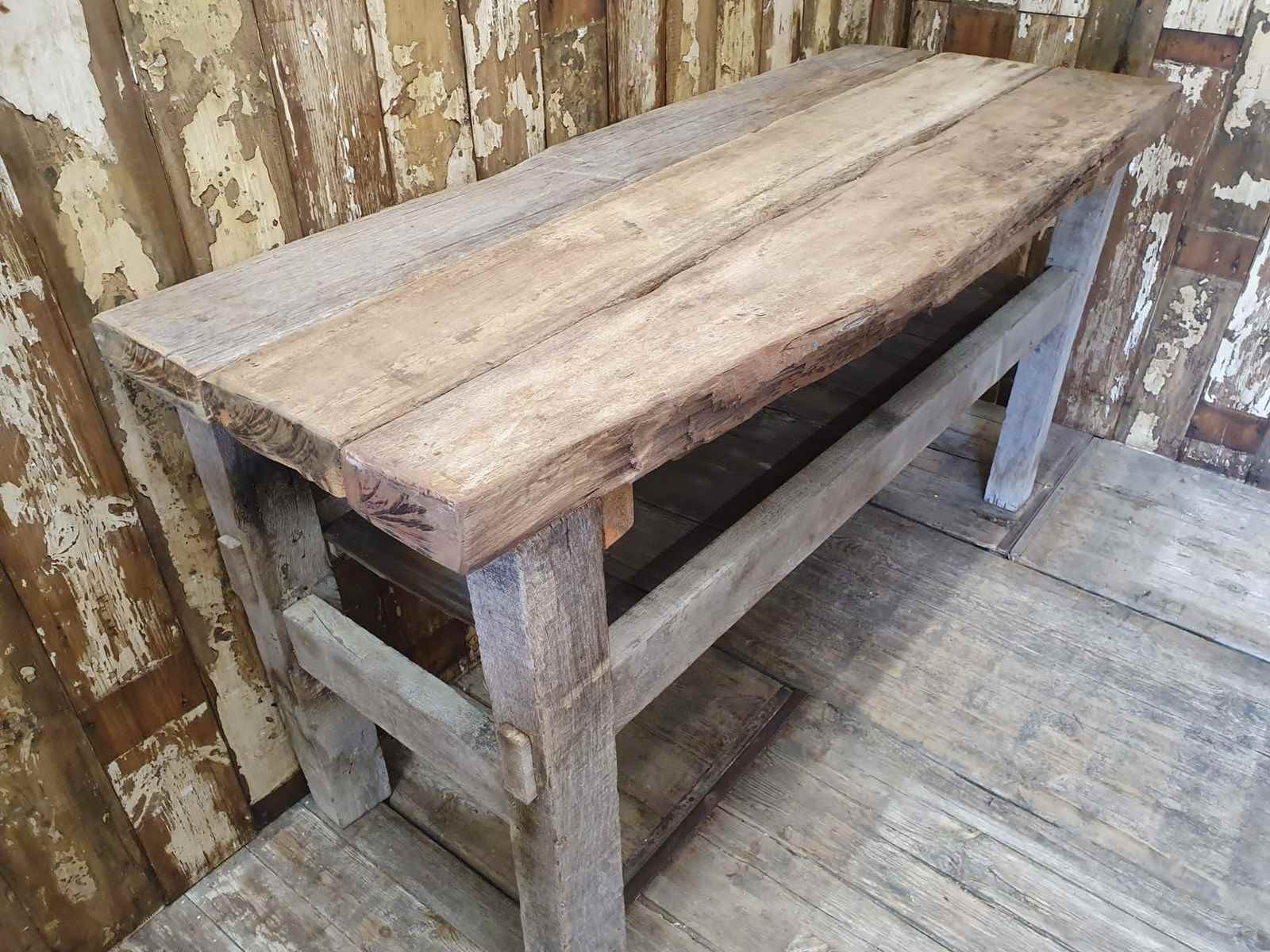 Made from reclaimed dock side timbers, giving it a wonderfully bleached, rugged and well worn look, this incredibly sturdy and robust bench makes a great kitchen centrepiece.