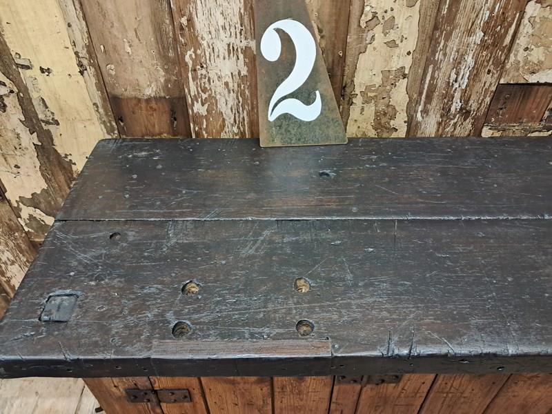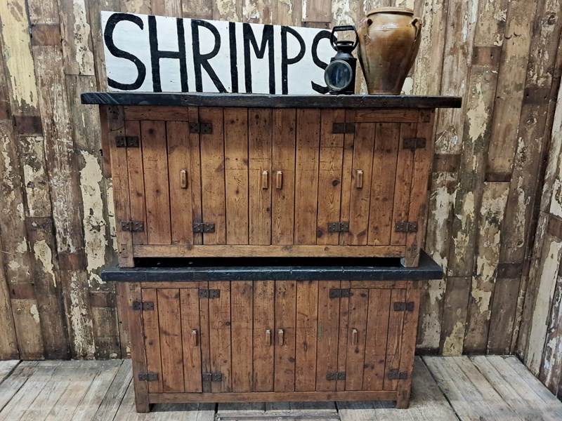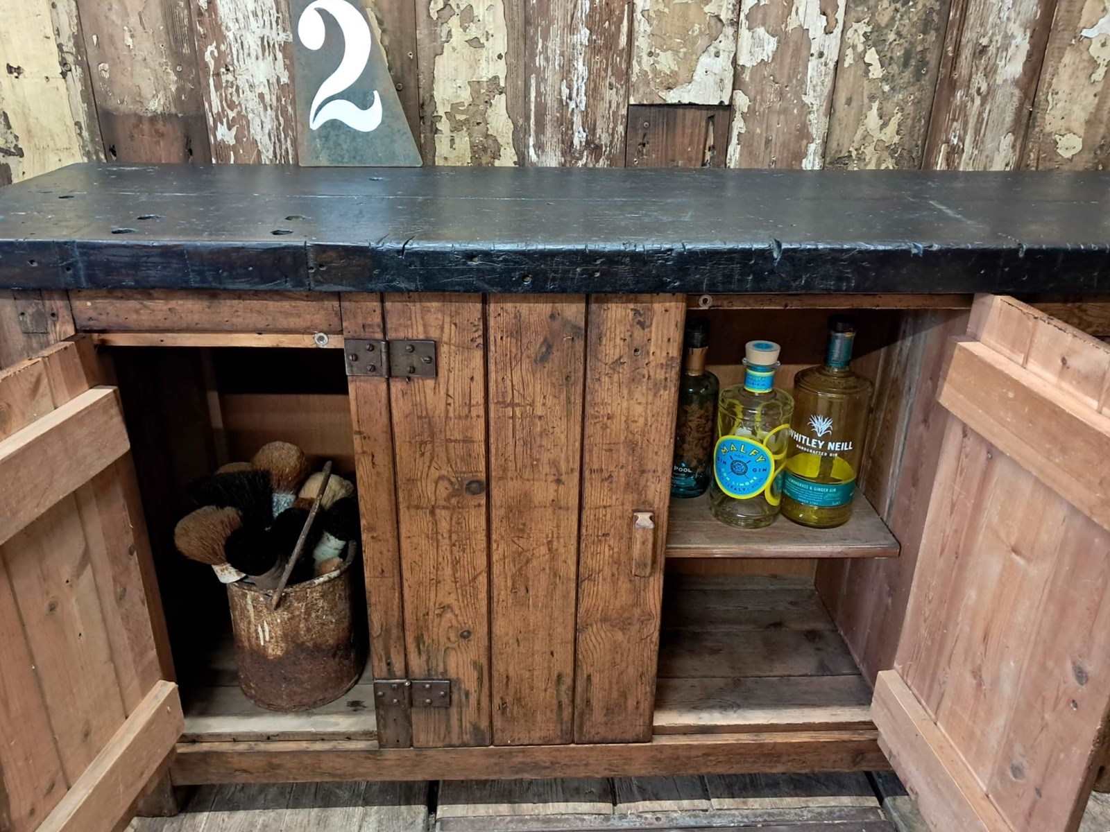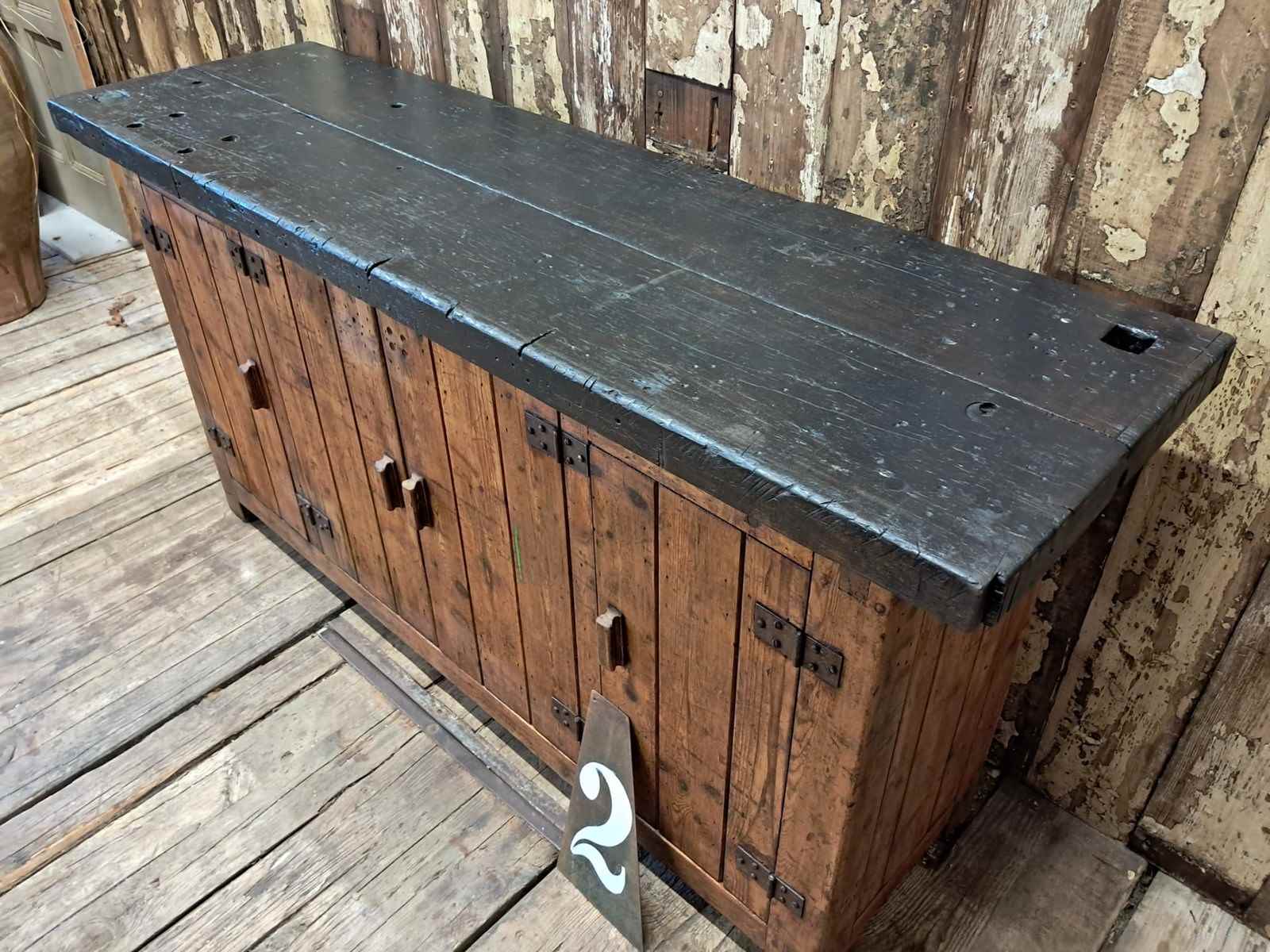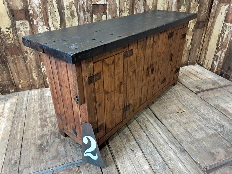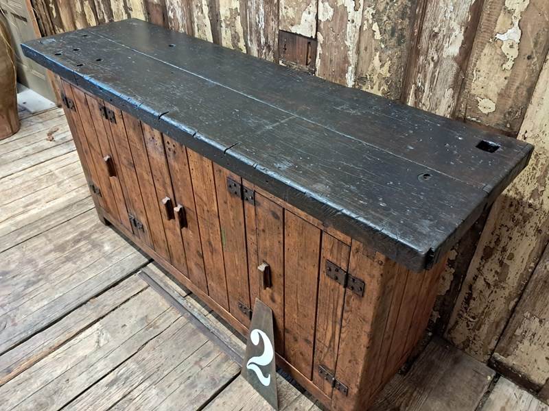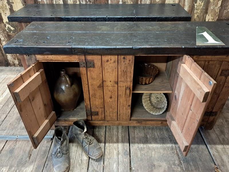 A pair of large rustic wooden workbenches with cupboard storage underneath.