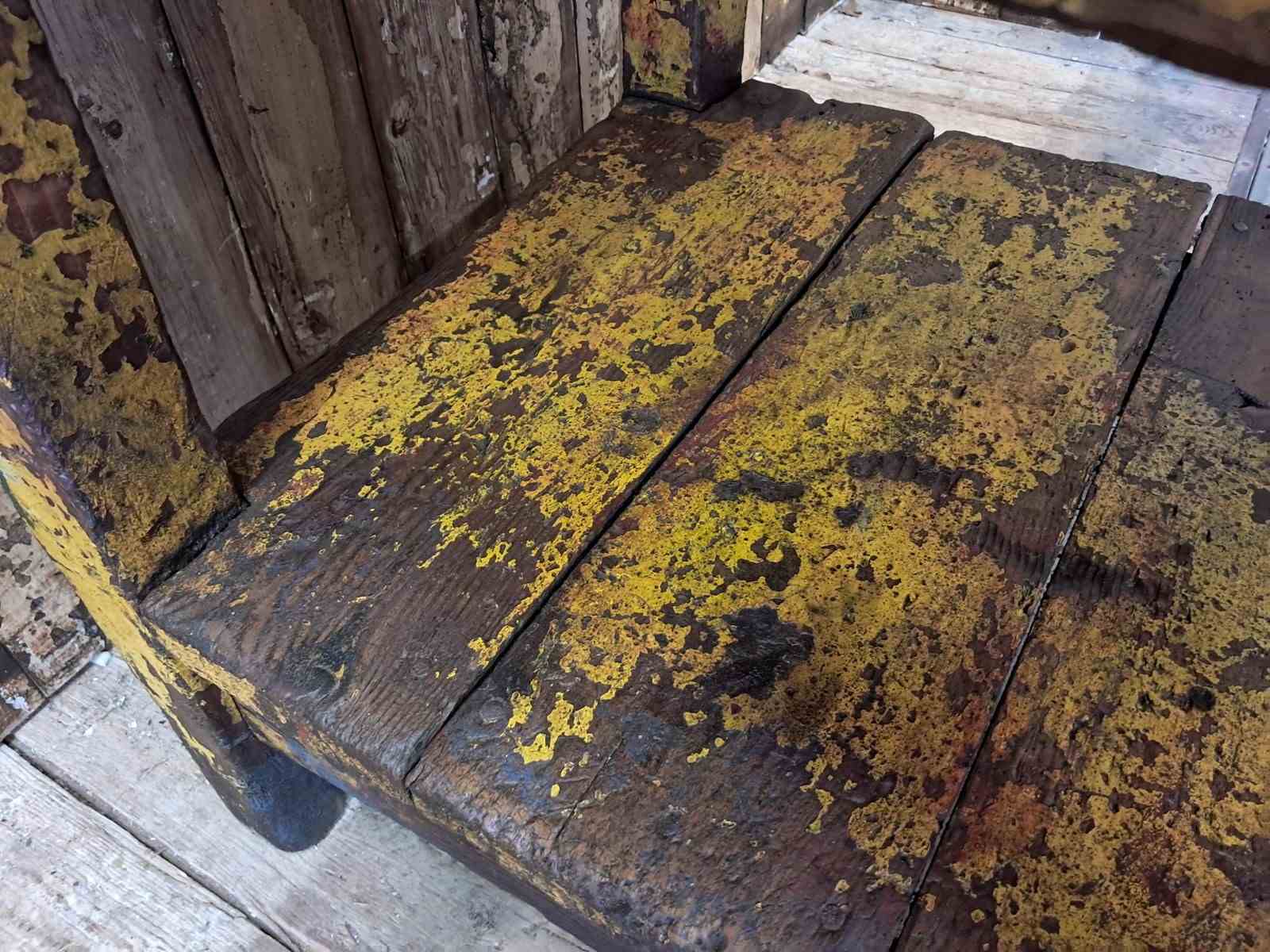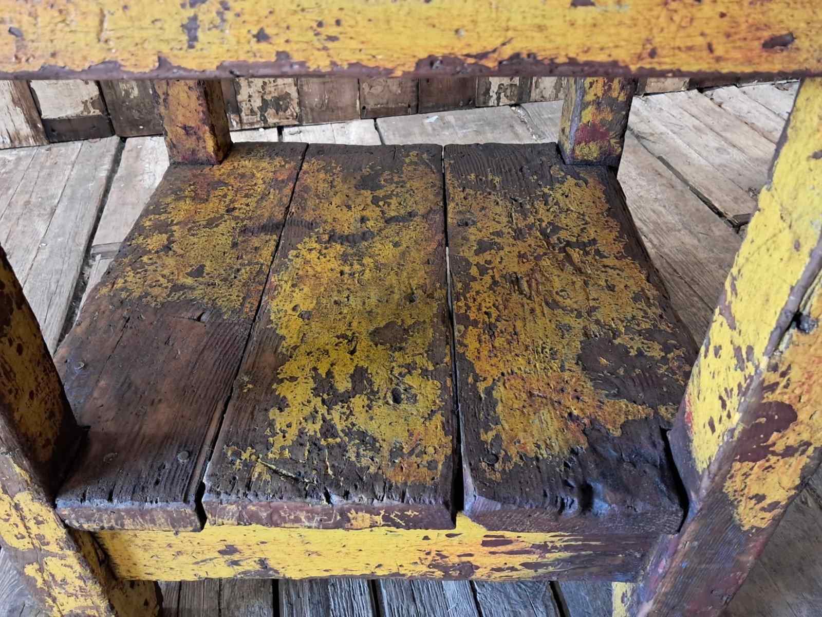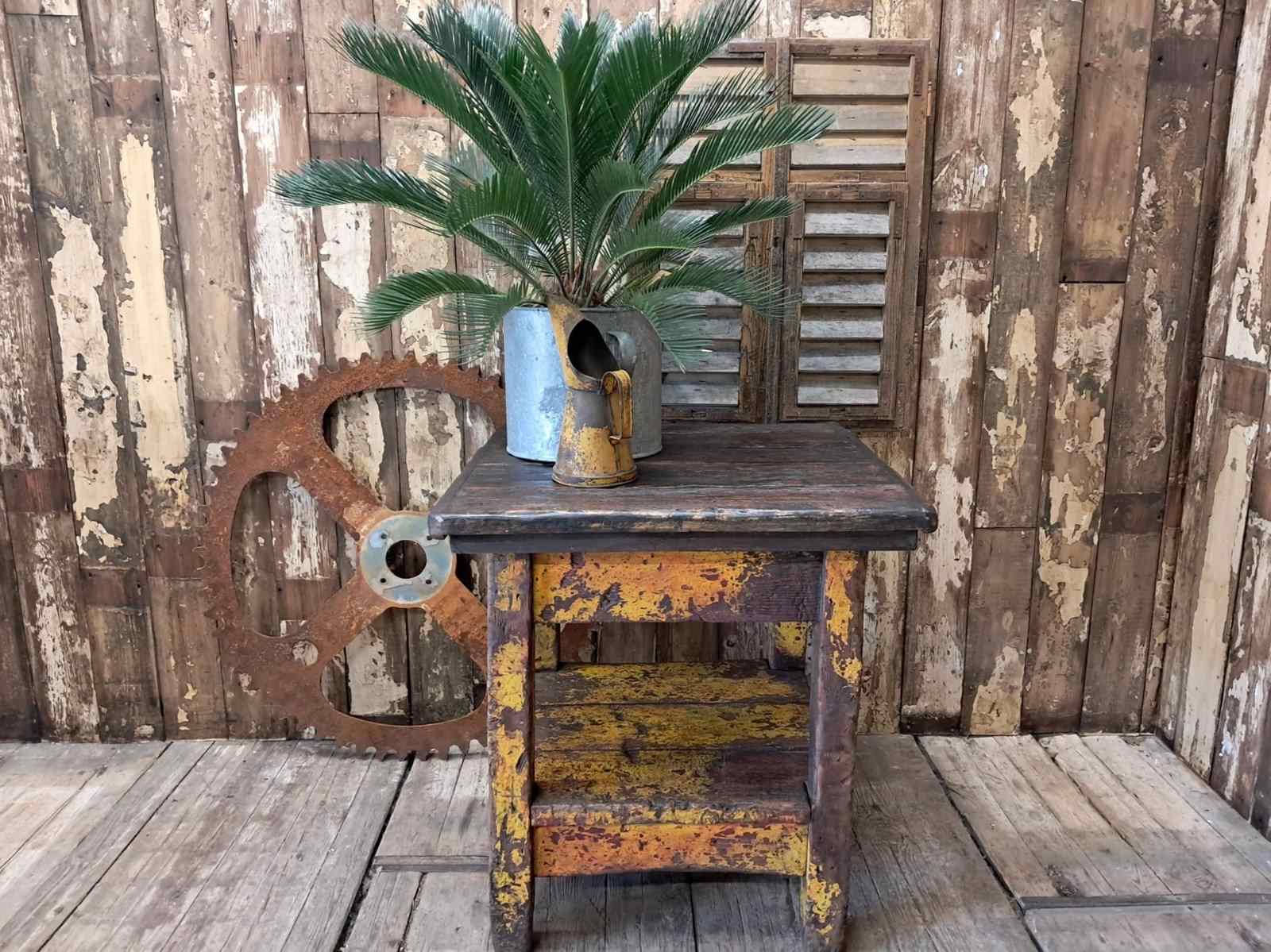 Originally used in boat building yard, this super little table has a bright yellow, chippy paint, chunky framework.