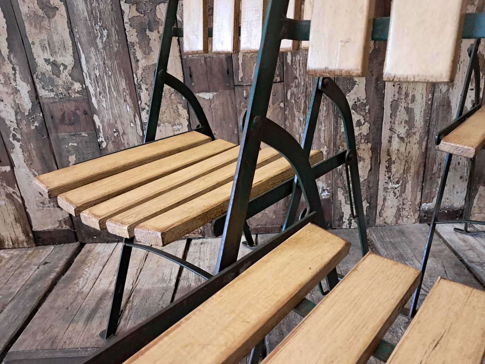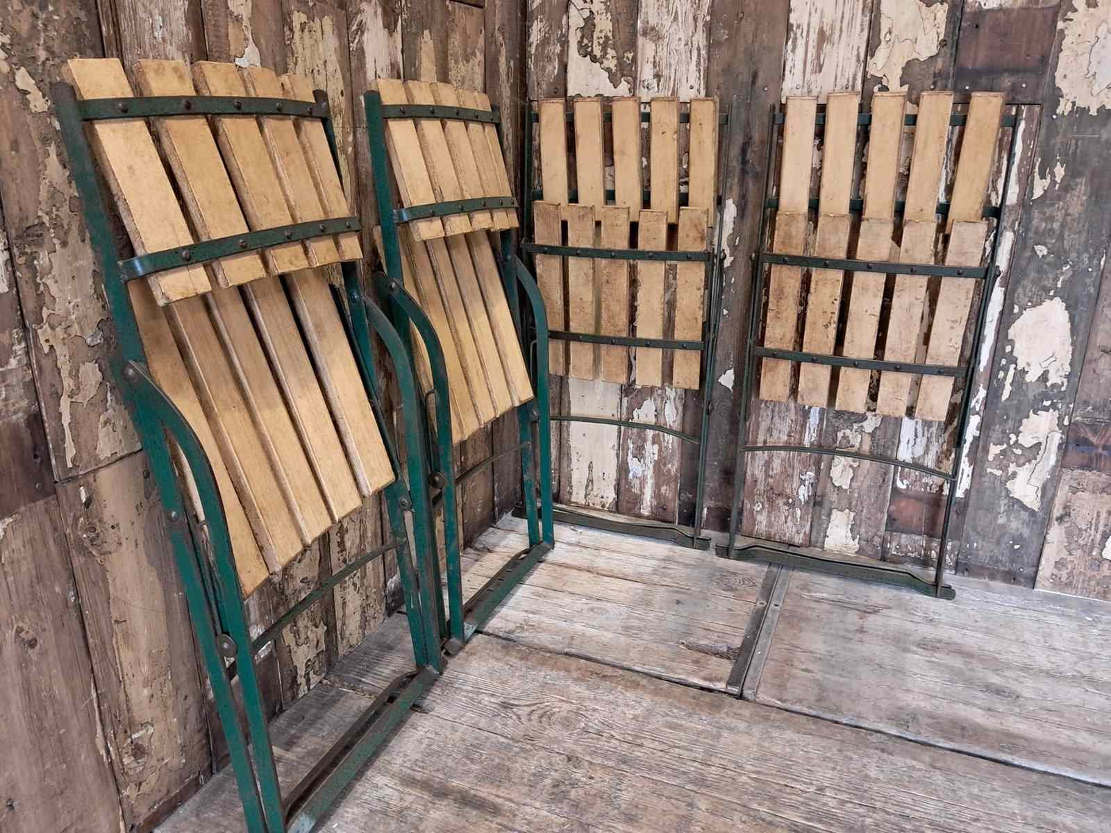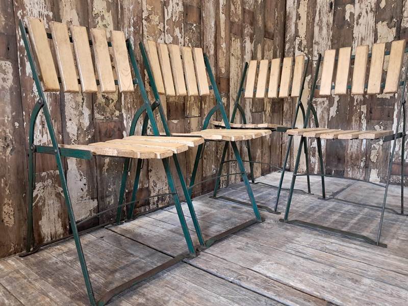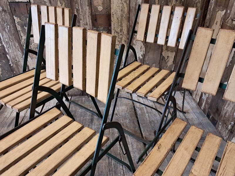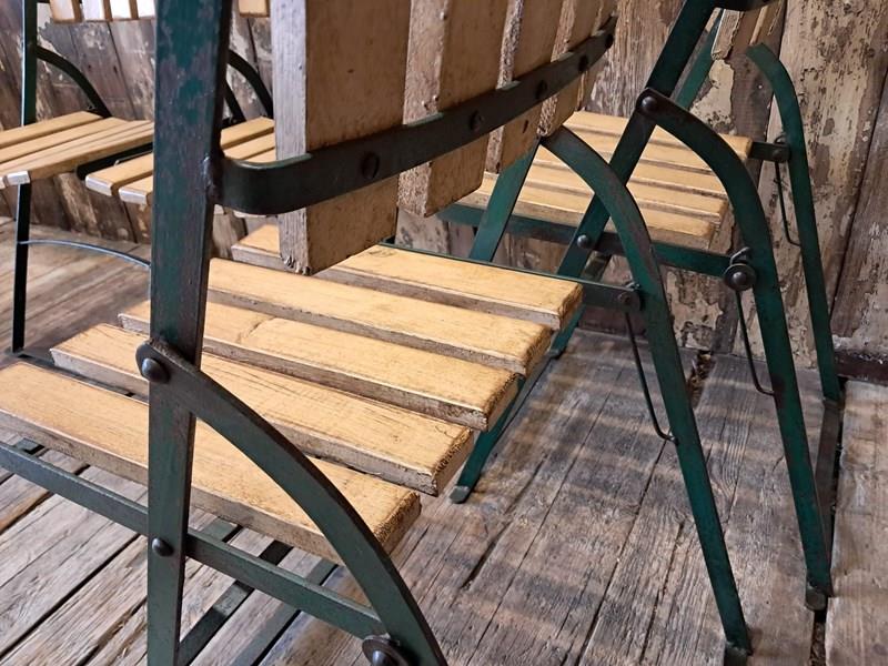 Strong and solid steel frames in lovely deep racing green, with wooden slatted seats and back rests in a creamy yellow.