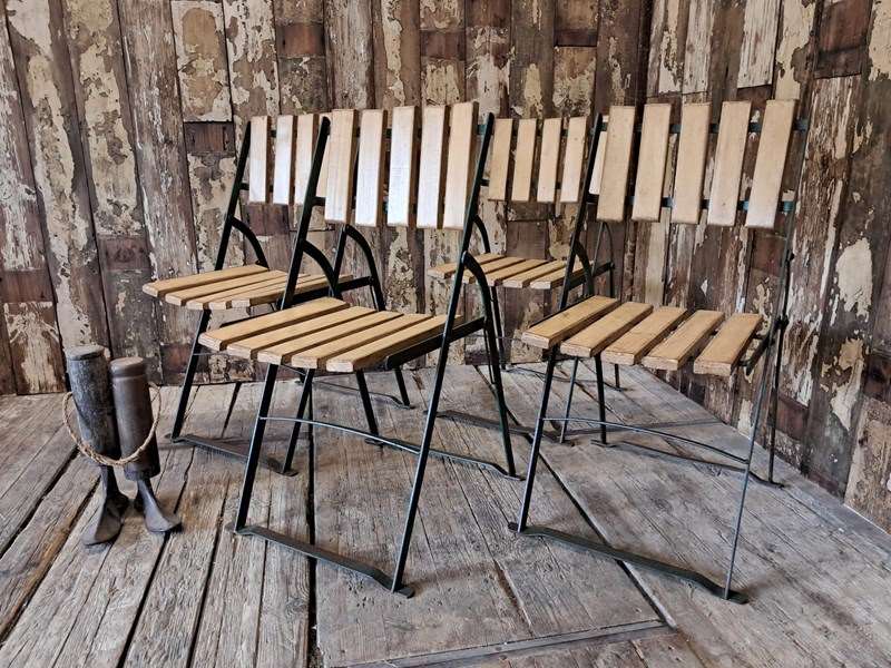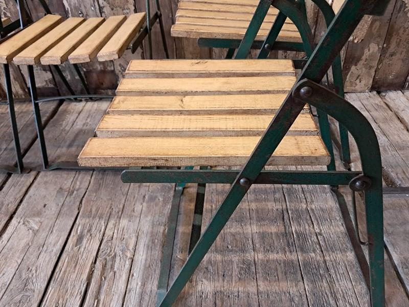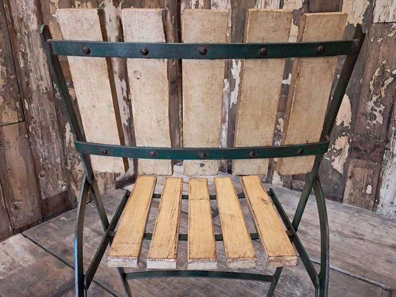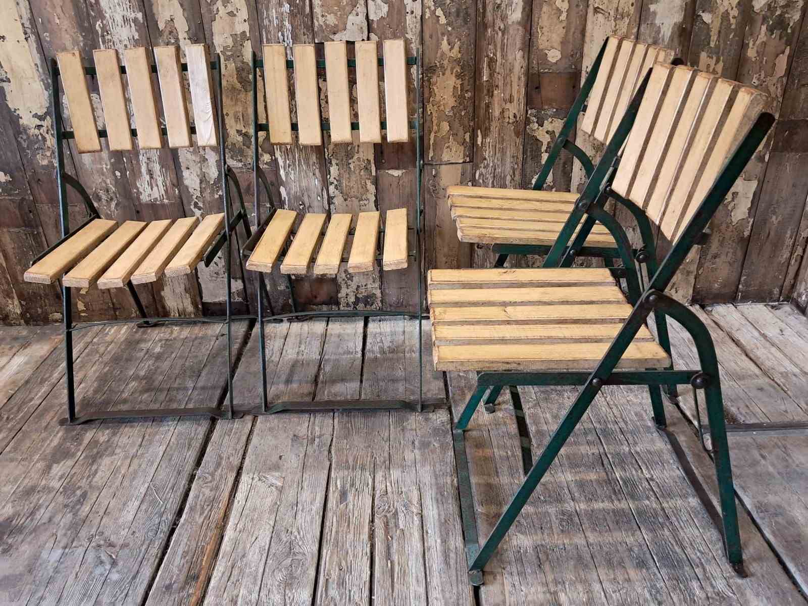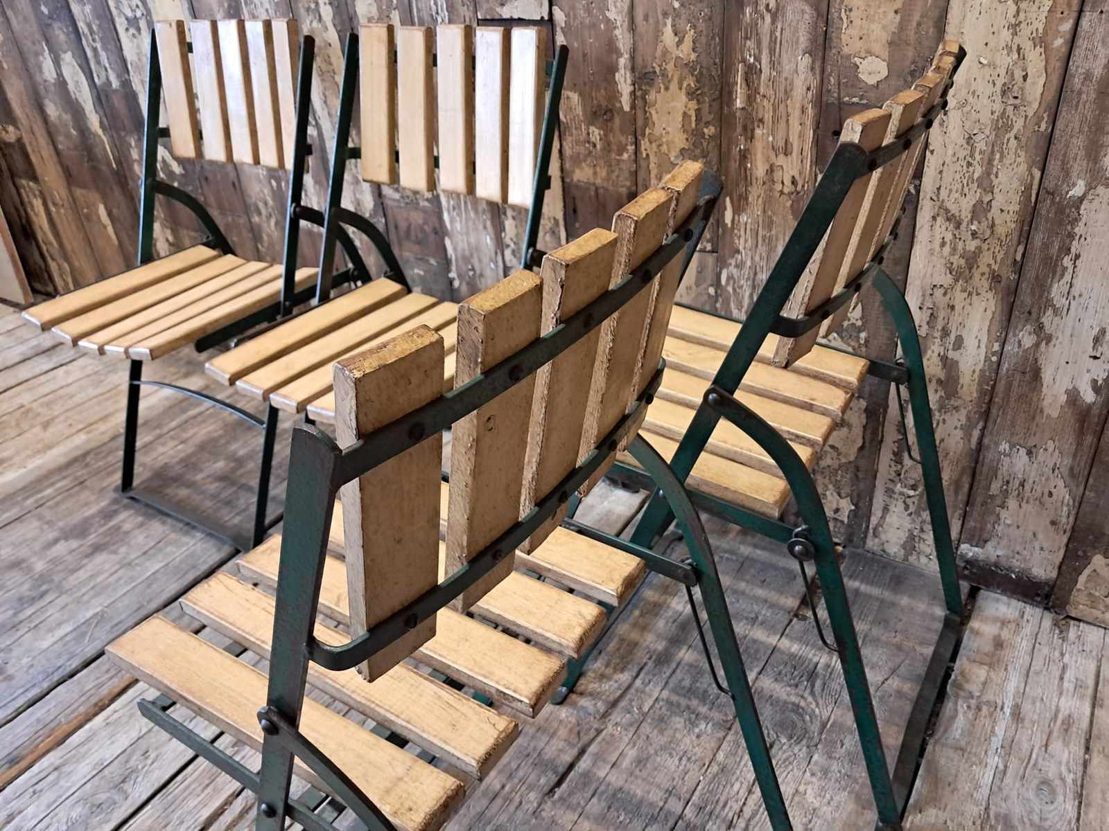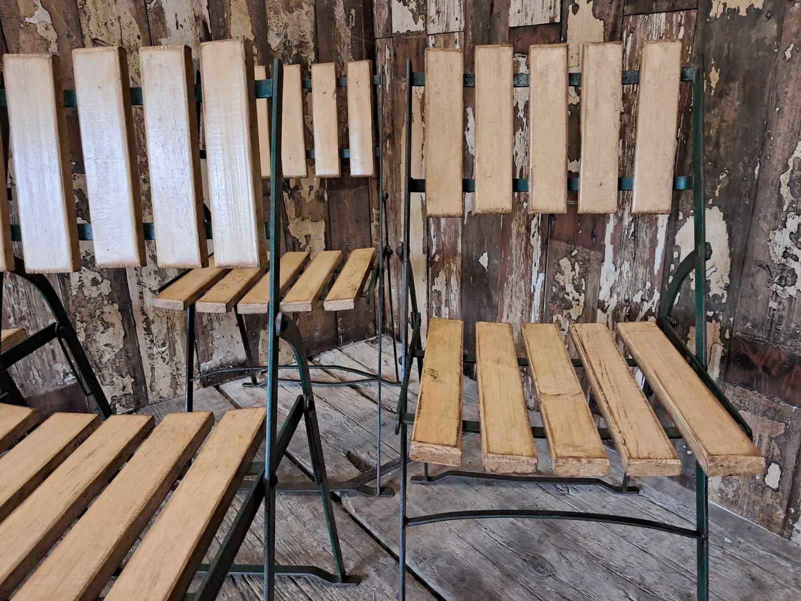 Strong and solid steel frames in lovely deep racing green, with wooden slatted seats and back rests in a creamy yellow.