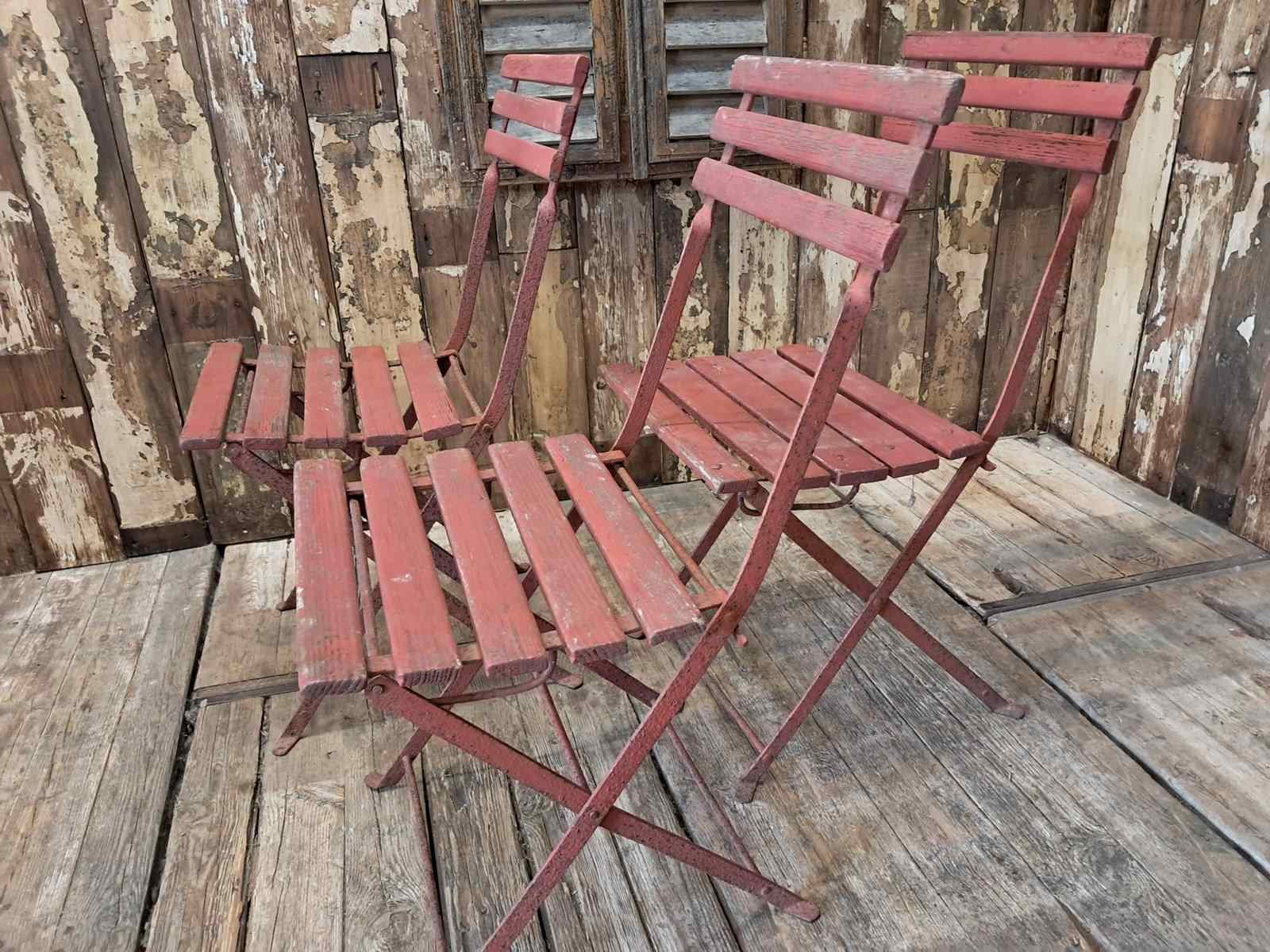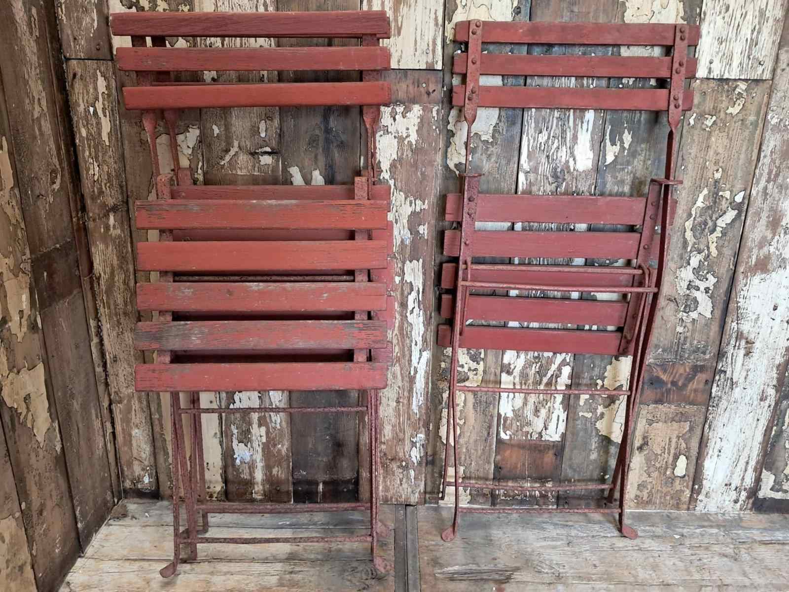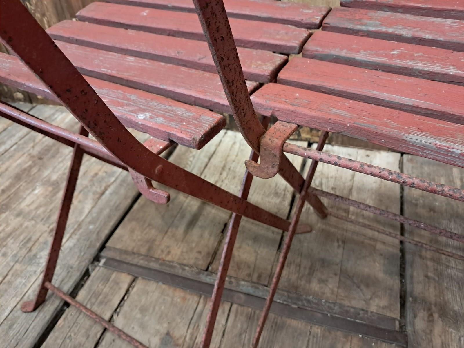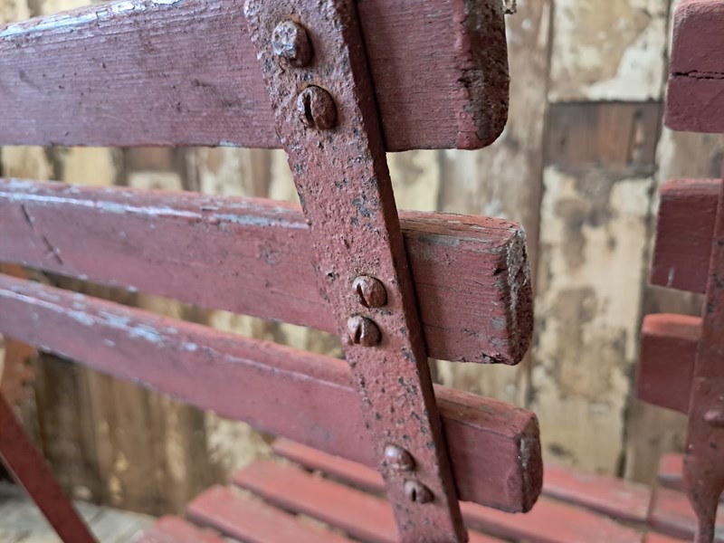 Sturdy metal frame with wooden slatted seat and backrest in muted red.