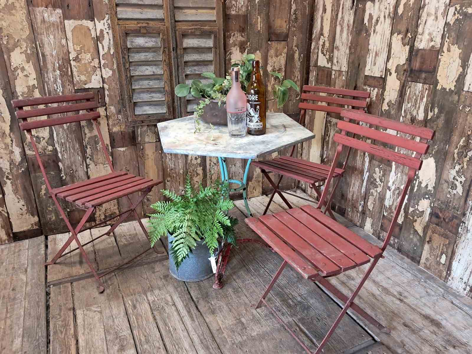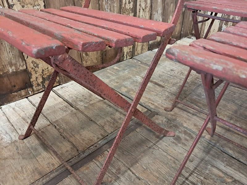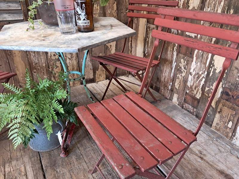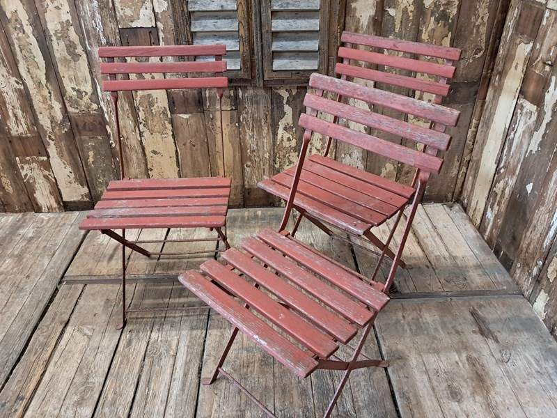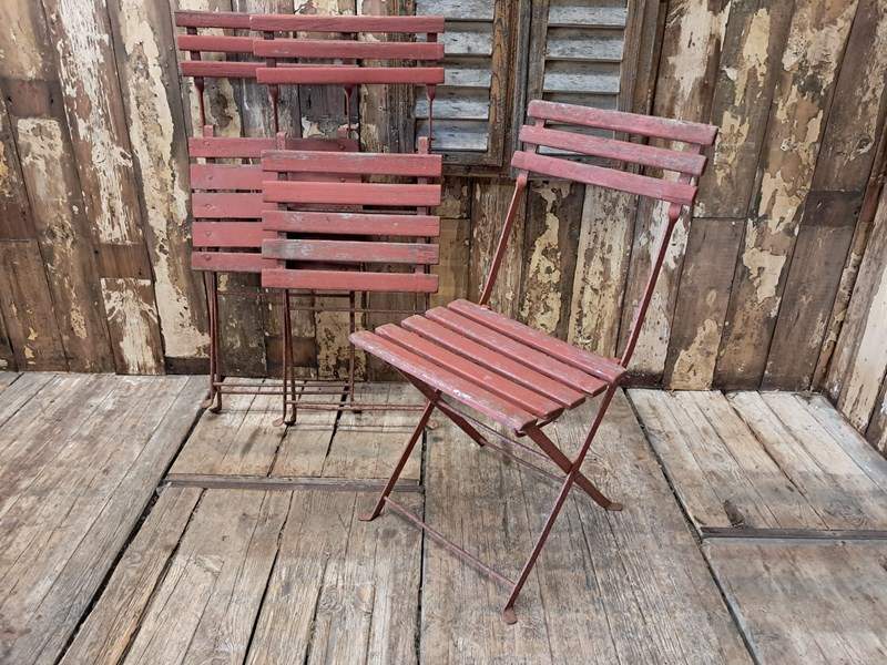 Sturdy metal frame with wooden slatted seat and backrest in muted red.