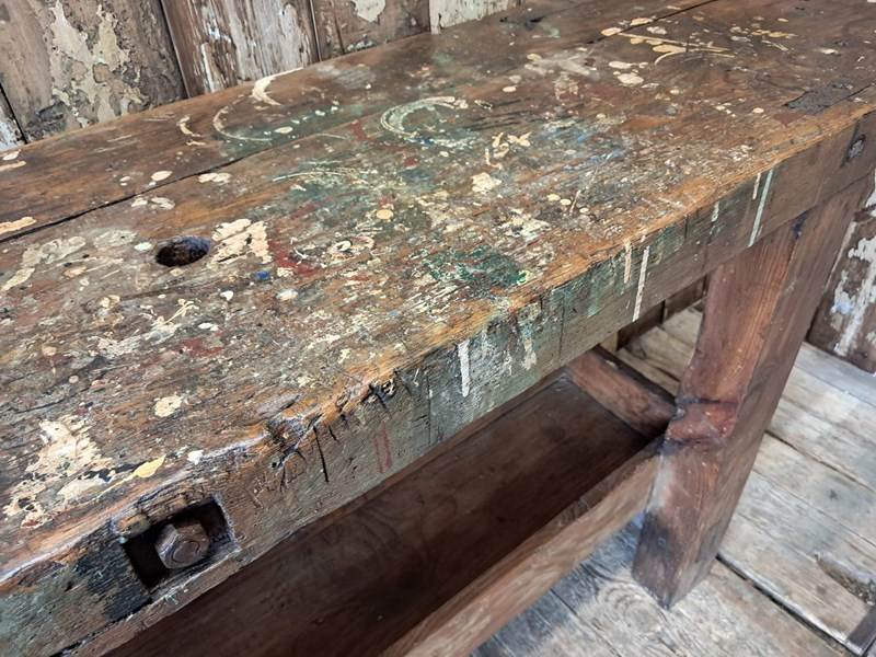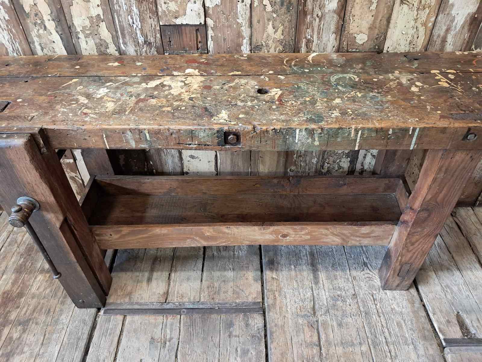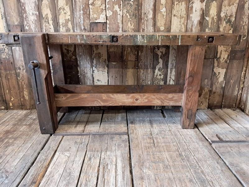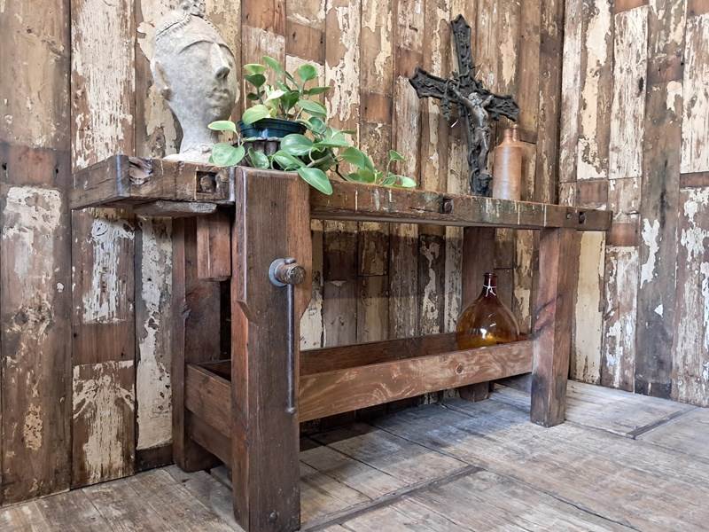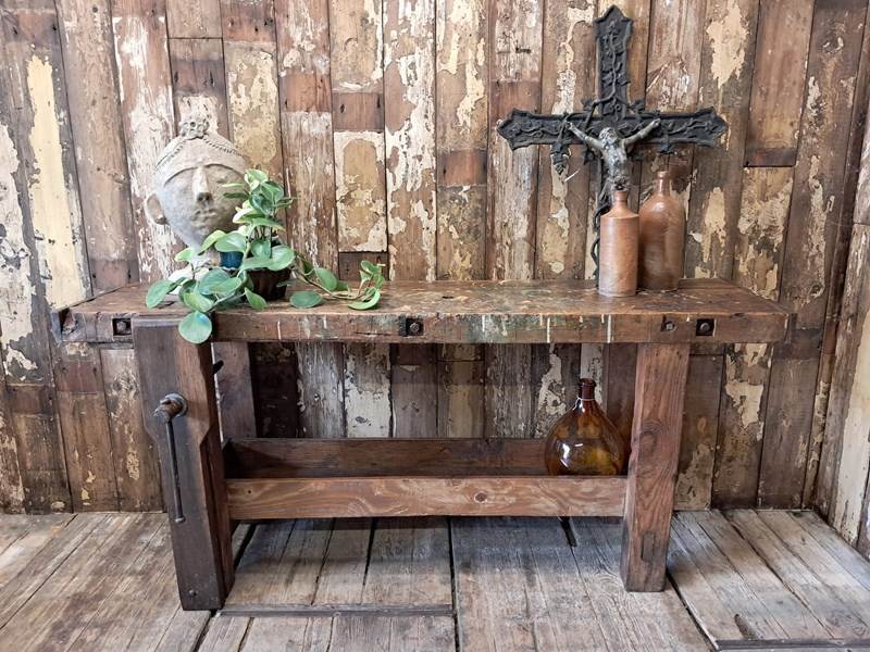 This 1930’s original carpenters bench has its original steel vice, and a large bottom display shelf giving ample storage capacity.