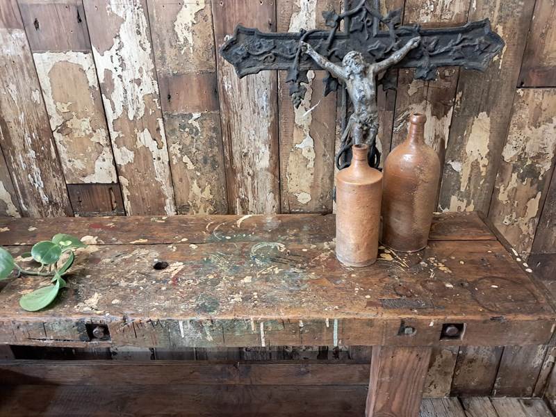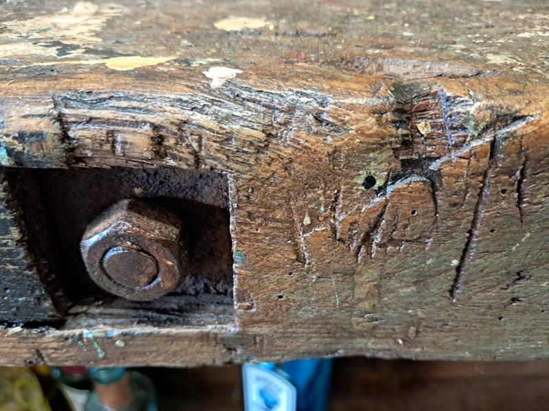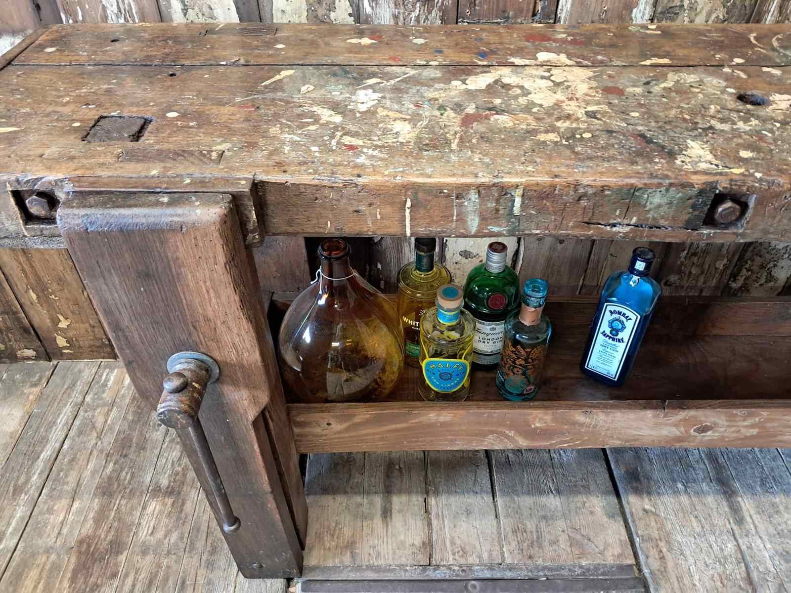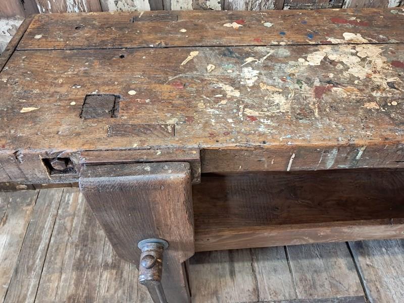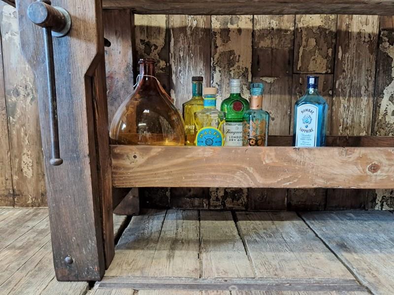 This 1930’s original carpenters bench has its original steel vice, and a large bottom display shelf giving ample storage capacity.