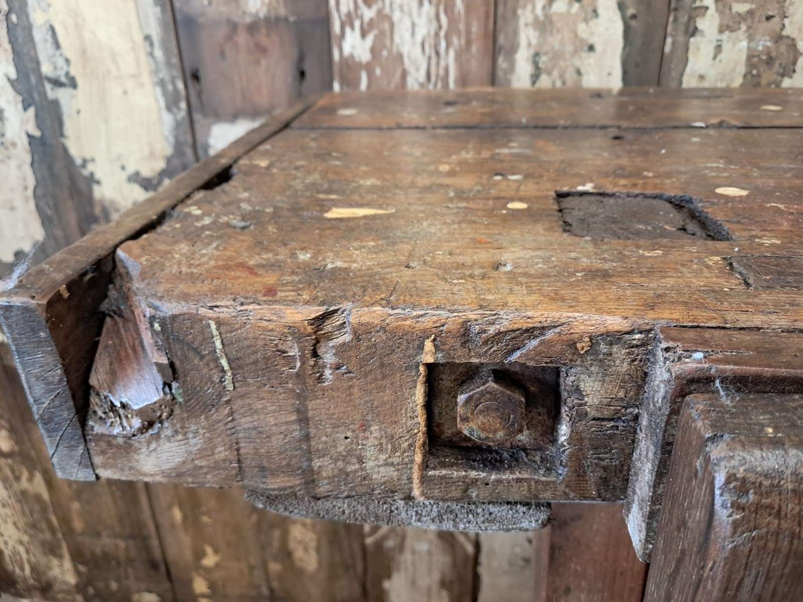 A lovely, perfectly crooked and gnarly piece, great in the kitchen as an island or as a console table or working/prep table.