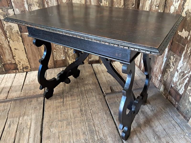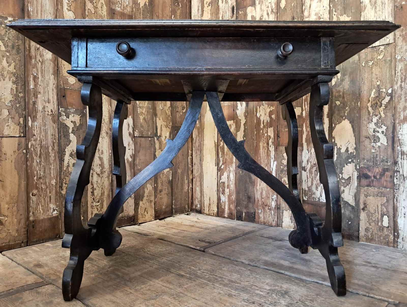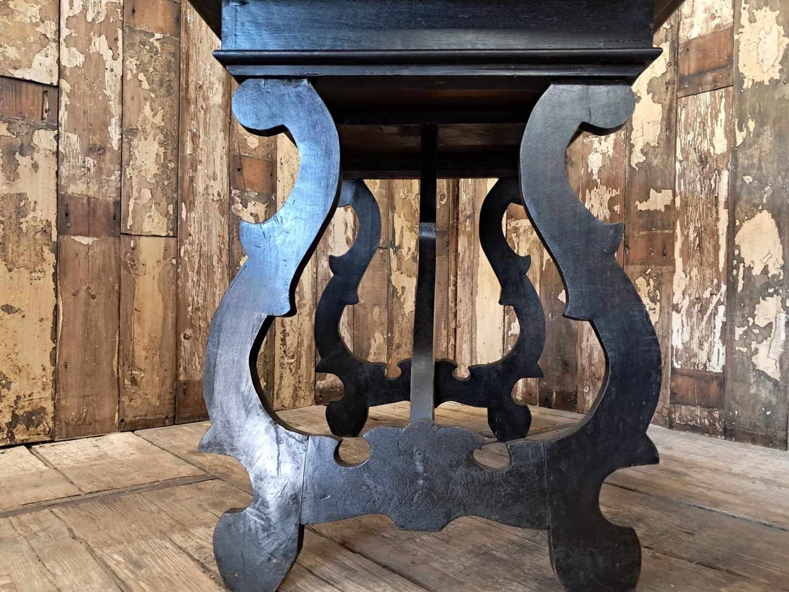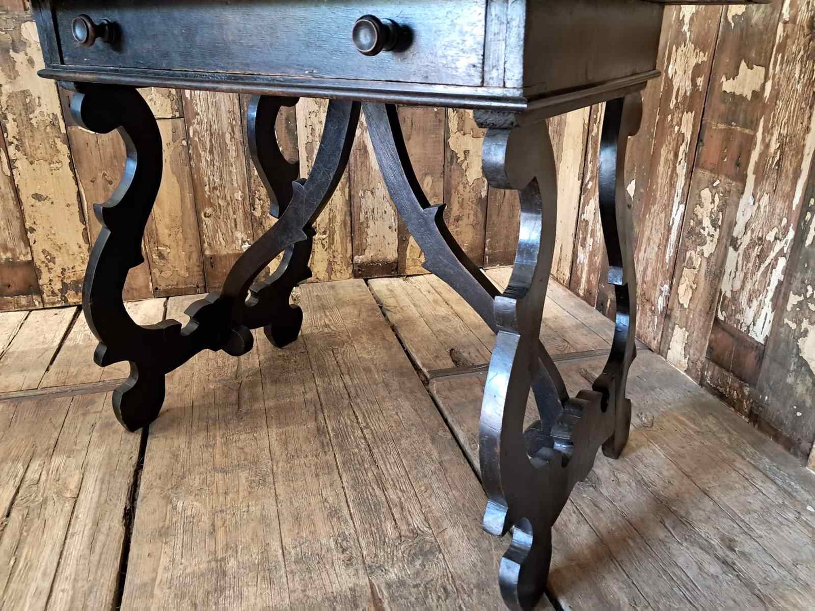 The hand-carved ornate open lyre-shaped legs are typical of tables from Northern Spain.