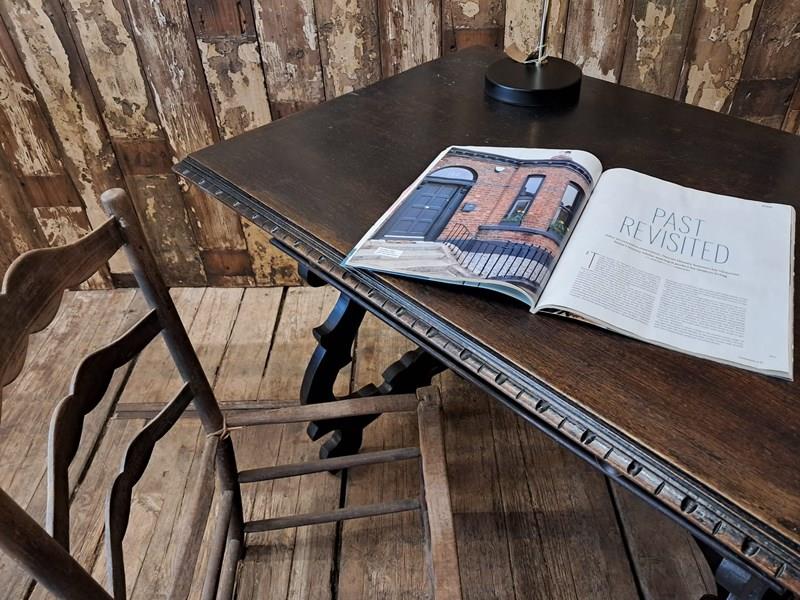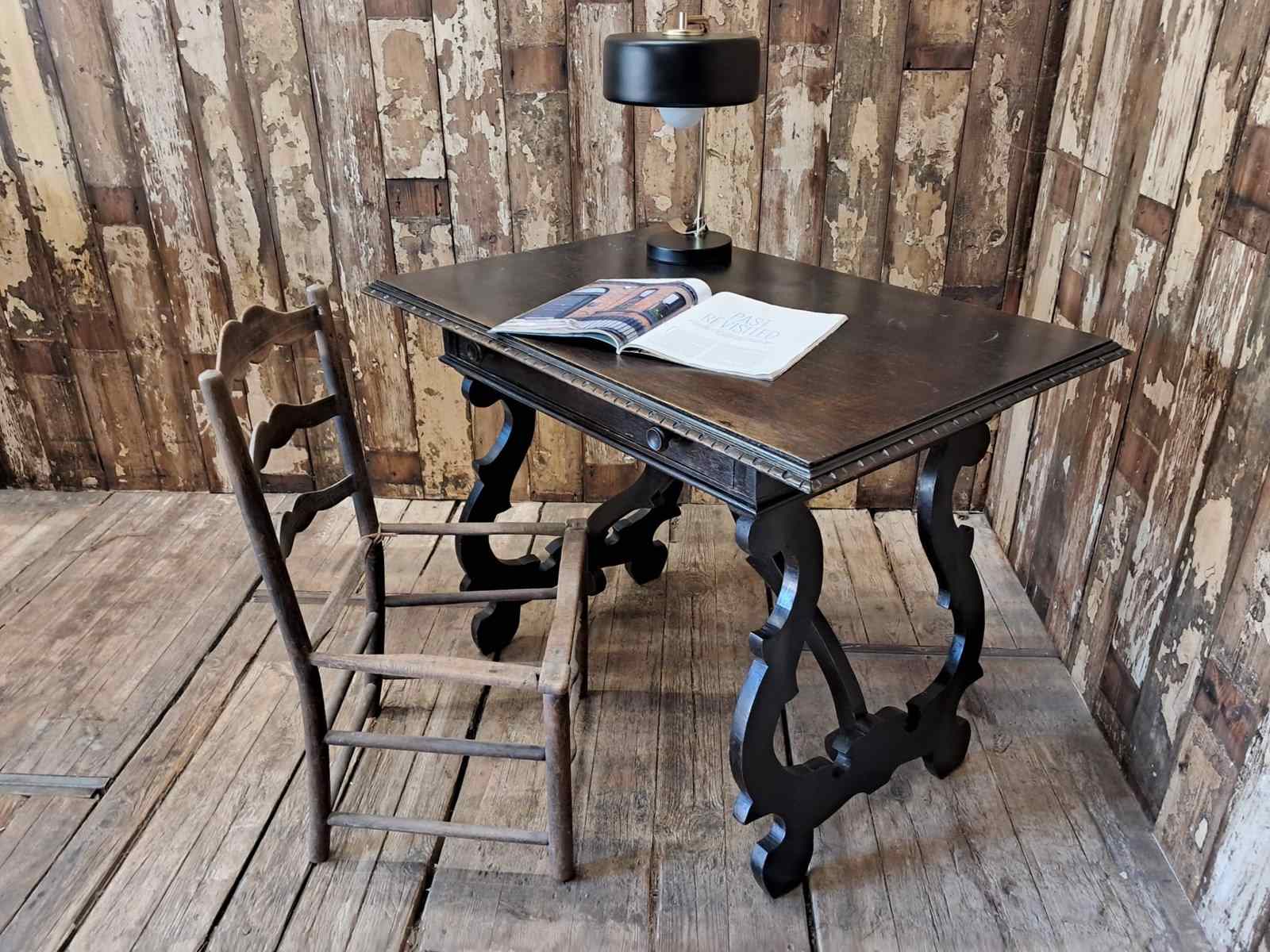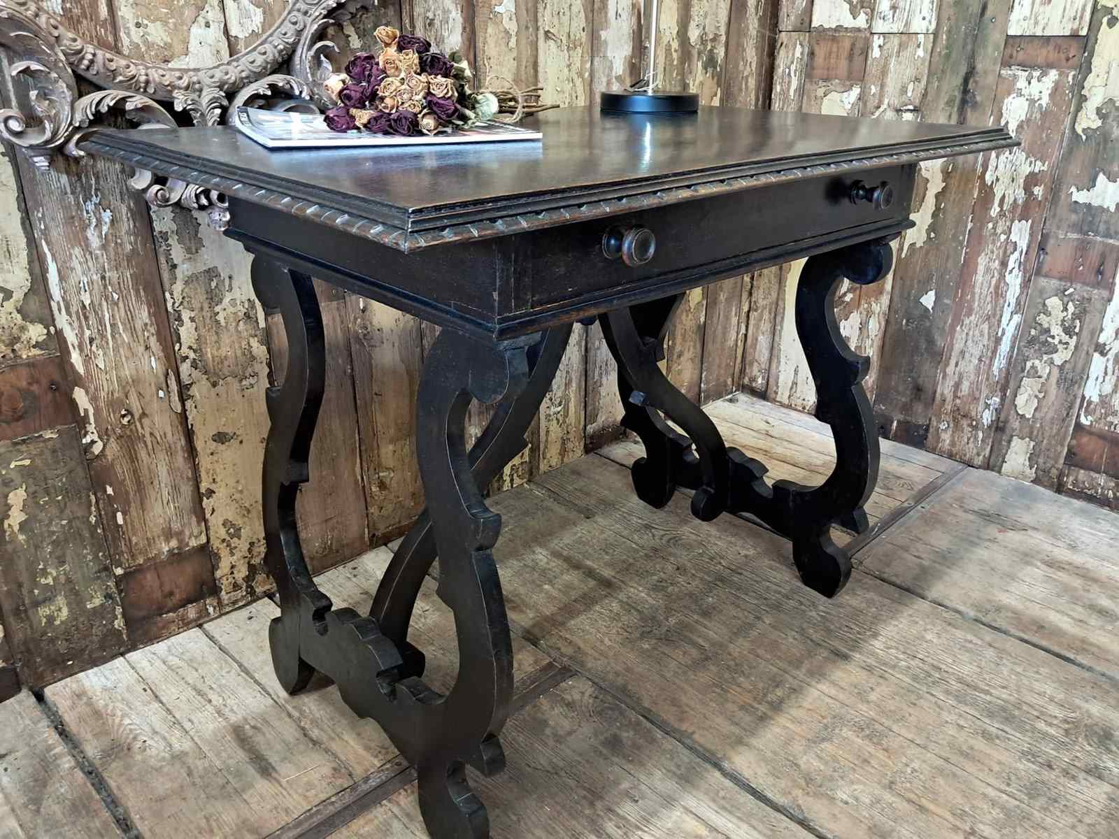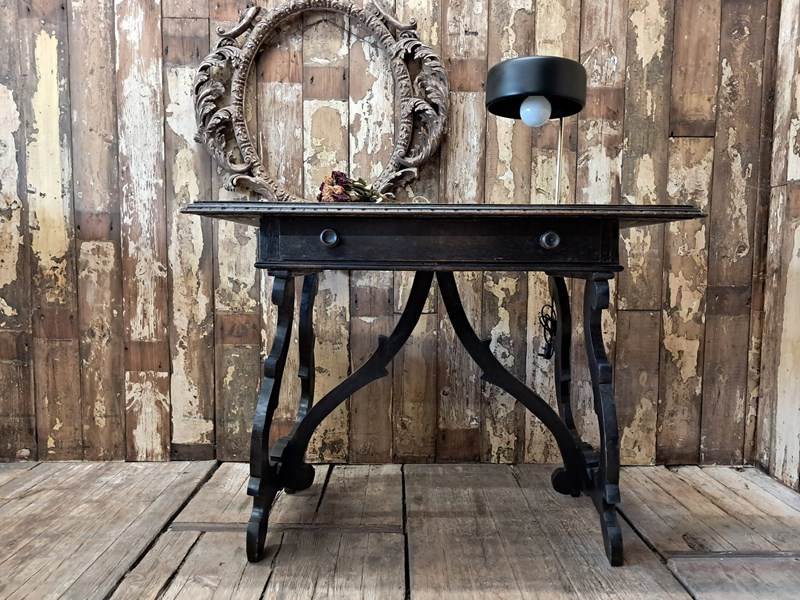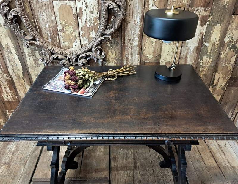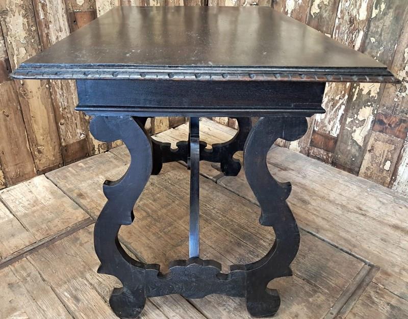 The hand-carved ornate open lyre-shaped legs are typical of tables from Northern Spain.