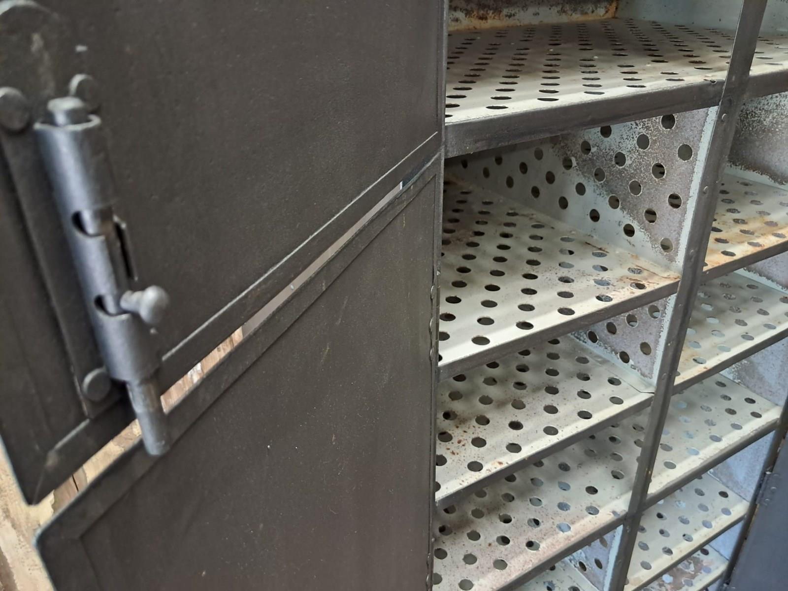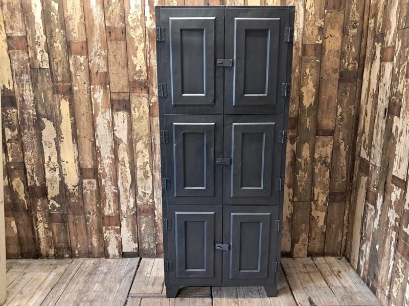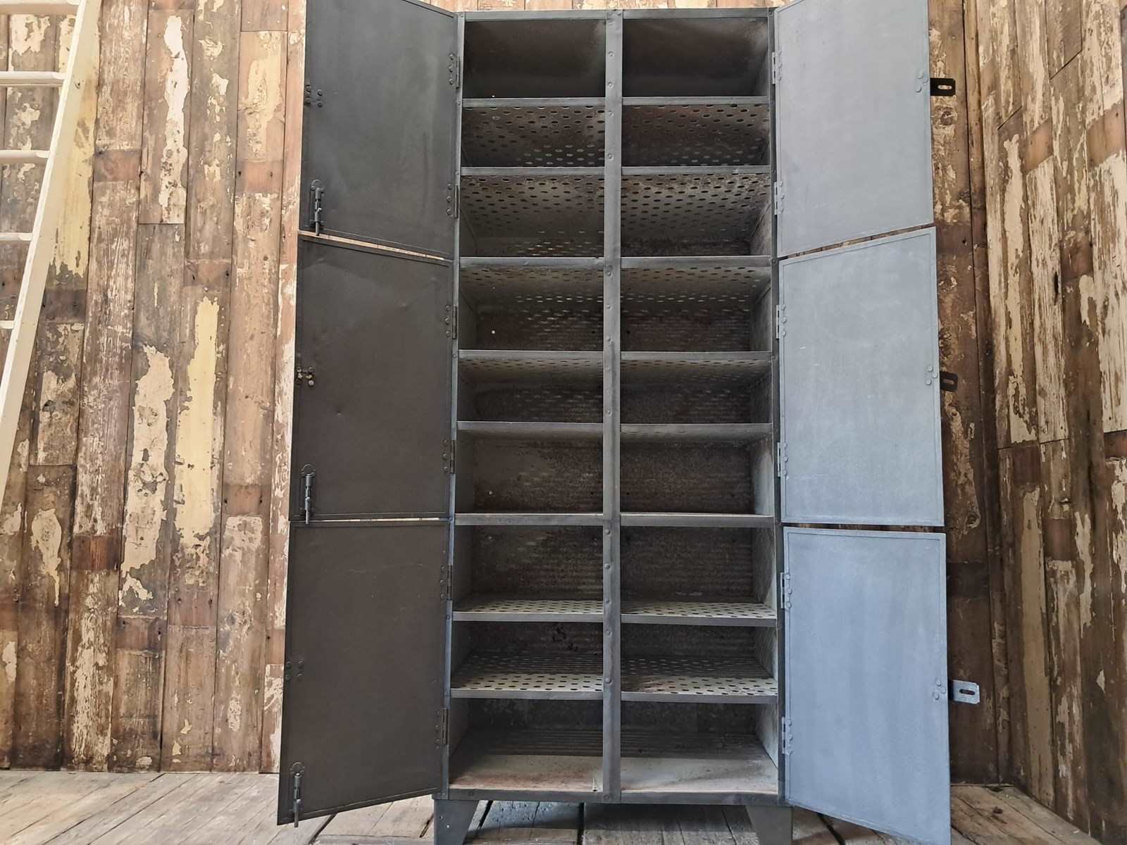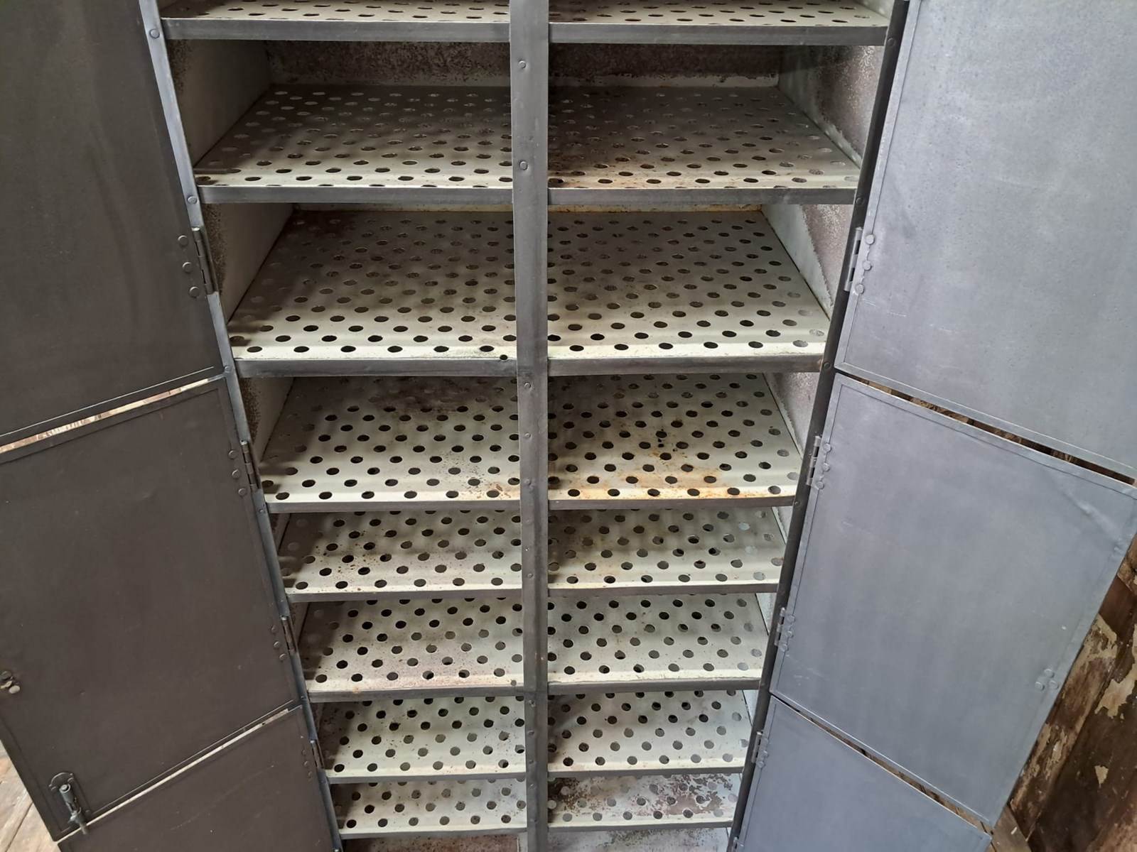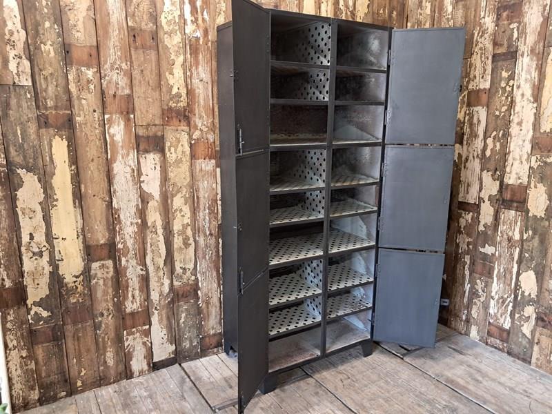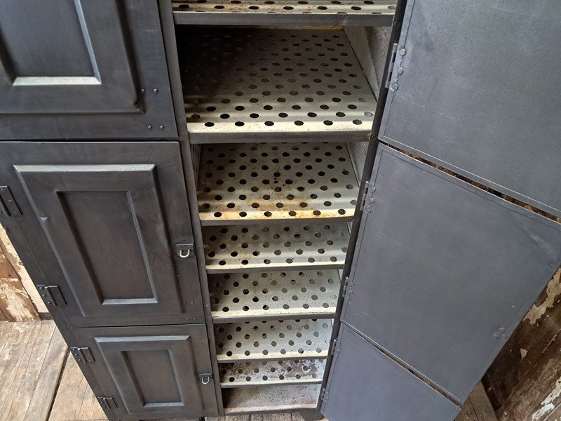 There are 3 doors per side with latches but no padlocks and 8 perforated shelves per side with a solid central divide.