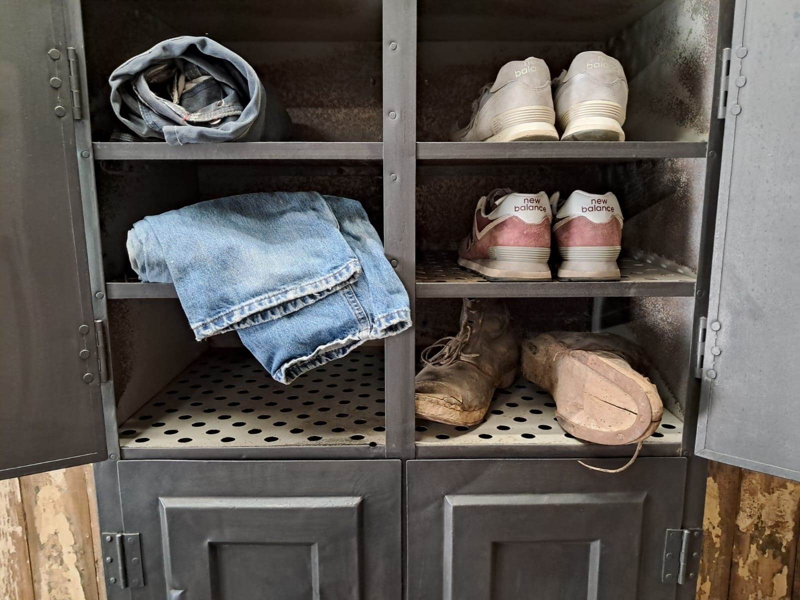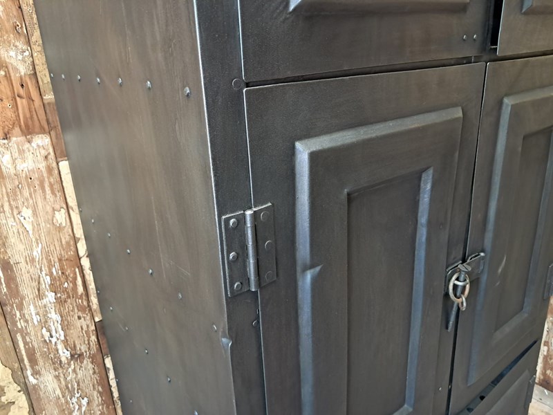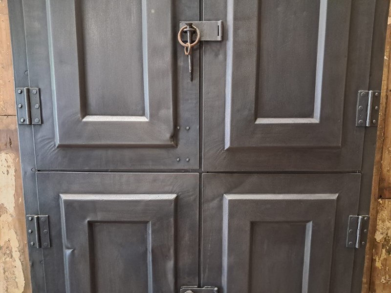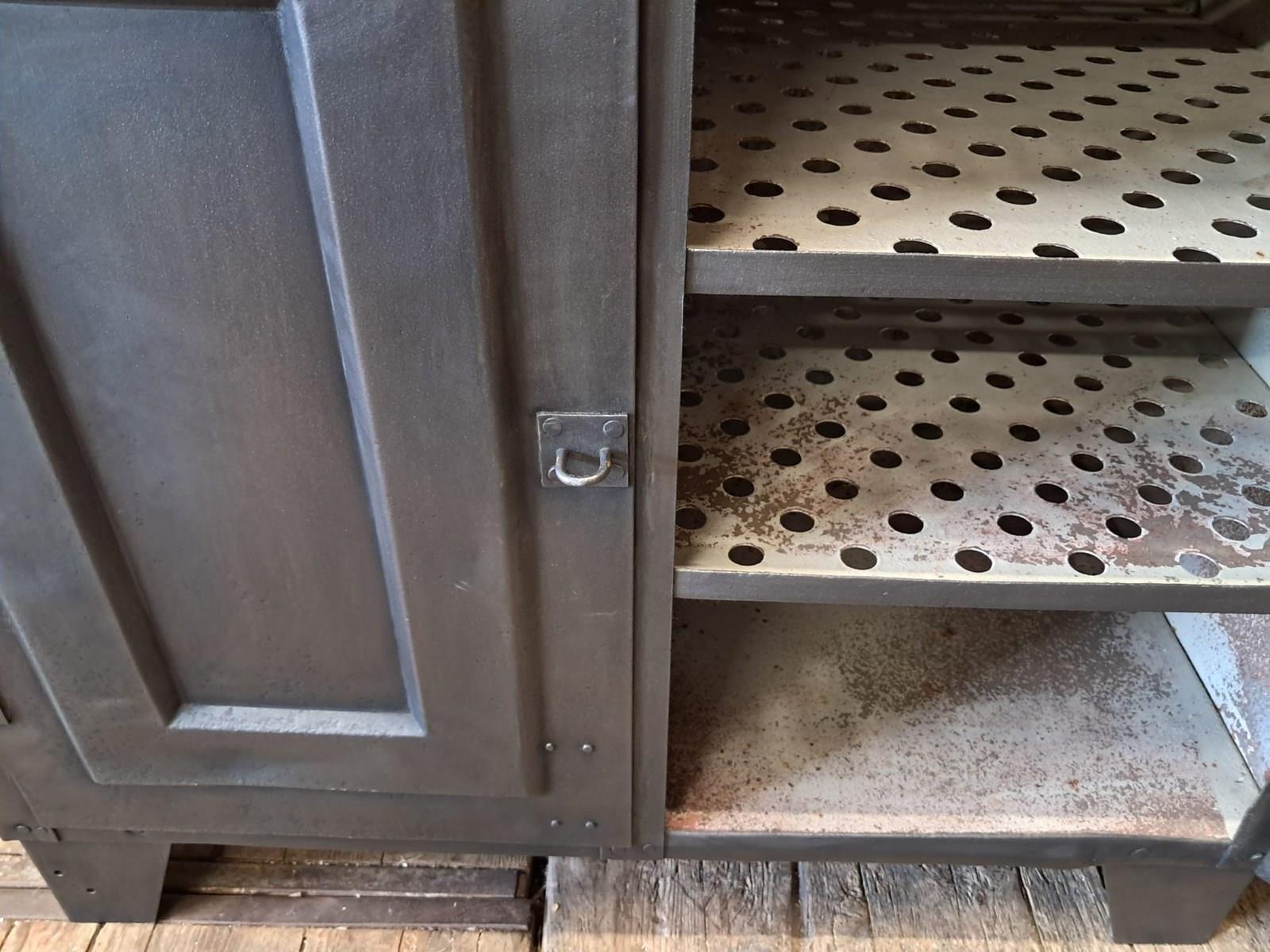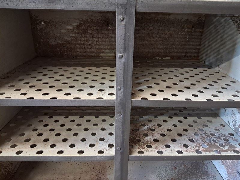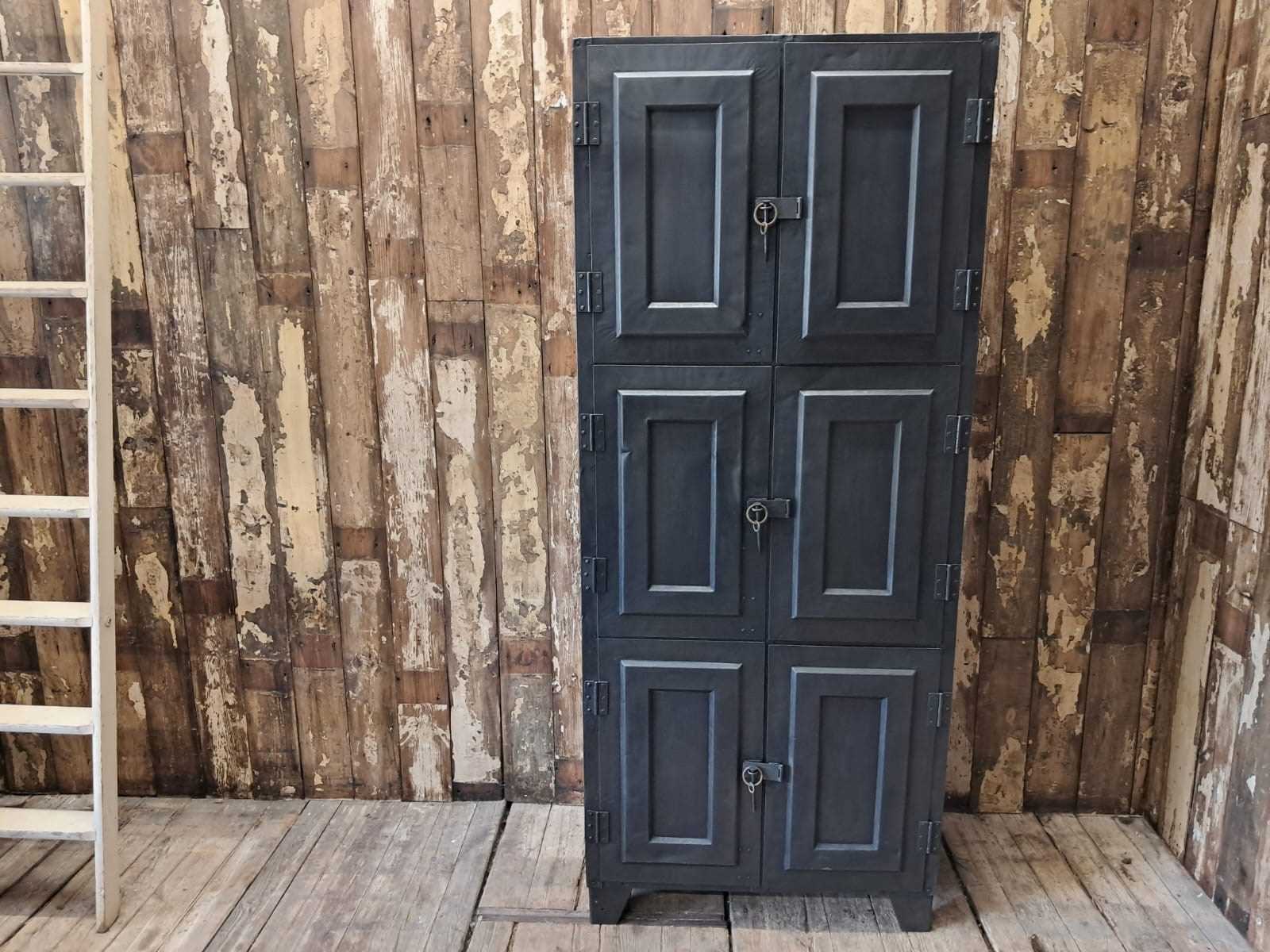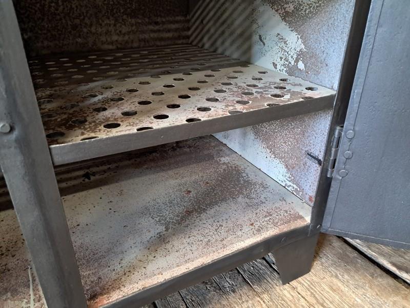 There are 3 doors per side with latches but no padlocks and 8 perforated shelves per side with a solid central divide.