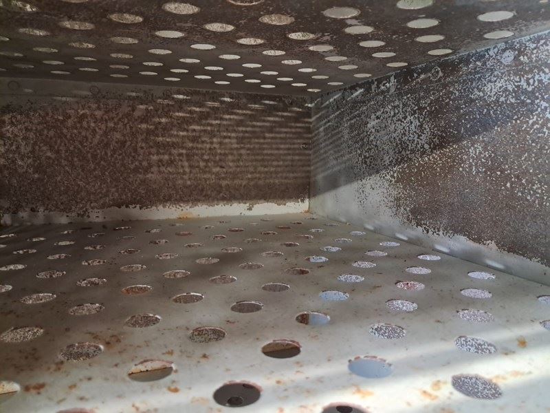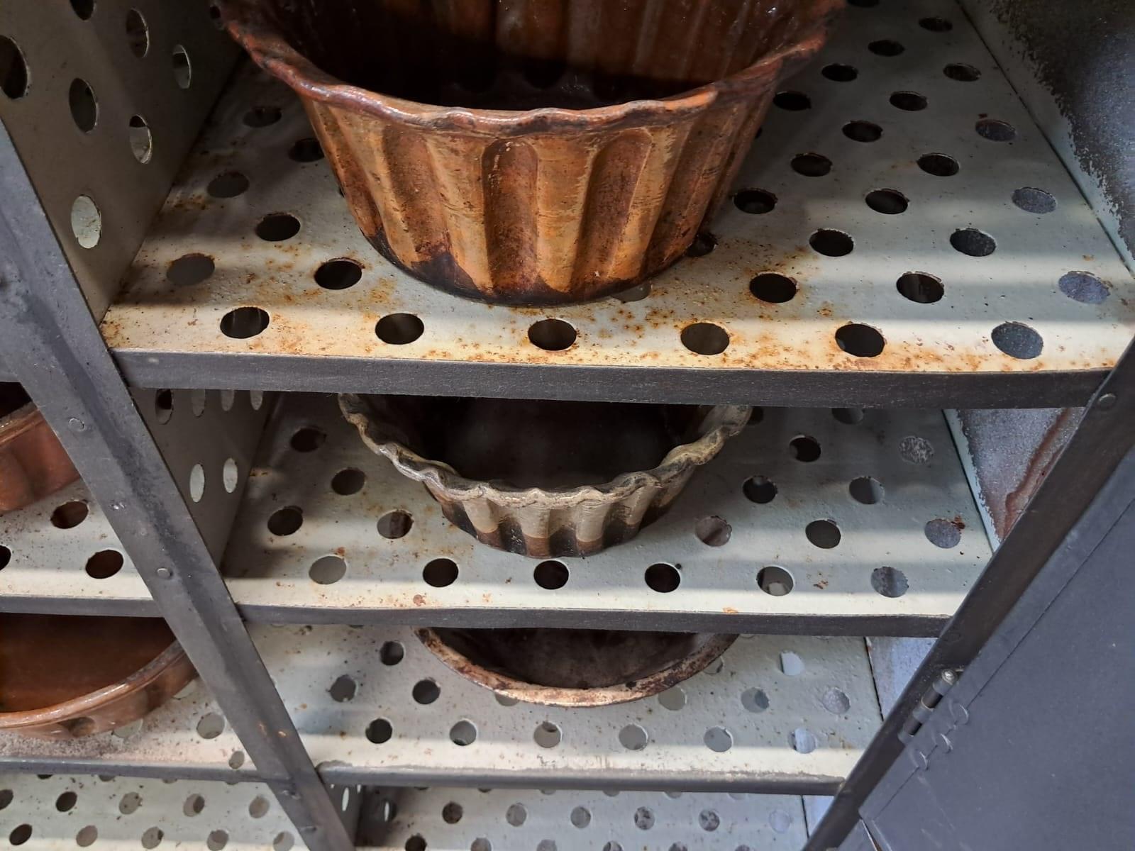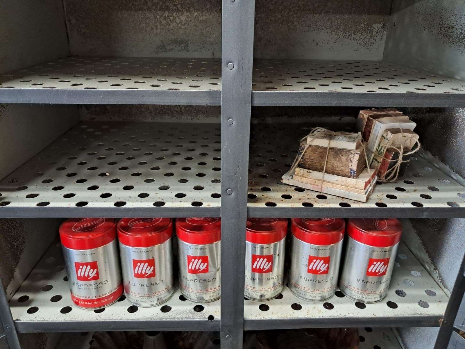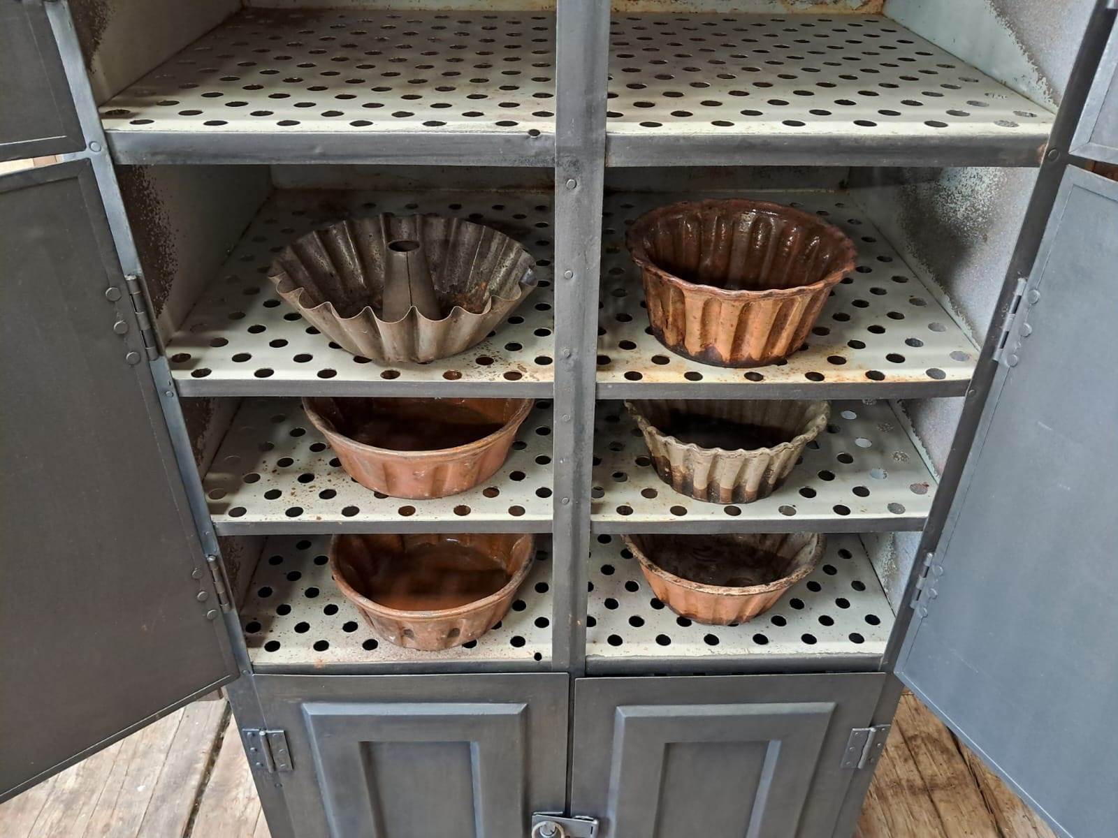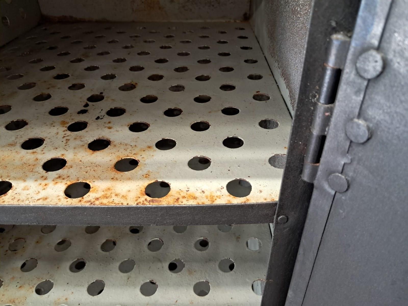 There are 3 doors per side with latches but no padlocks and 8 perforated shelves per side with a solid central divide.