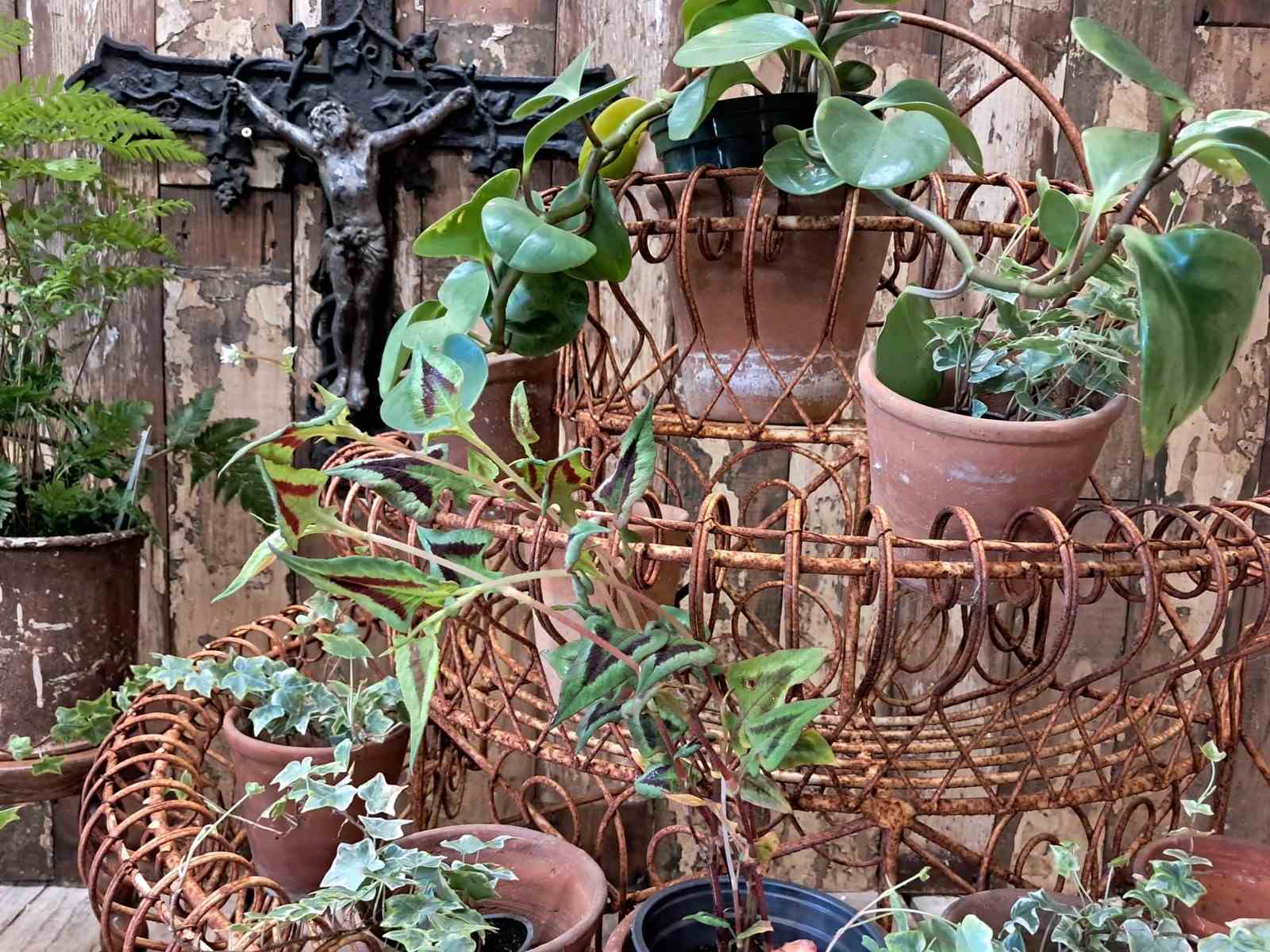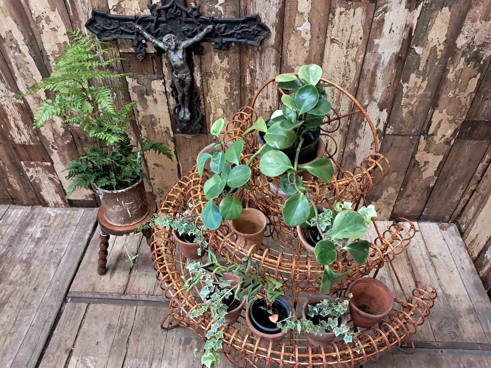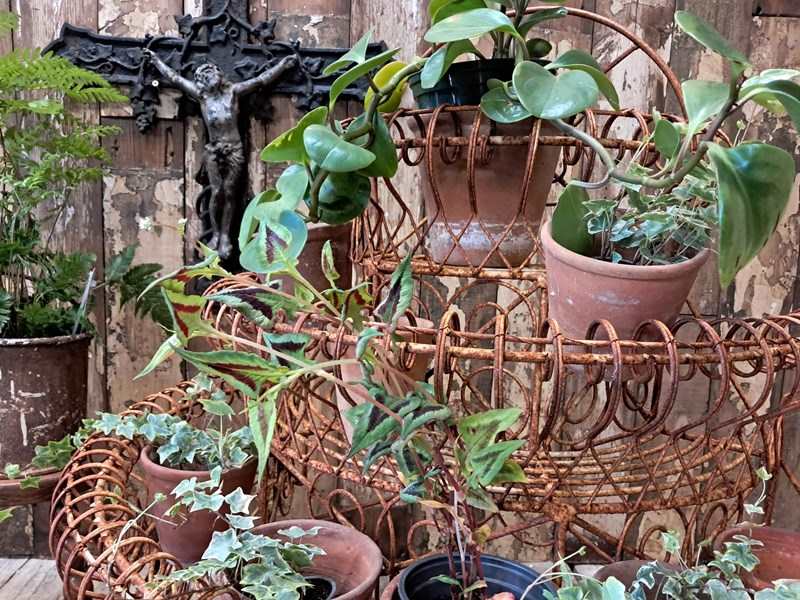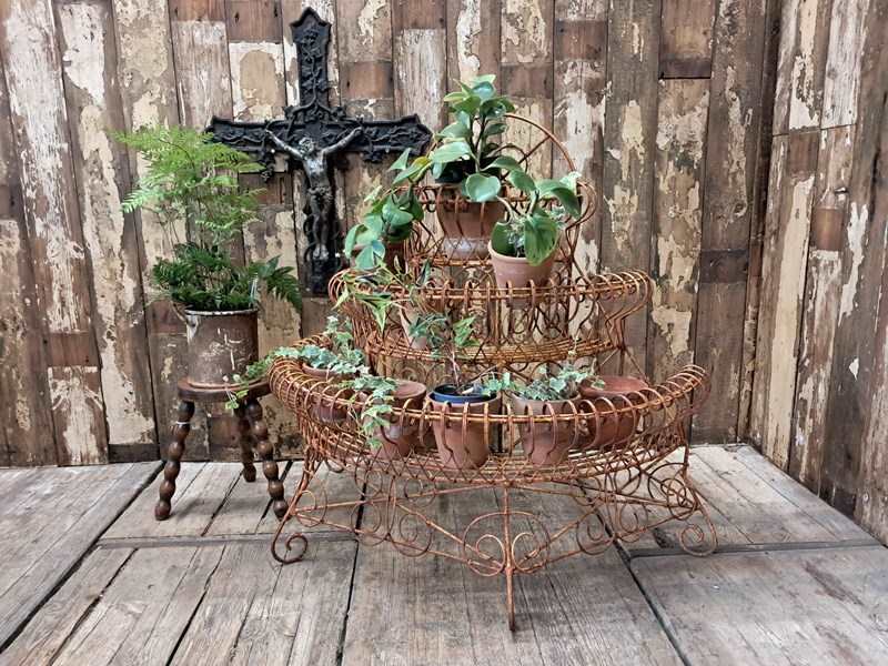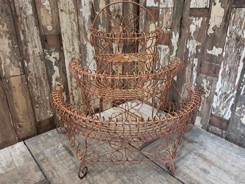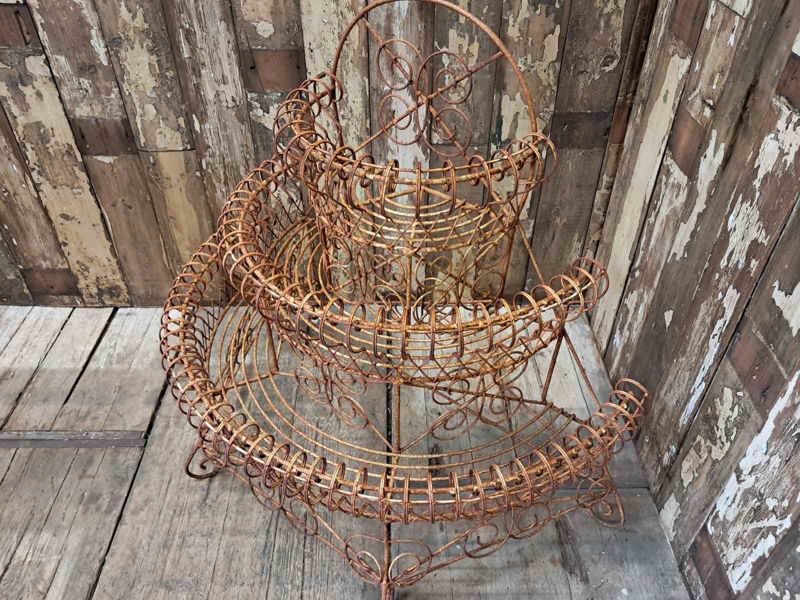 Stunning Victorian metal 3 tier etagere, with wonderful ornate swirling in a well worn cream finish. A top quality, heavy duty piece - the perfect statement piece for any garden or courtyard. H 95 x W 100 x D 55 cm