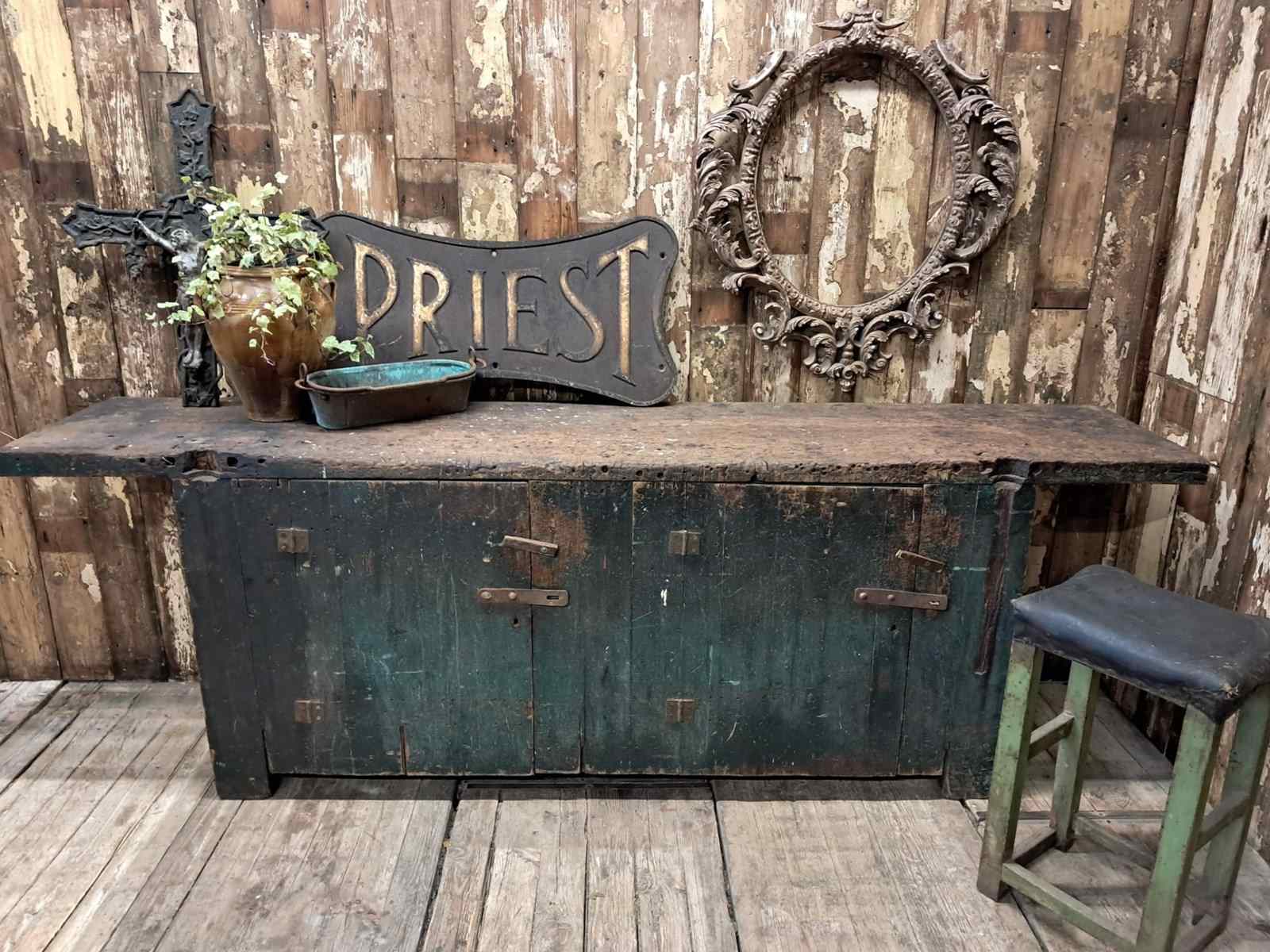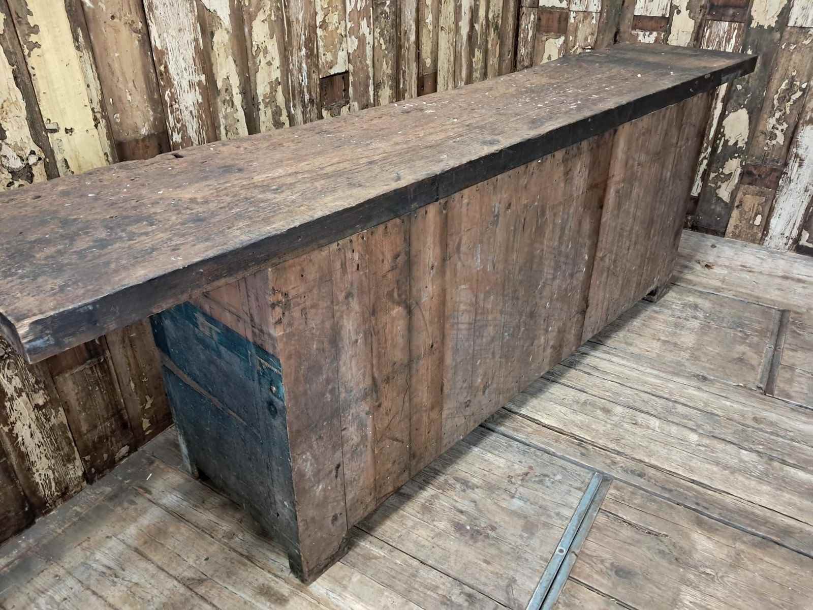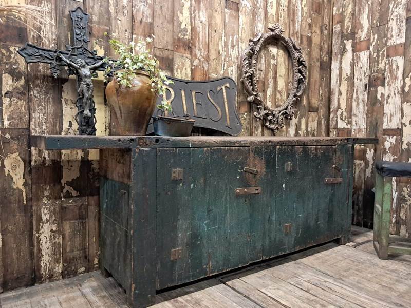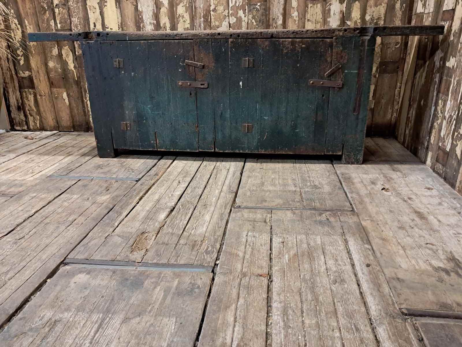 An authentic French piece with its original blue paint, beautifully worn, battered and weathered.