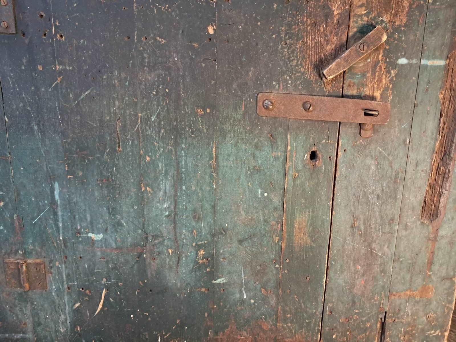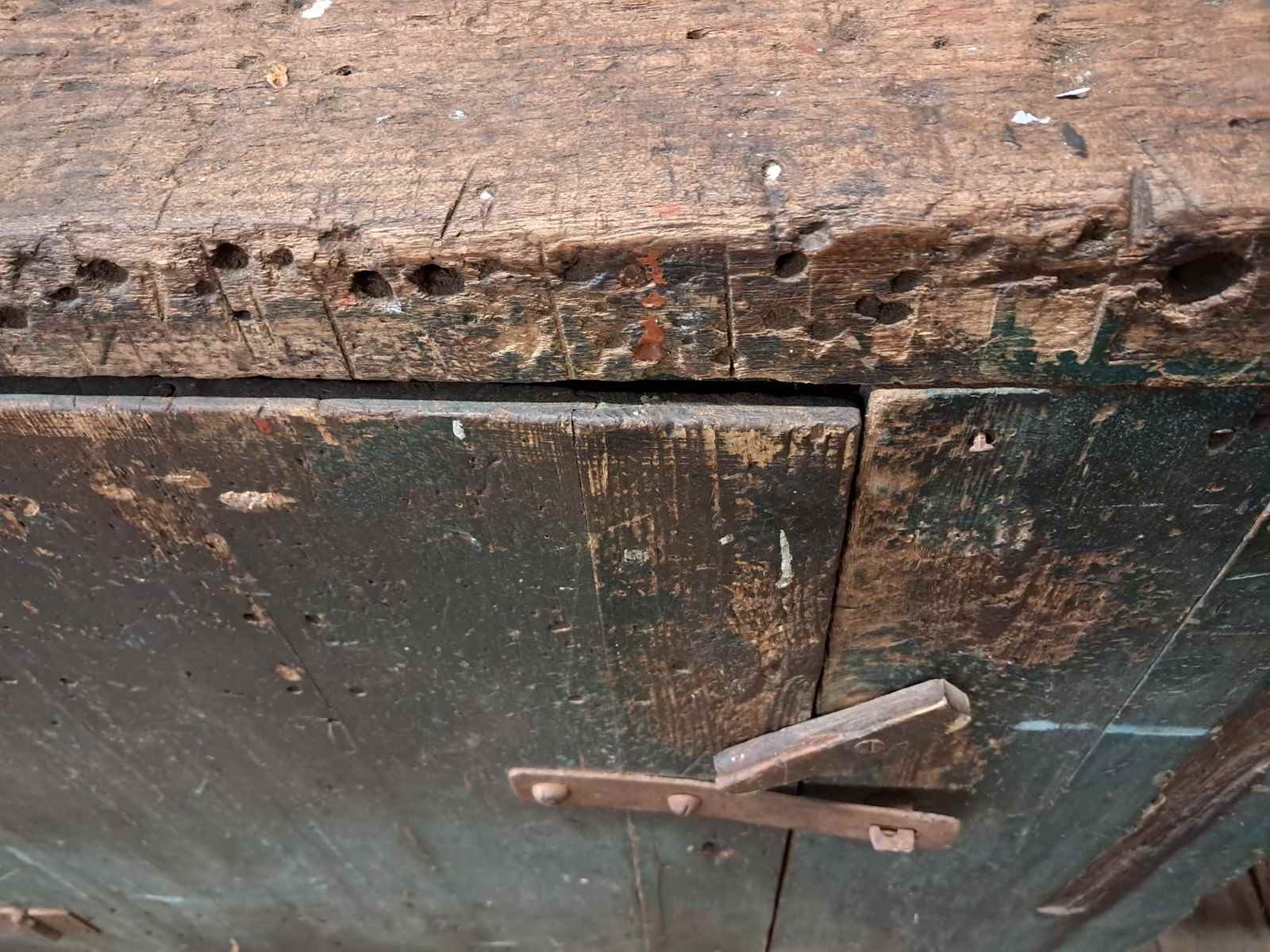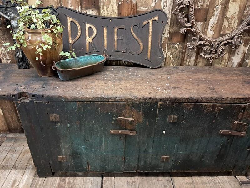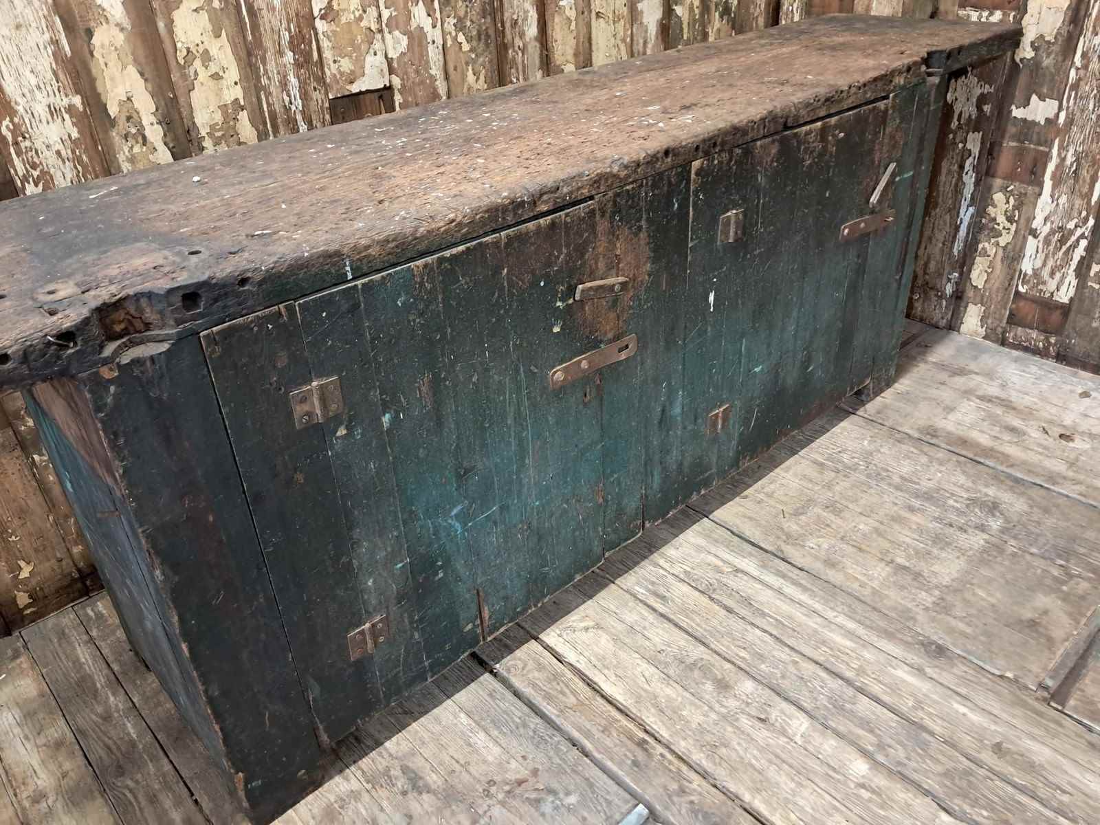 An authentic French piece with its original blue paint, beautifully worn, battered and weathered.