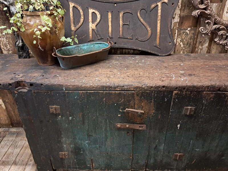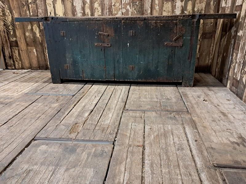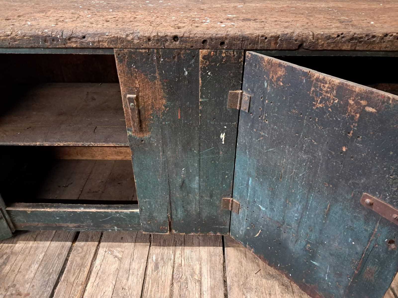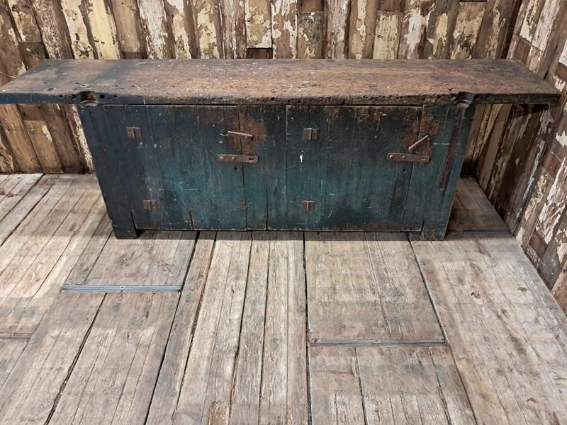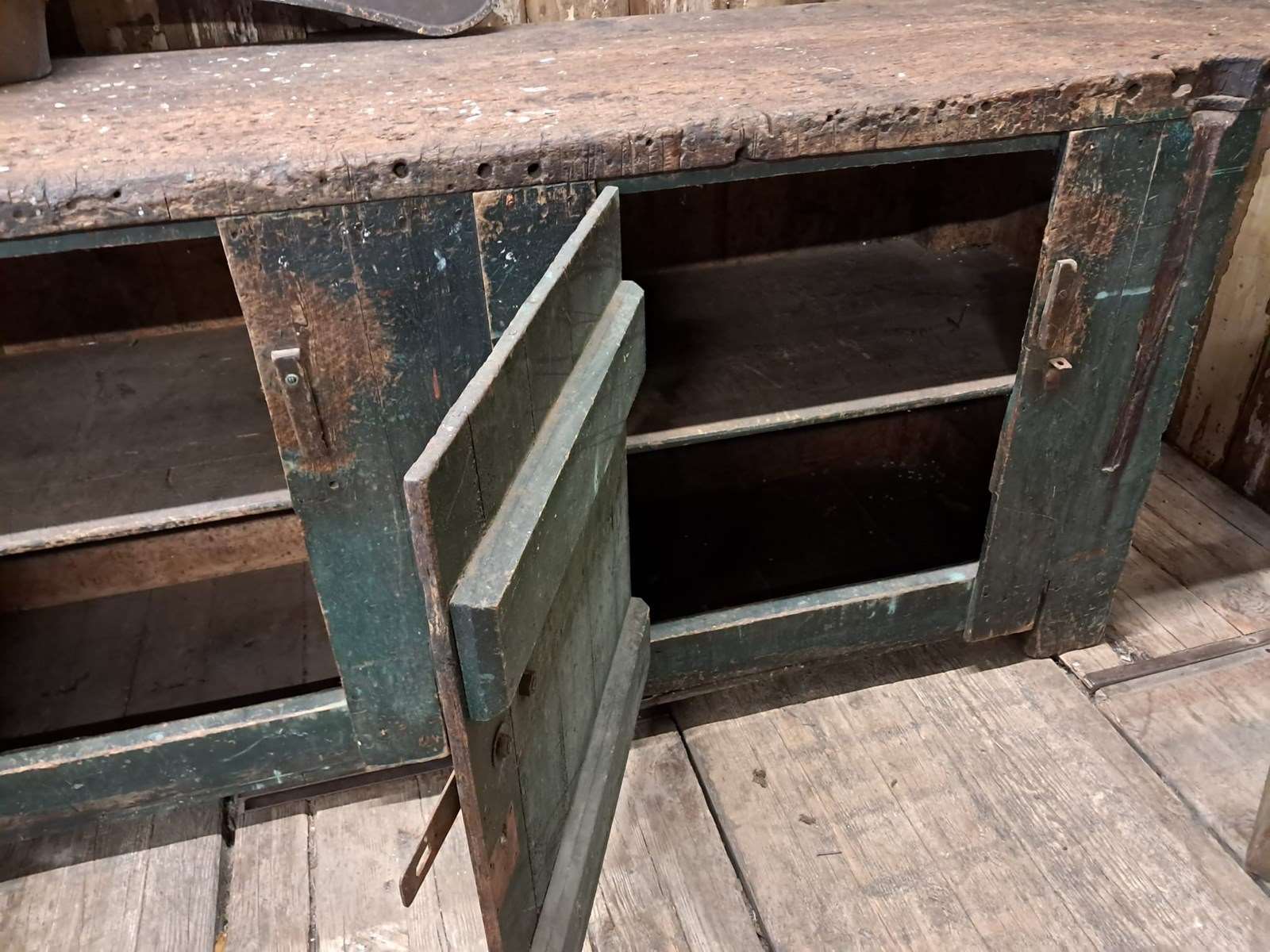 Robust gnarly worktop with generous overhang to one end and two large cupboards both with a shelf.