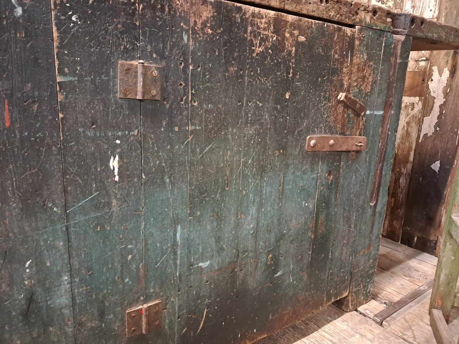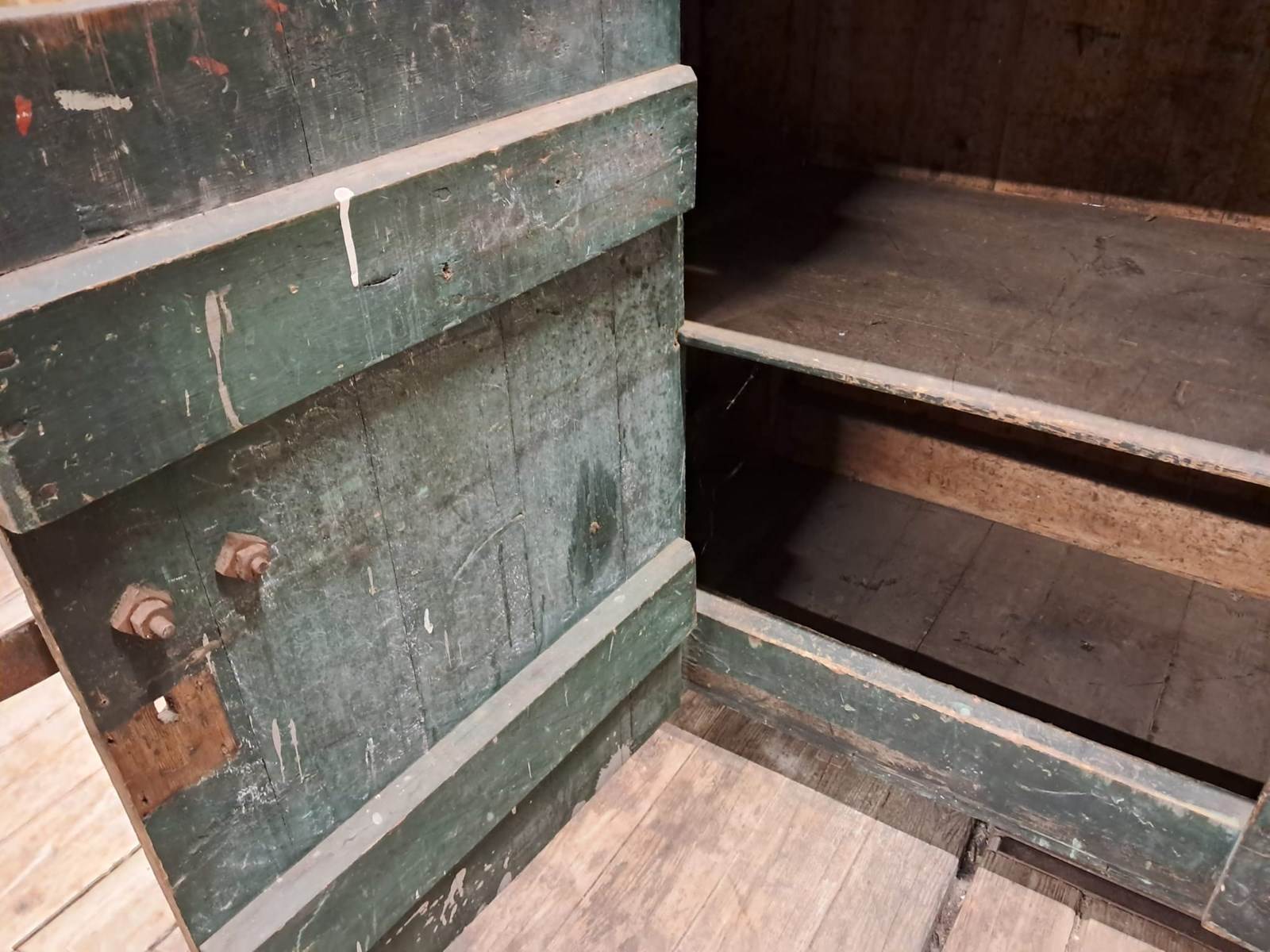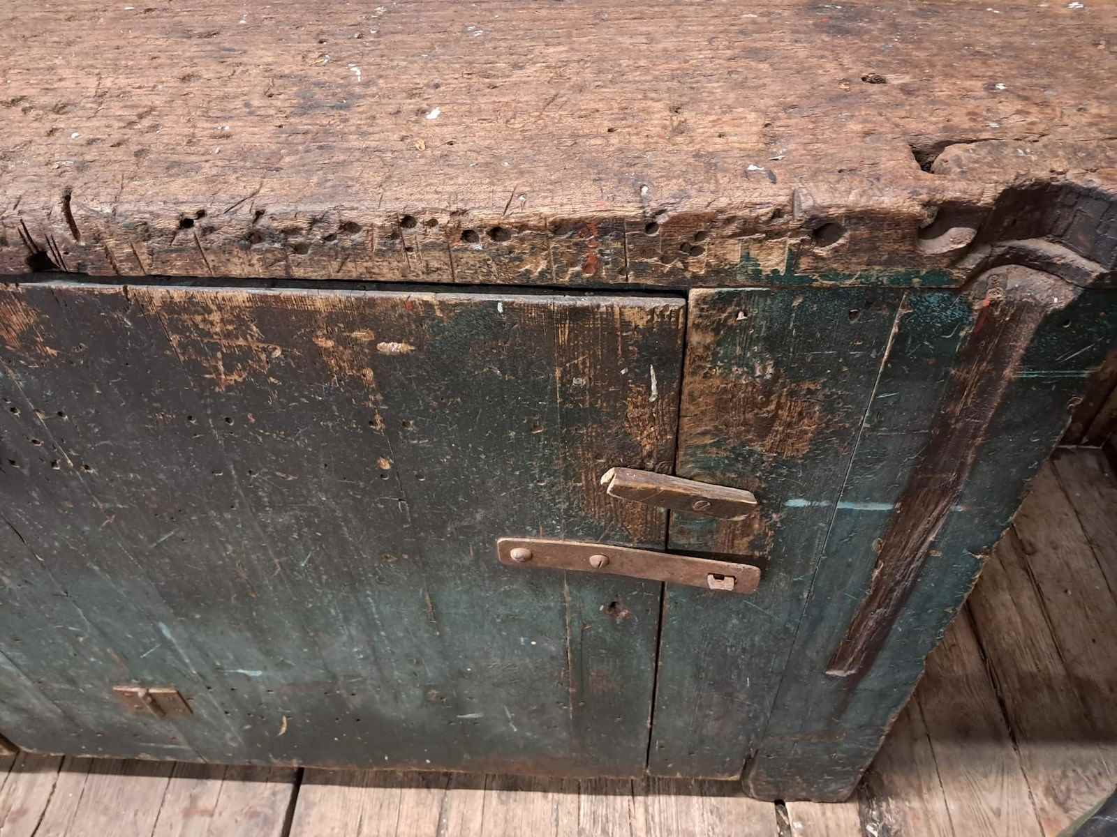 Robust gnarly worktop with generous overhang to one end and two large cupboards both with a shelf.