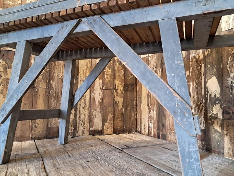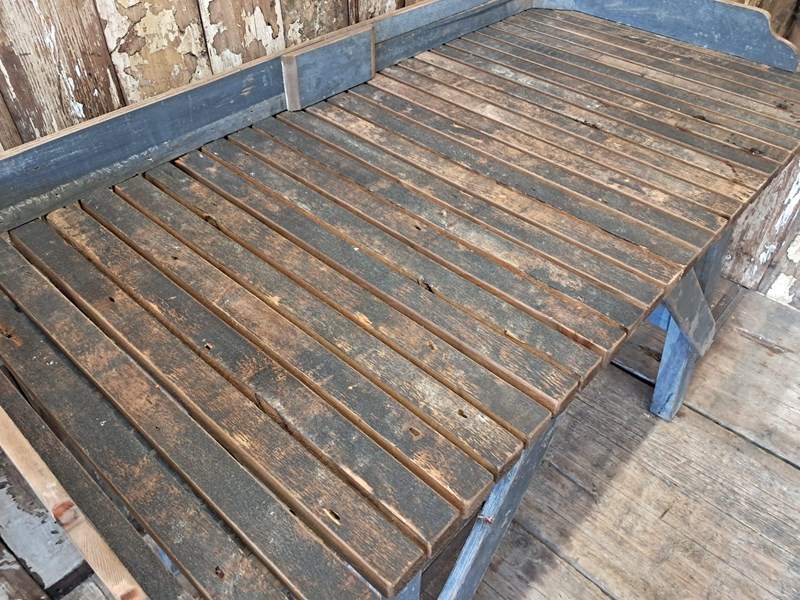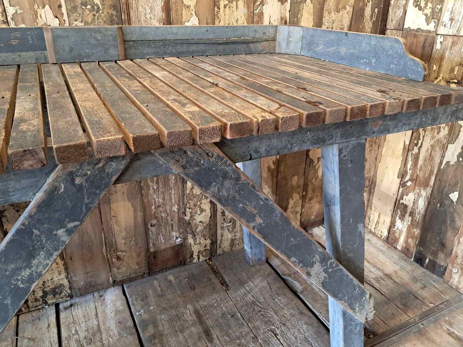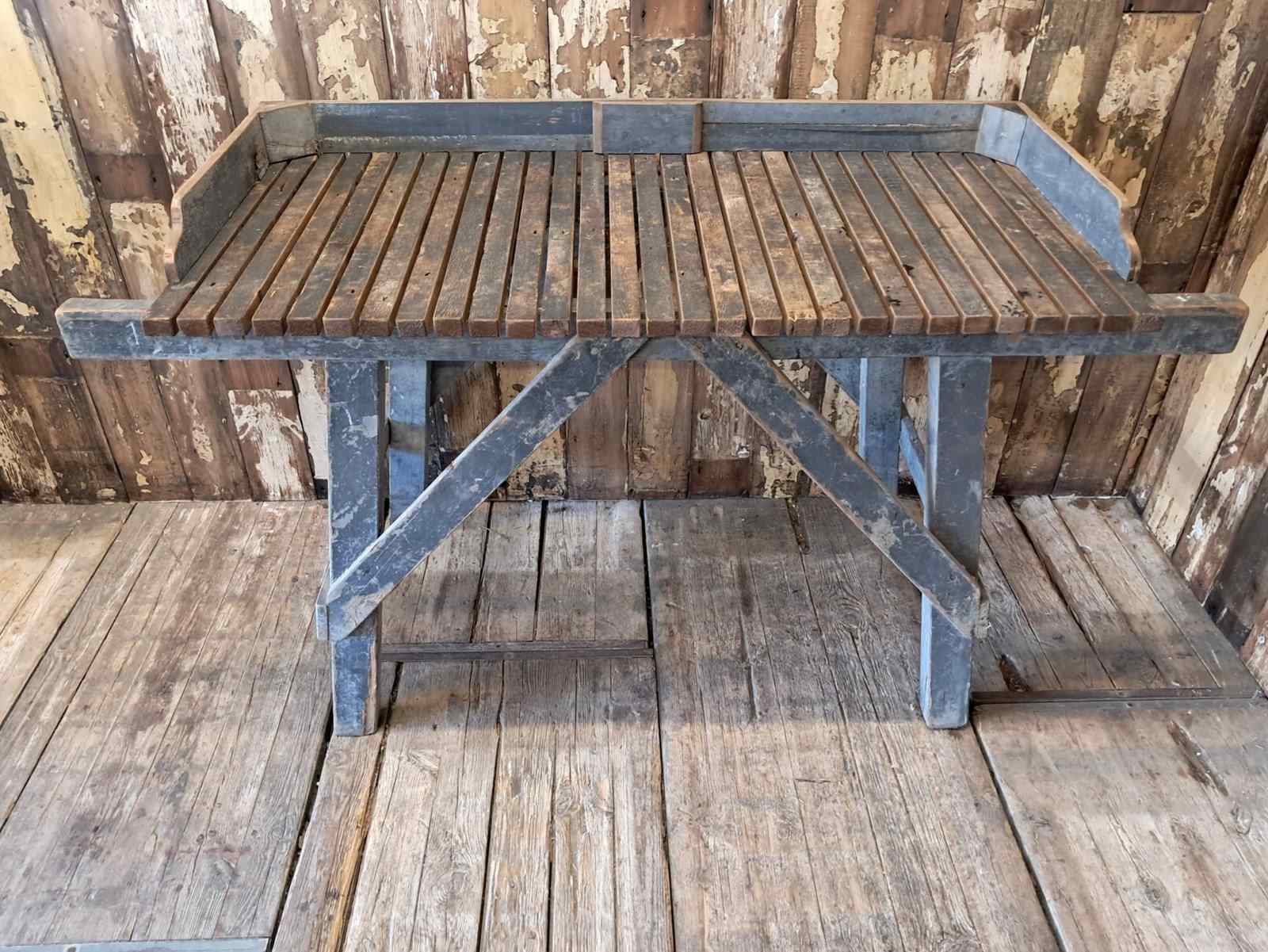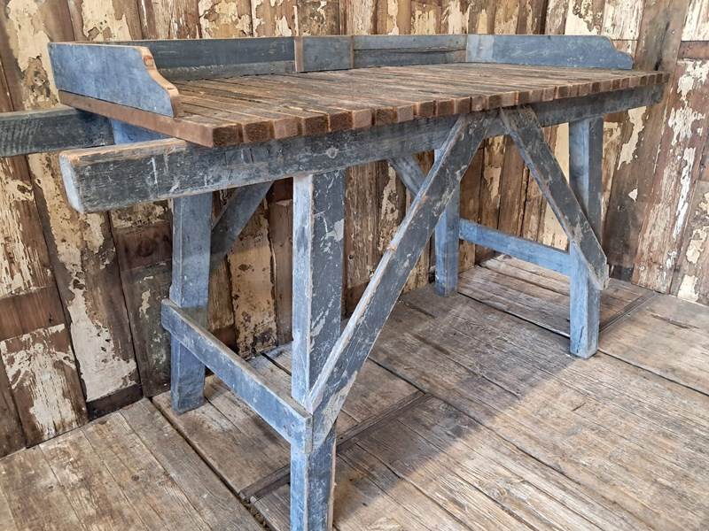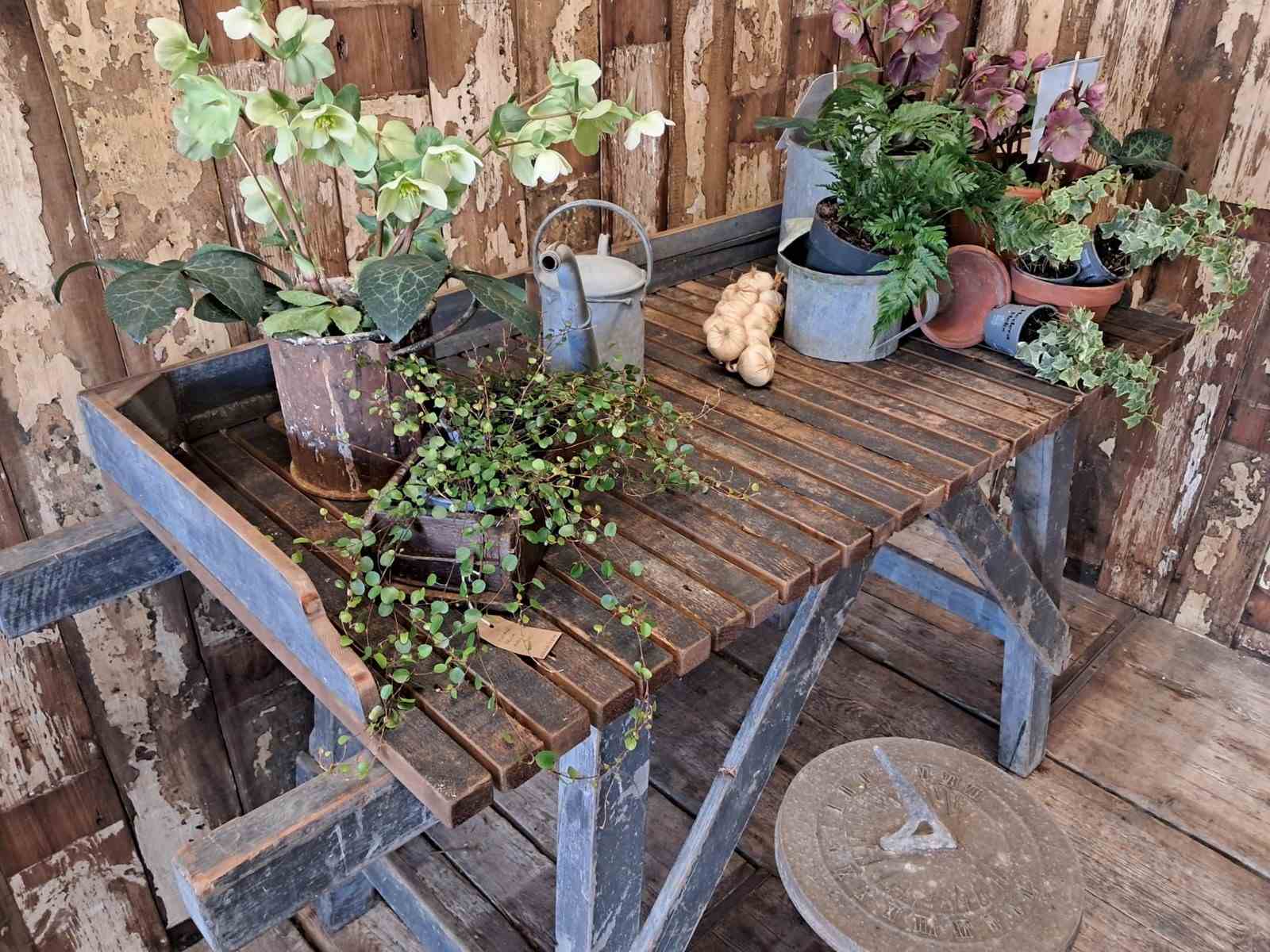 A Victorian potting table with blue frame and natural slatted wood top.
