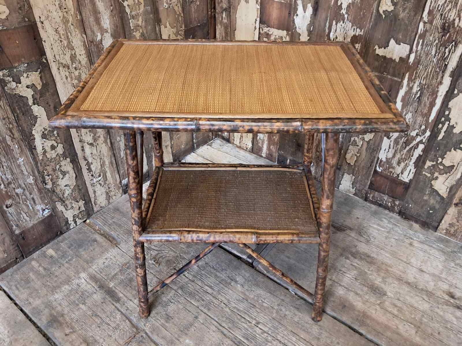A simple, understated late Victorian bamboo occasional table of rectangular form raised on gently splayed legs with a lower tier and reinforced with typical decorative cross braces.
