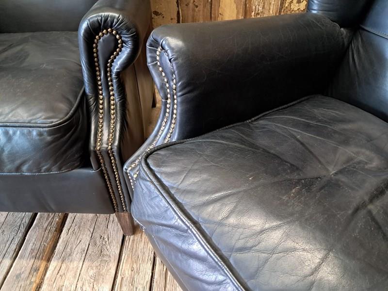 Sumptuous, premium, perfectly worn black leather, with immaculate brass studwork to the scroll arms and back, with dark solid wood feet.